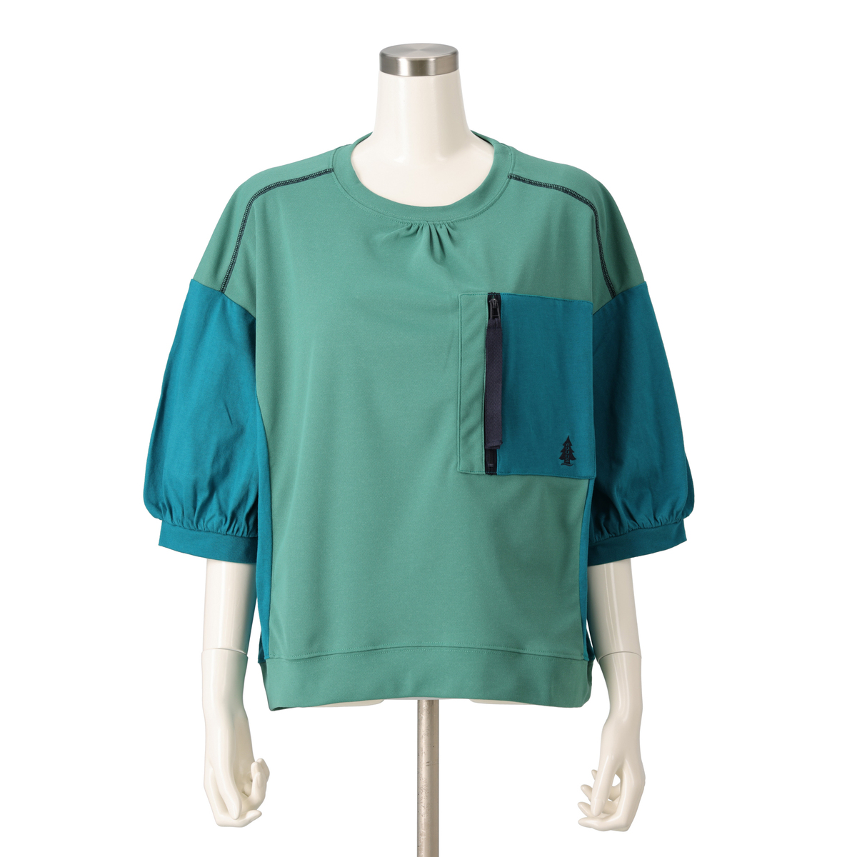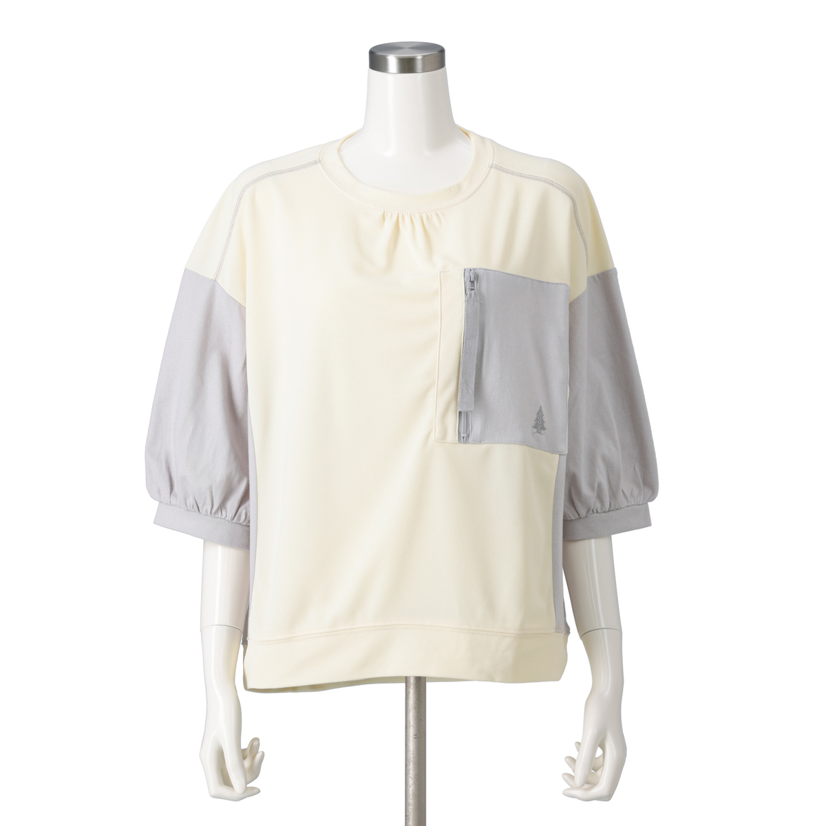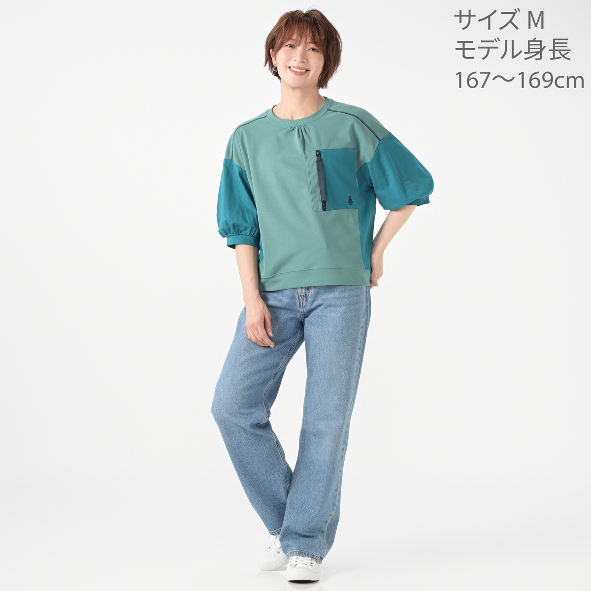 1枚でコーデが決まる、ツートンカラーのプルオーバー。二の腕や肘周りをカバーする5分丈袖で、季節の変わり目にも活躍します