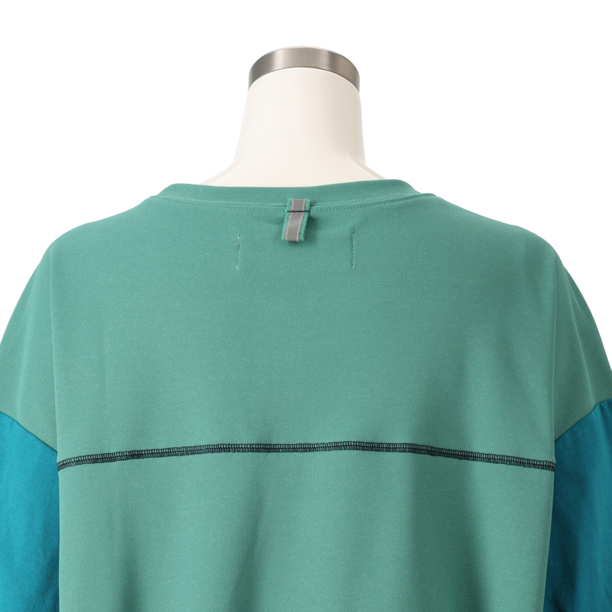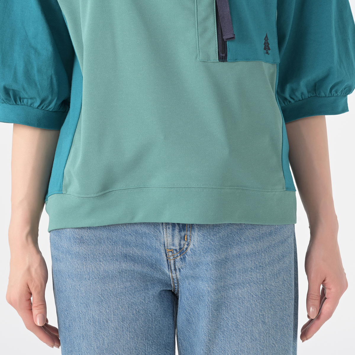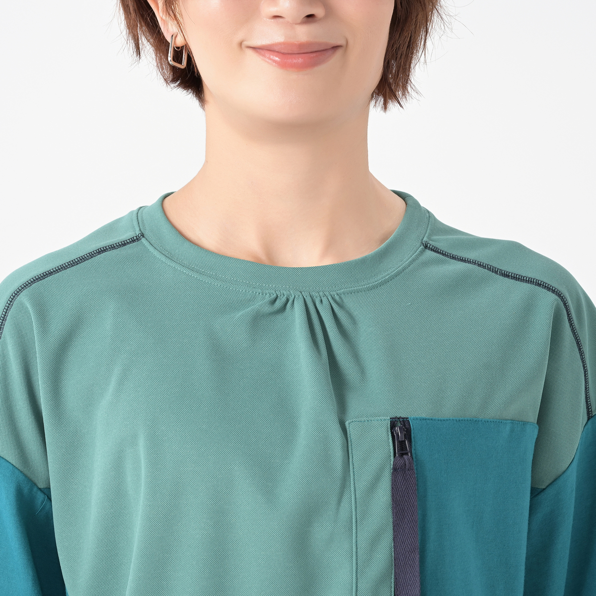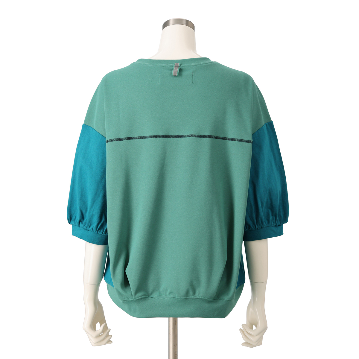 1枚でコーデが決まる、ツートンカラーのプルオーバー。二の腕や肘周りをカバーする5分丈袖で、季節の変わり目にも活躍します