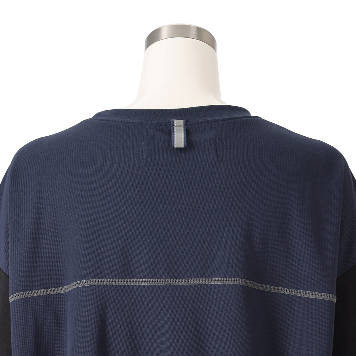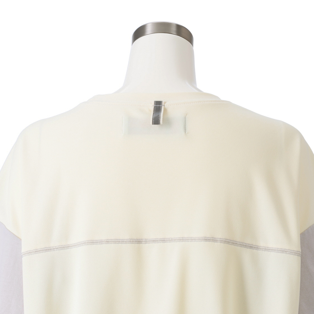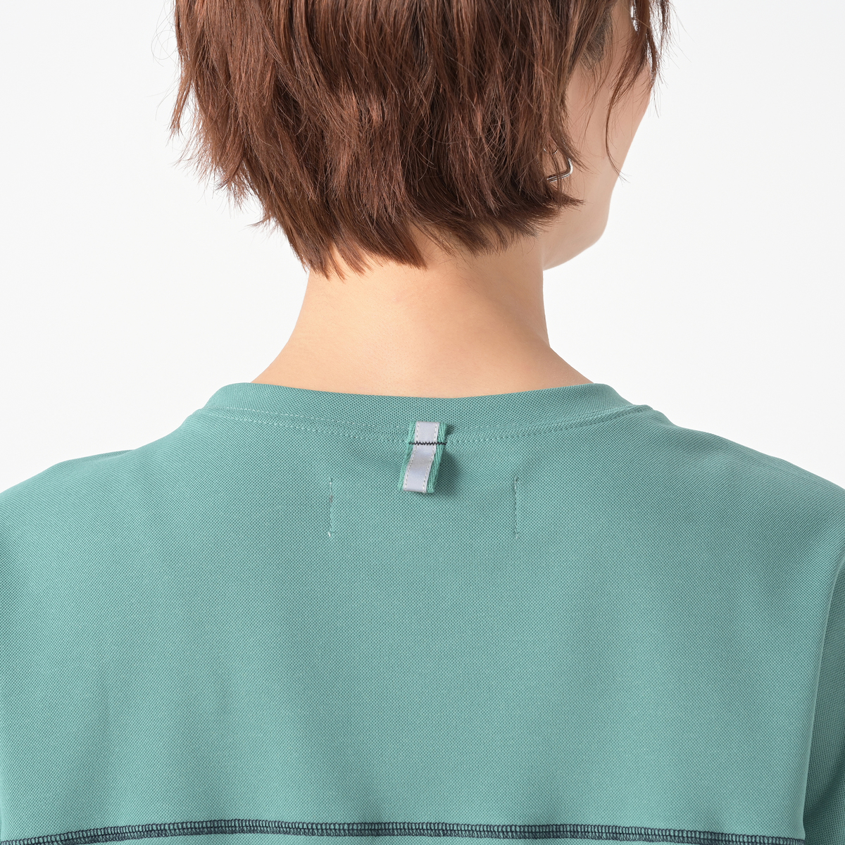 メインの身頃には吸水速乾素材、脇には肌当たりの良いコットン素材を使用しました。左胸にはデザイン性と実用性を兼ね備えたファスナーポケット付きです