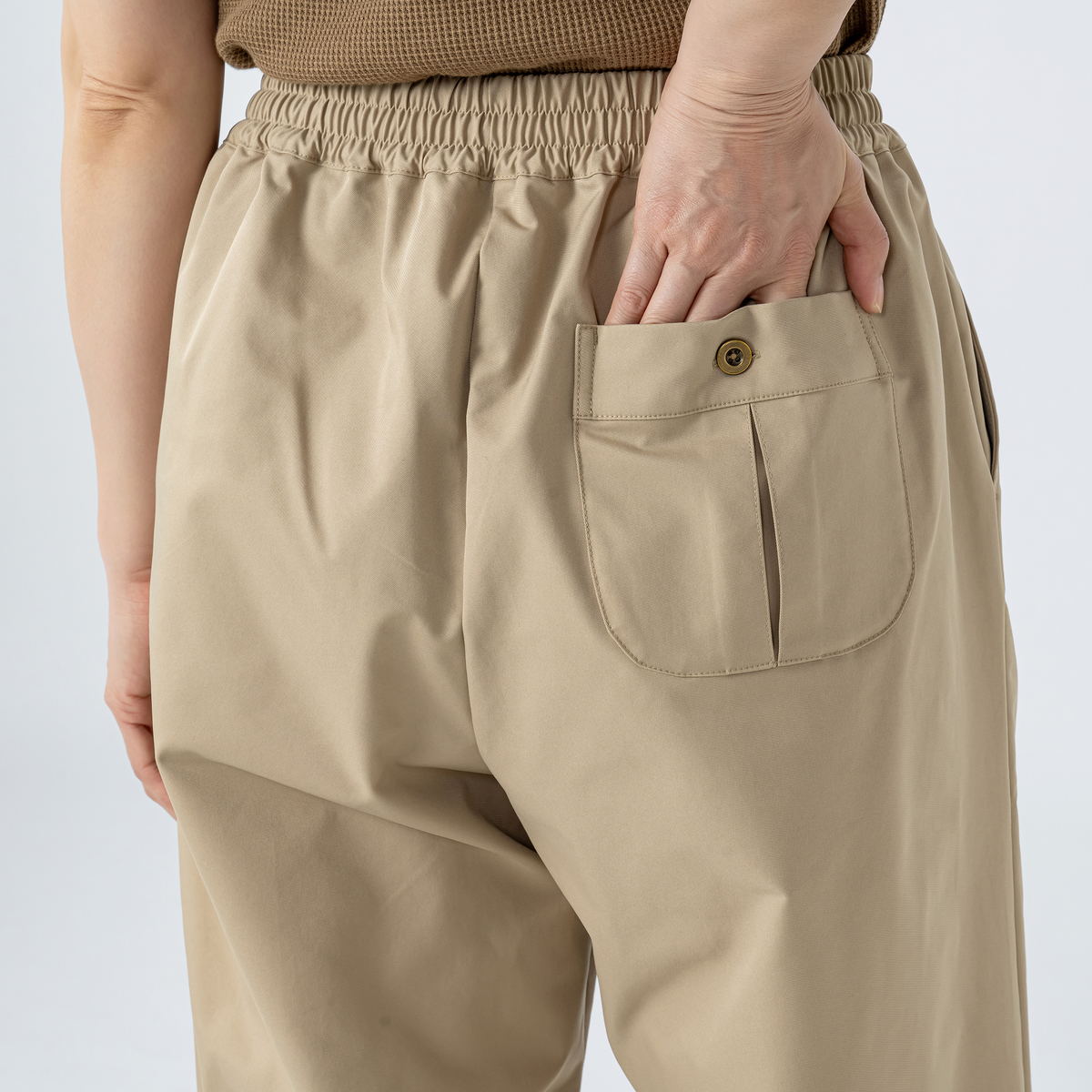 ウエストはゴム入りで楽なプルオンタイプ。布帛素材を使用し、シルエットに拘ったしっかりとした作りのパンツです。楽なのにきちんと見えする仕上がりです