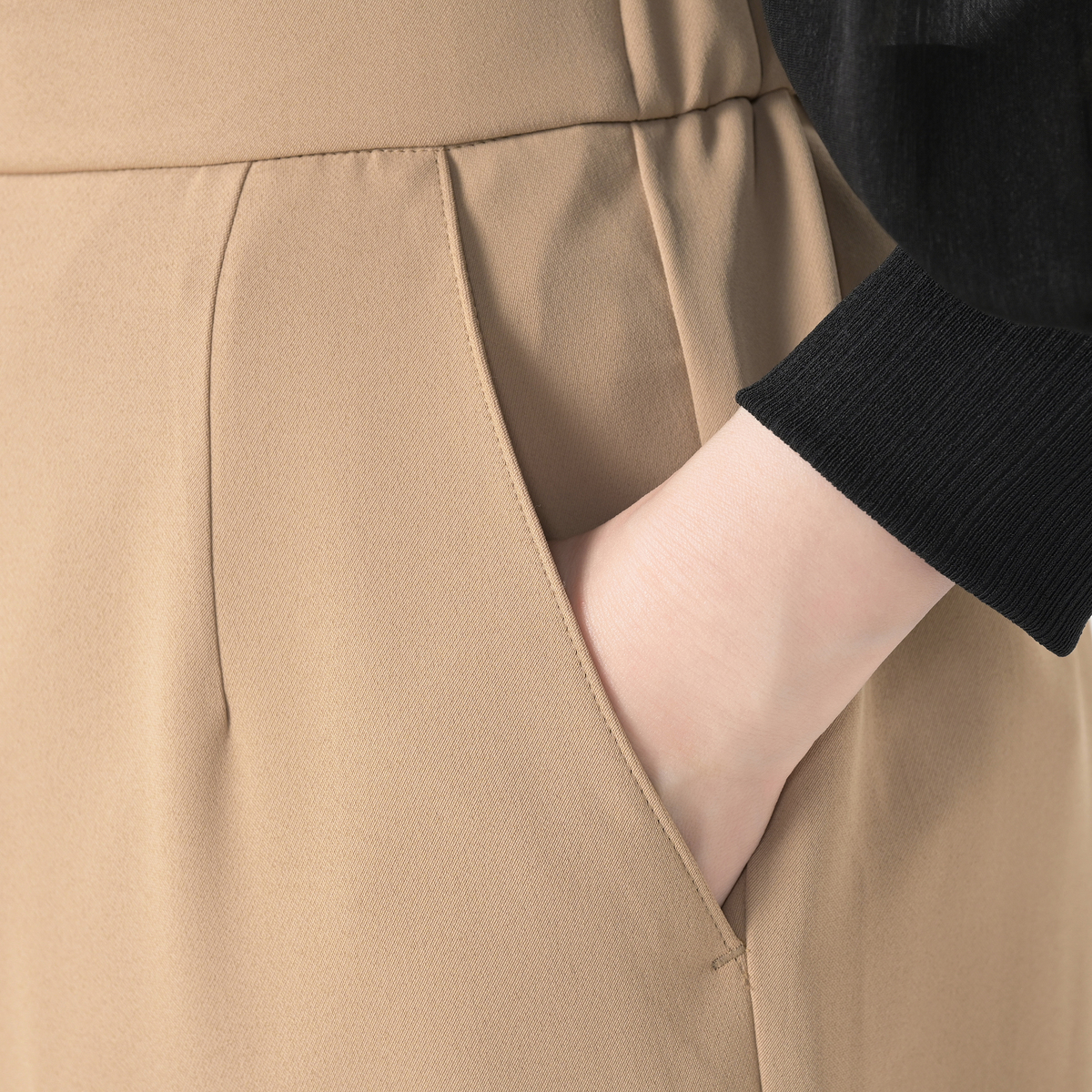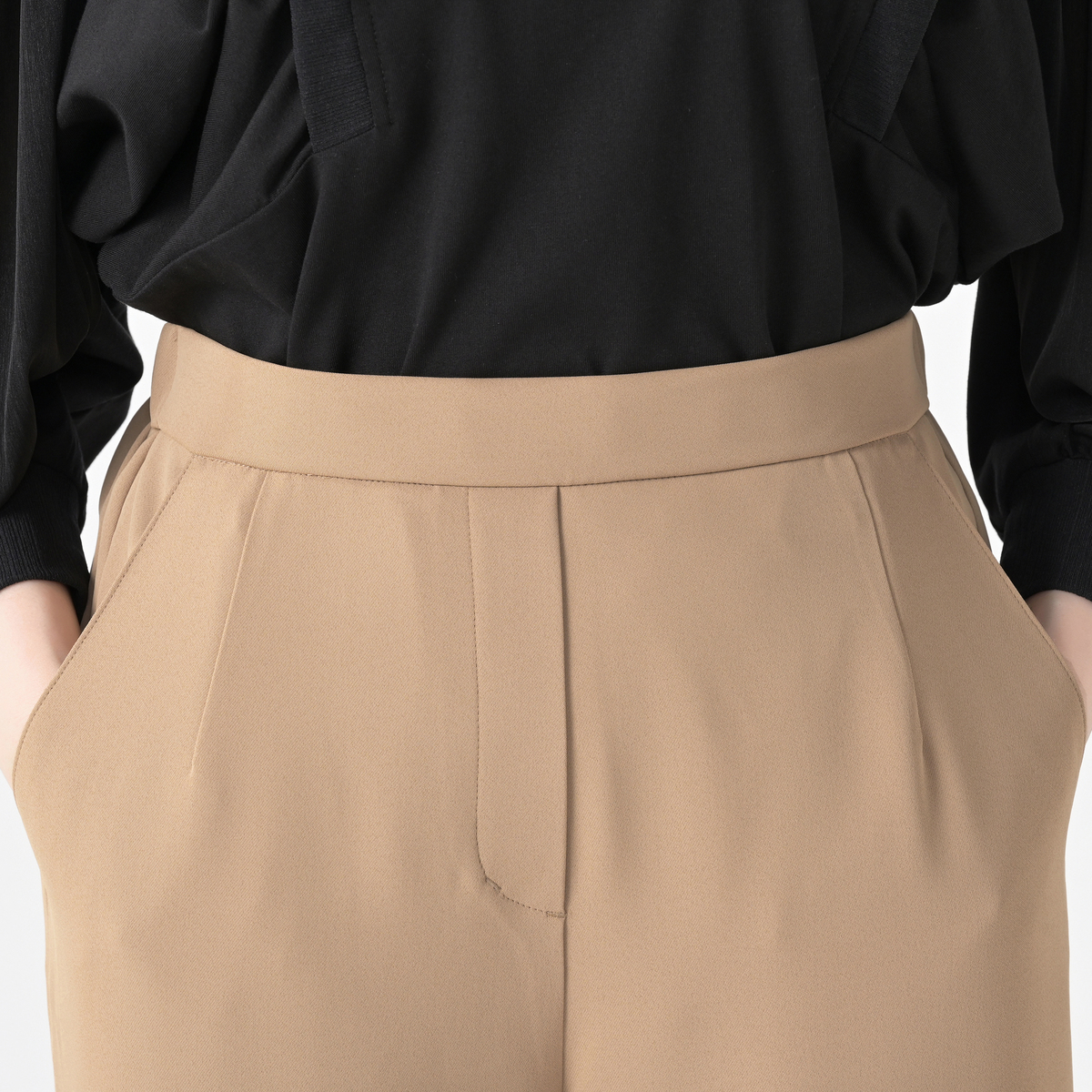 軽くて涼しそうな肉感のストレッチツイル素材。落ち感もよいので、バサッと広がらずにエレガントなシルエットに。裾のメッシュは目が細かい透けすぎないタイプです