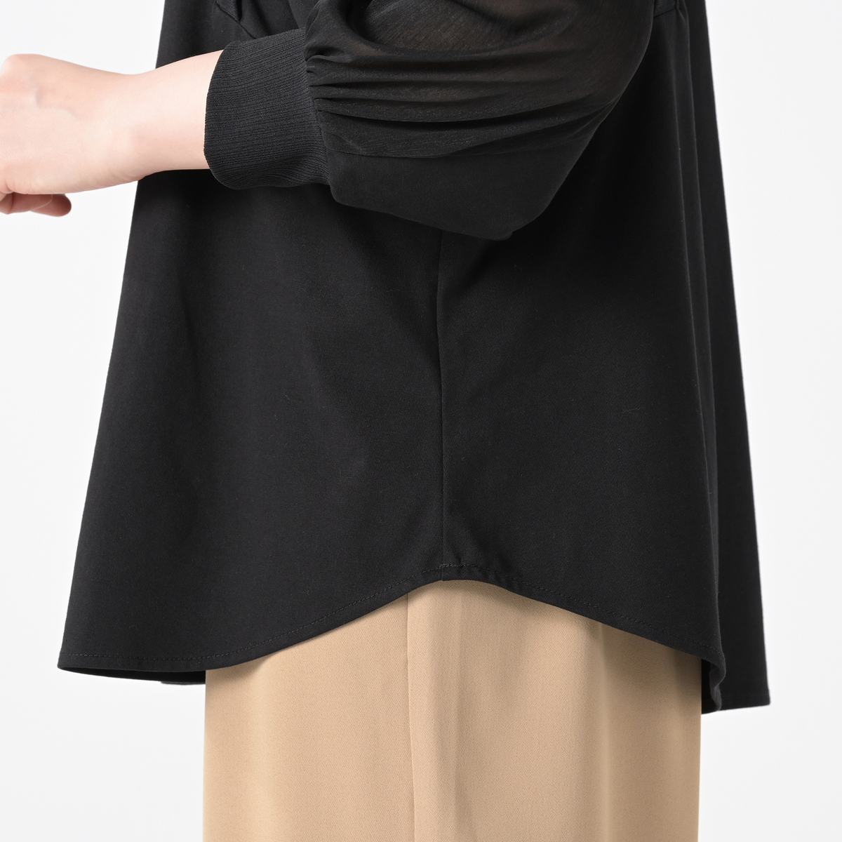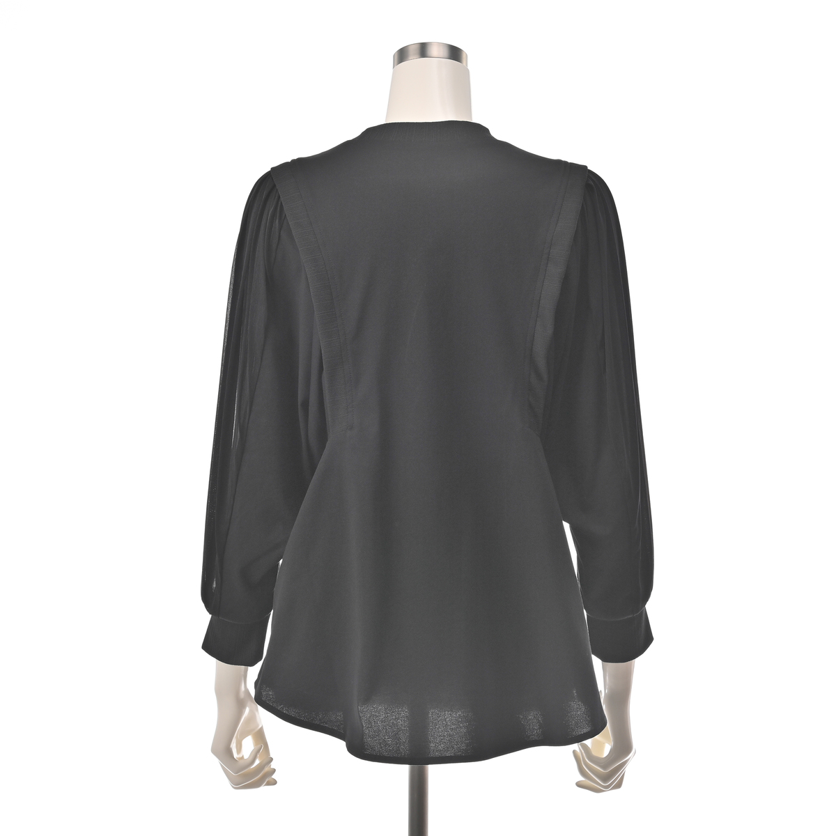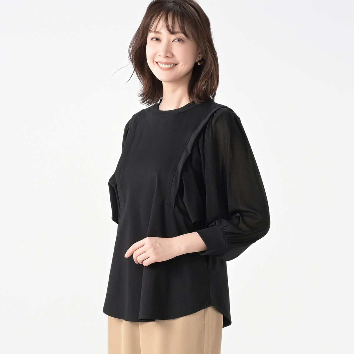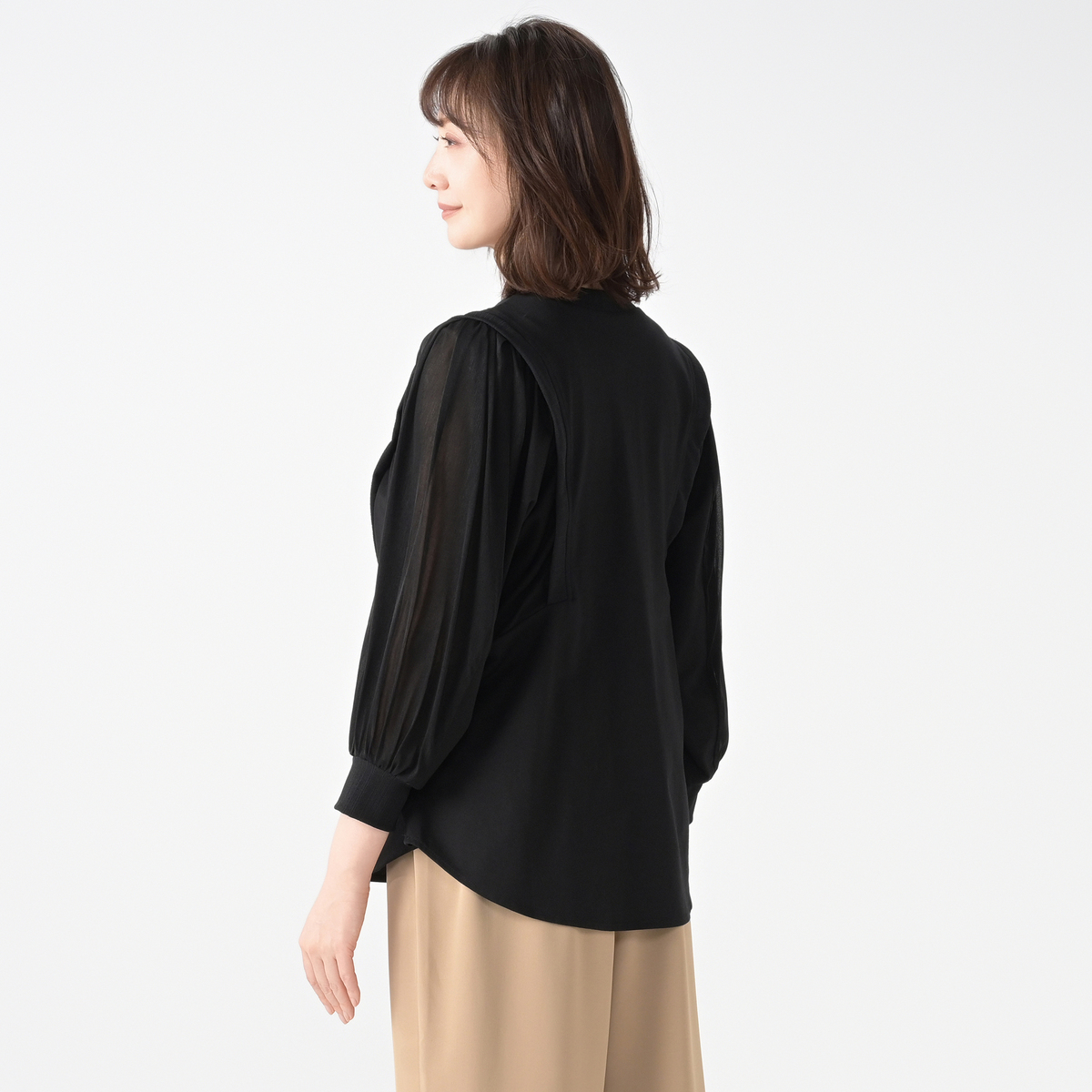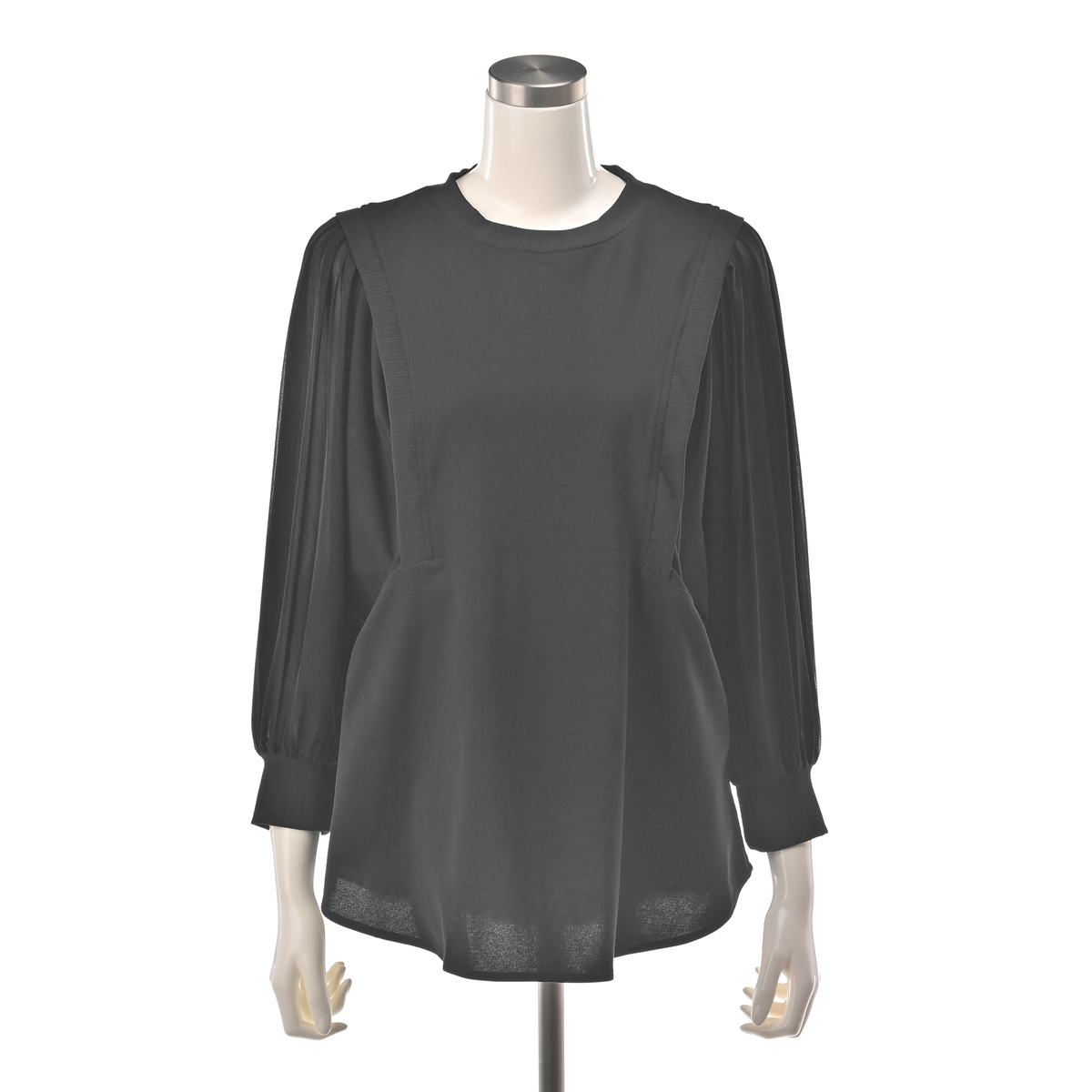 異素材のミックスが光るプルオーバーは、デザインを考え抜いた美しい調和のとれたデザイン。肩から腕にかけて上部だけ透け感のある、袖のボリュームが楽しめるデザインです