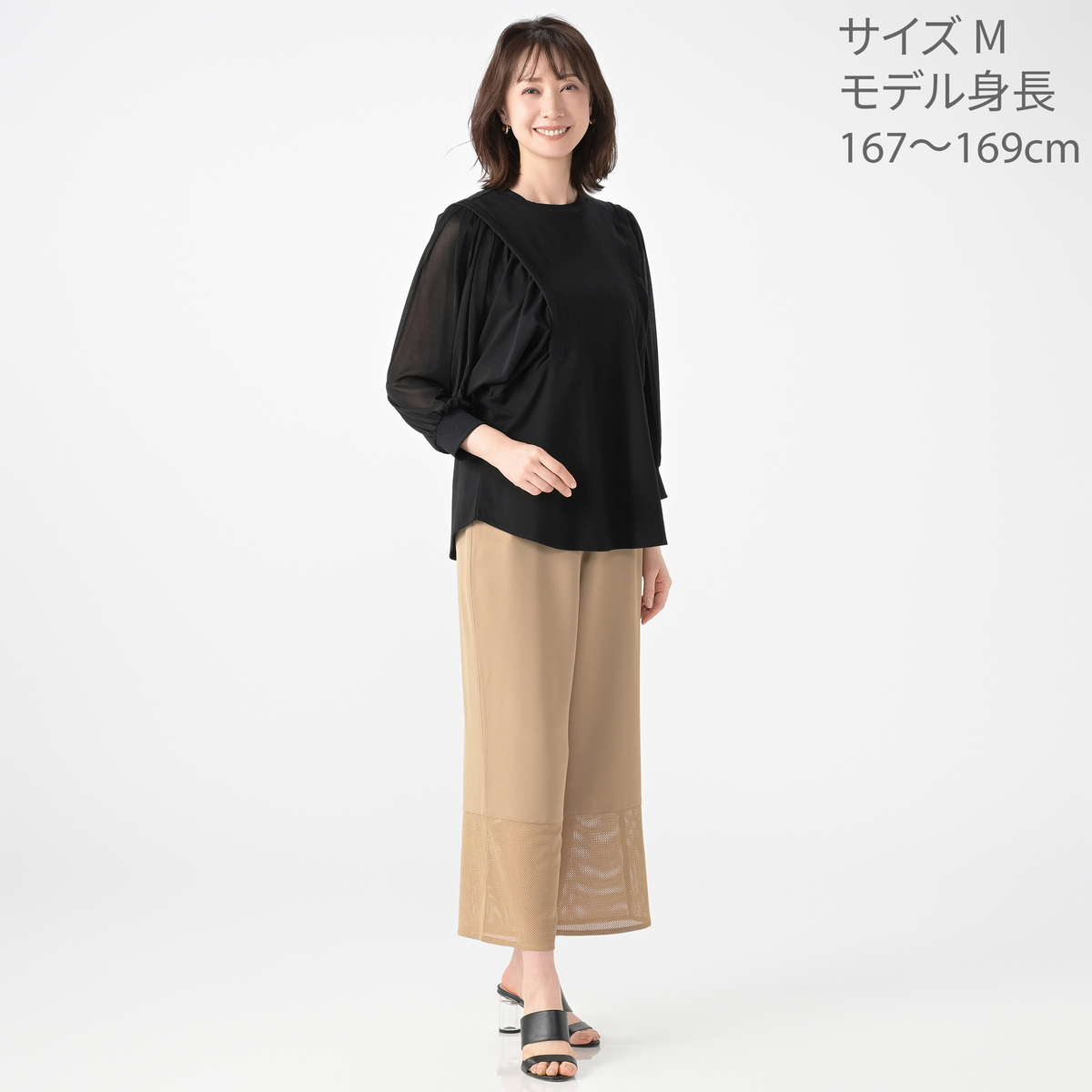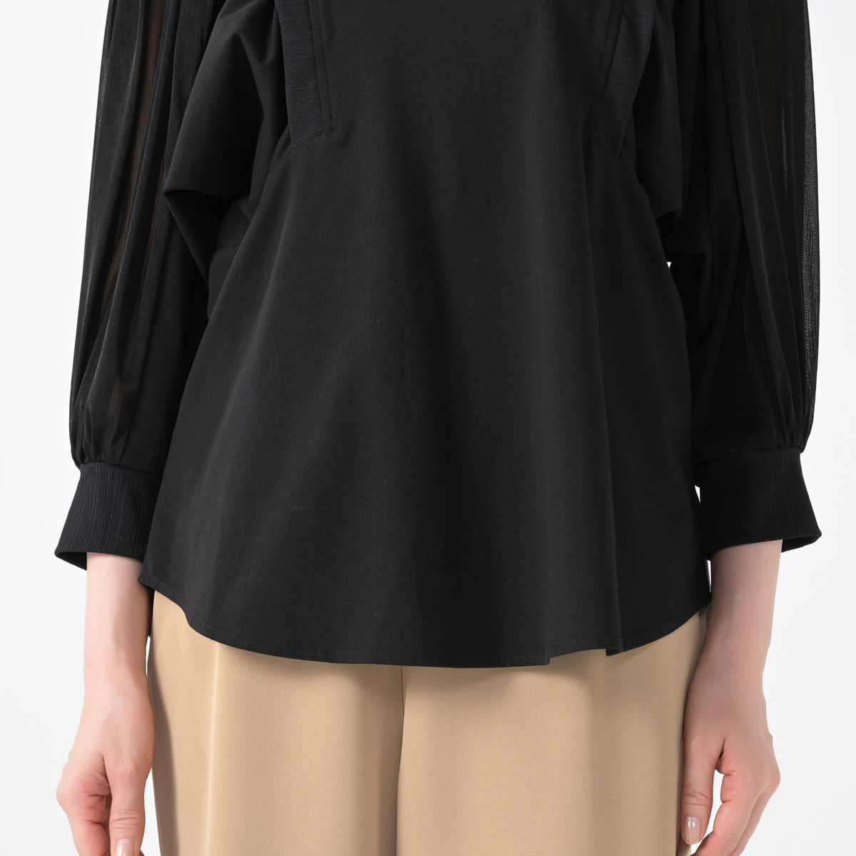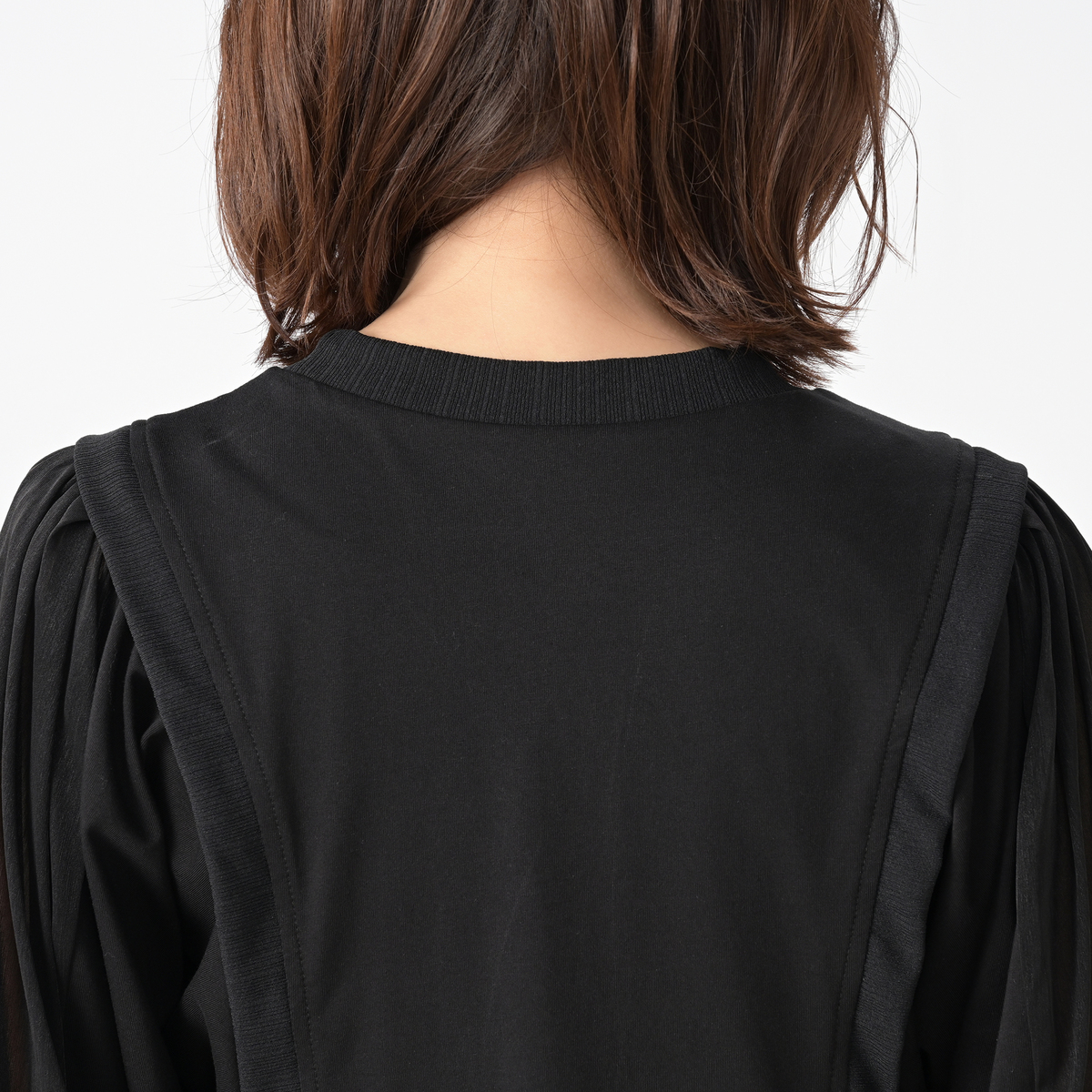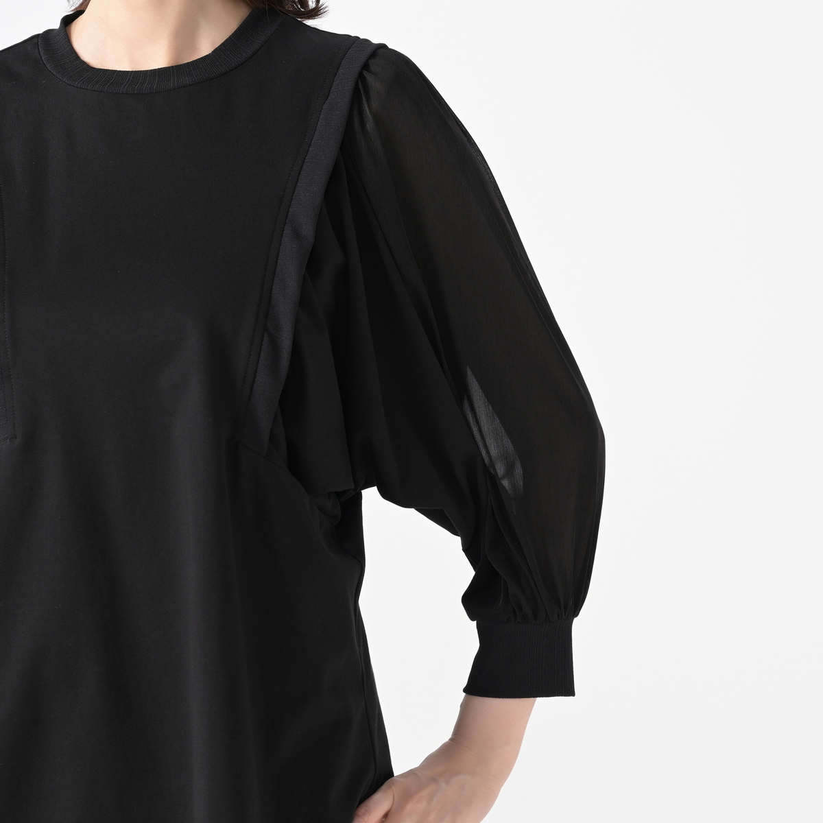 身頃はカットソー素材。袖の上部の素材は透け感とストレッチのある素材で、見た目に涼やか。衿ぐり、カフス、アームホール部分には、表面感のある風合いで柔らかなテレコ素材を使用しています