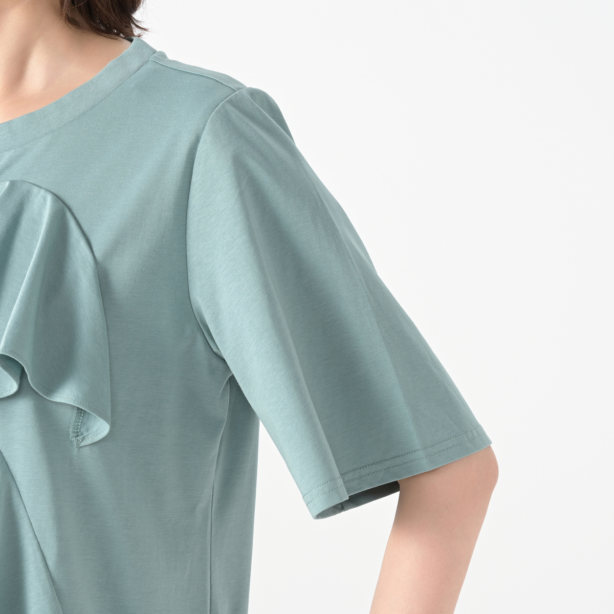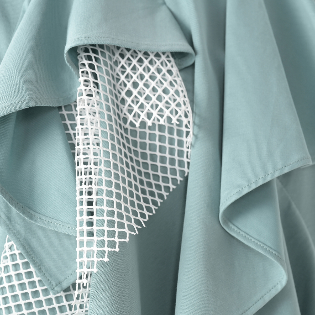 身頃には綿とポリエステルの混紡素材を使用し、表面がさらっとした肌触りです。厚さもほどよく、暑い季節にもおすすめ。こだわりの詰まったフリル飾りには部分的にメッシュを入れて、動きをプラスしました