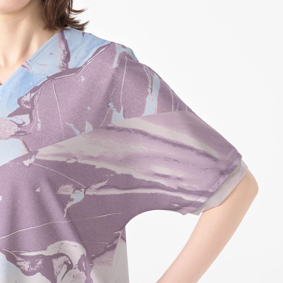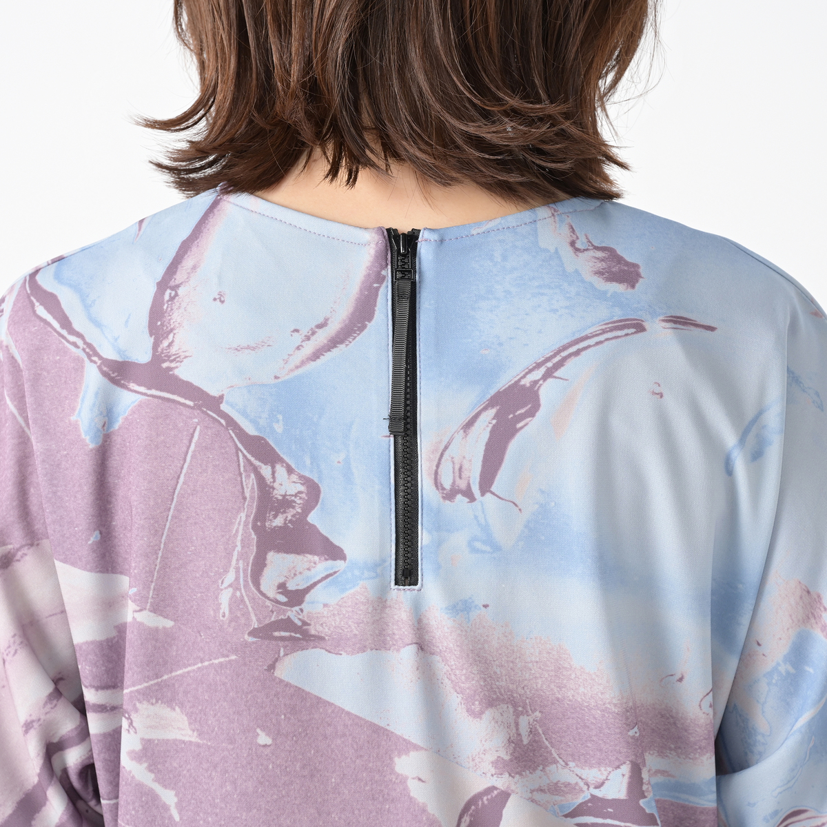 コシノジュンコ先生のアート作品をプリントしてデザイン。流動感のあるプリント柄が存在感を放ちます。Vネックとこなれた印象のドルマンスリーブもポイント。後中心は短めのファスナー付きで、着脱にも便利です