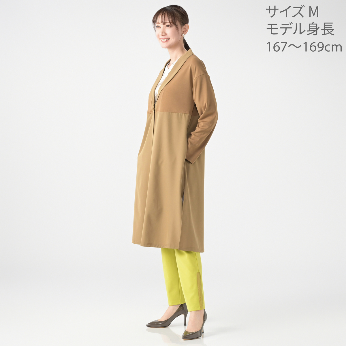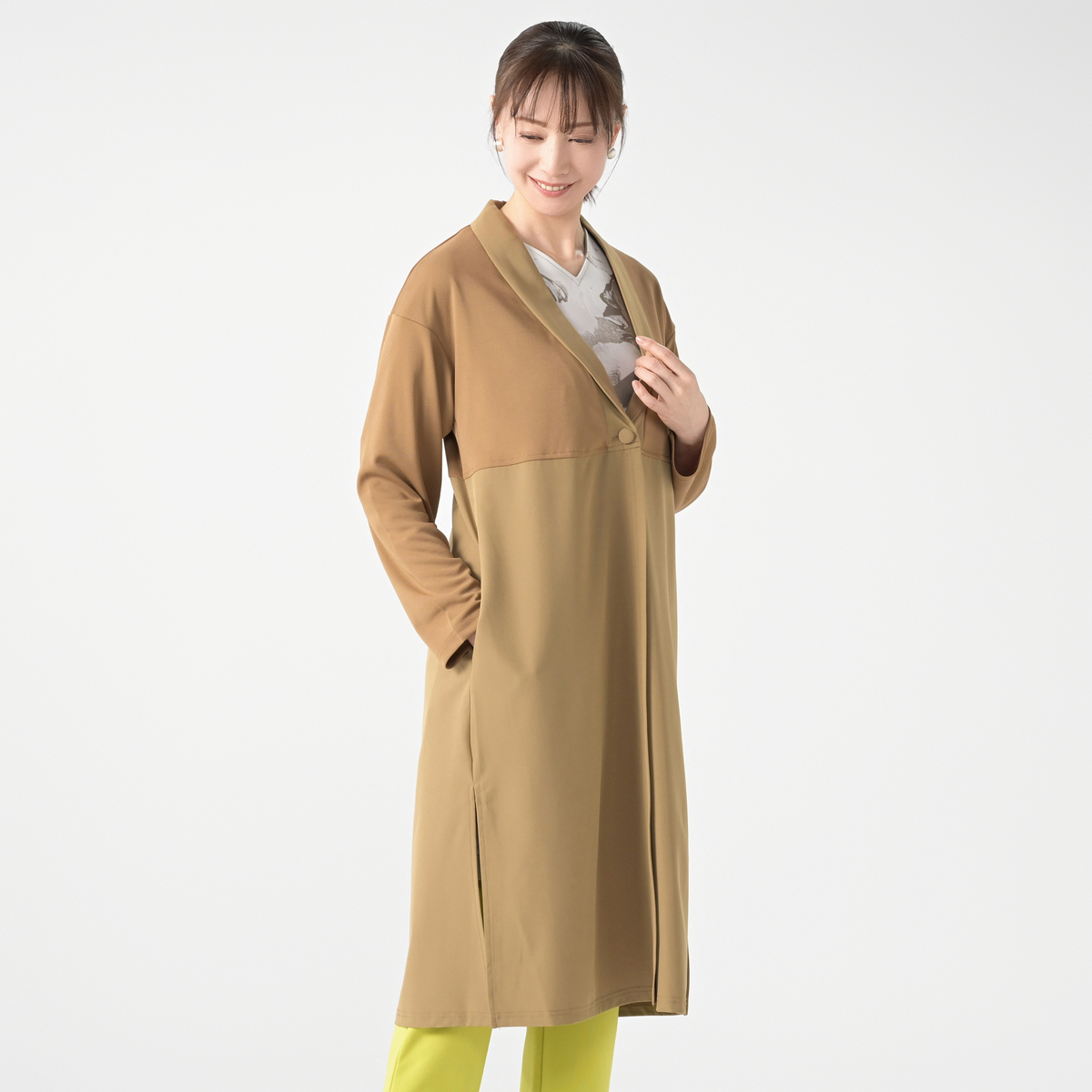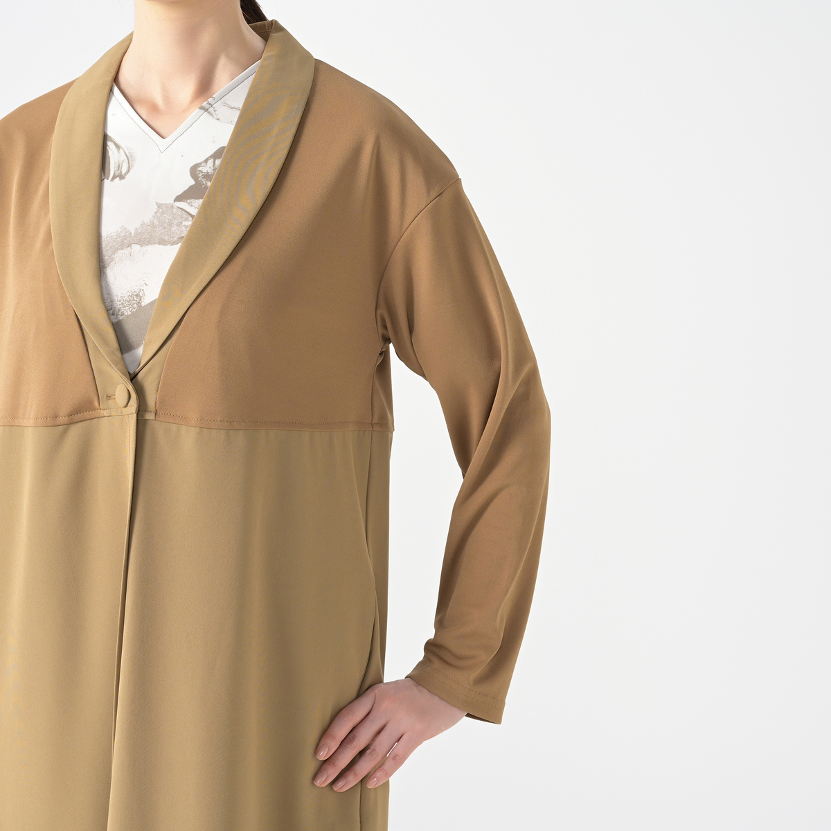 砂ジャージーと布帛を組合せたロングカーディガン。直線的なシルエットながらも衿元をショールカラーに仕上げる事でフェミニンな雰囲気をプラスしました