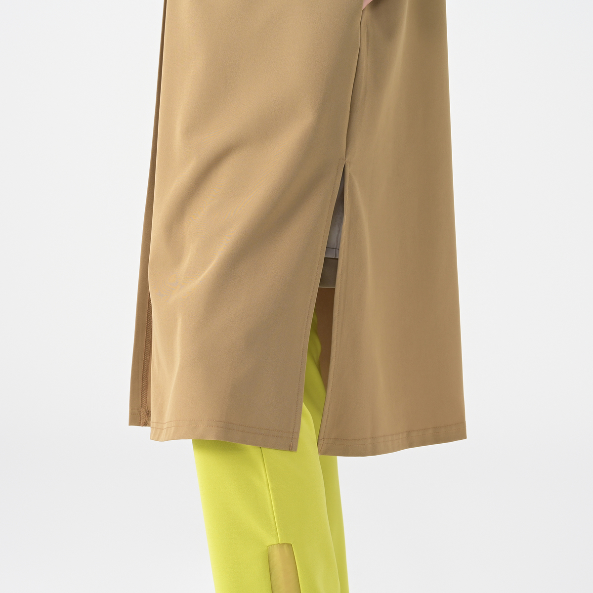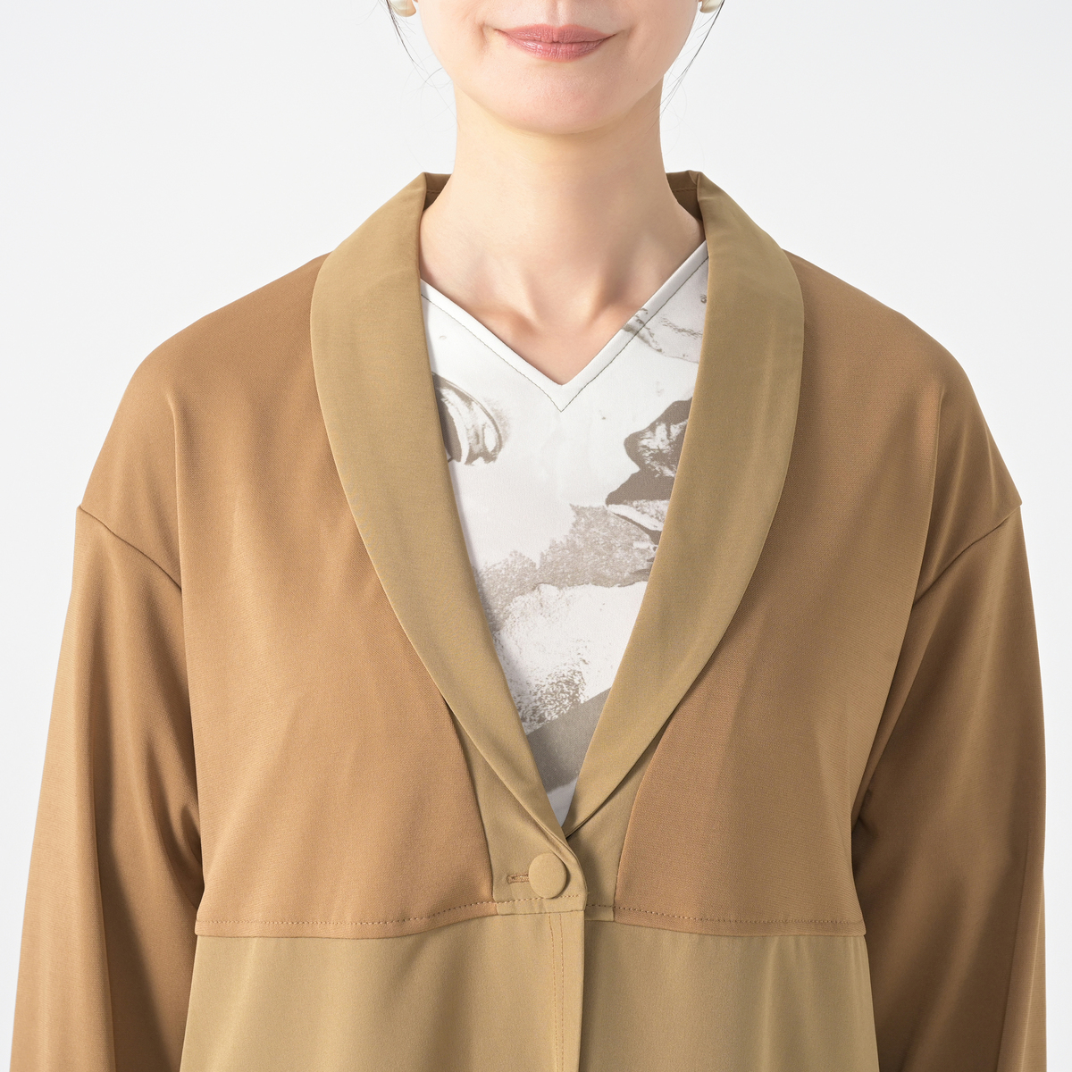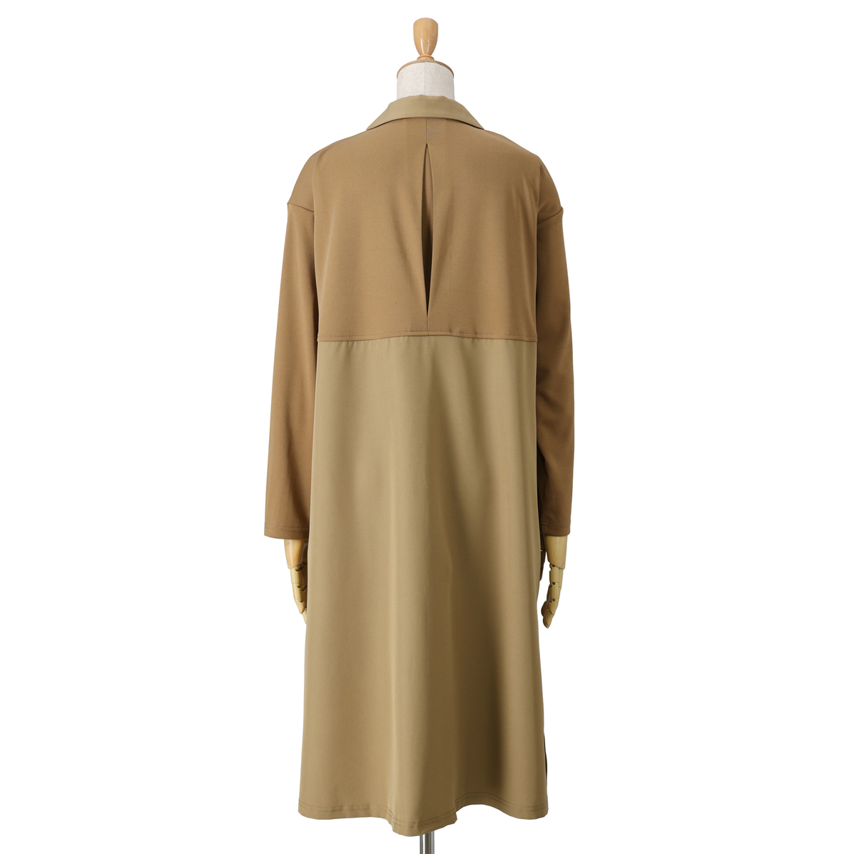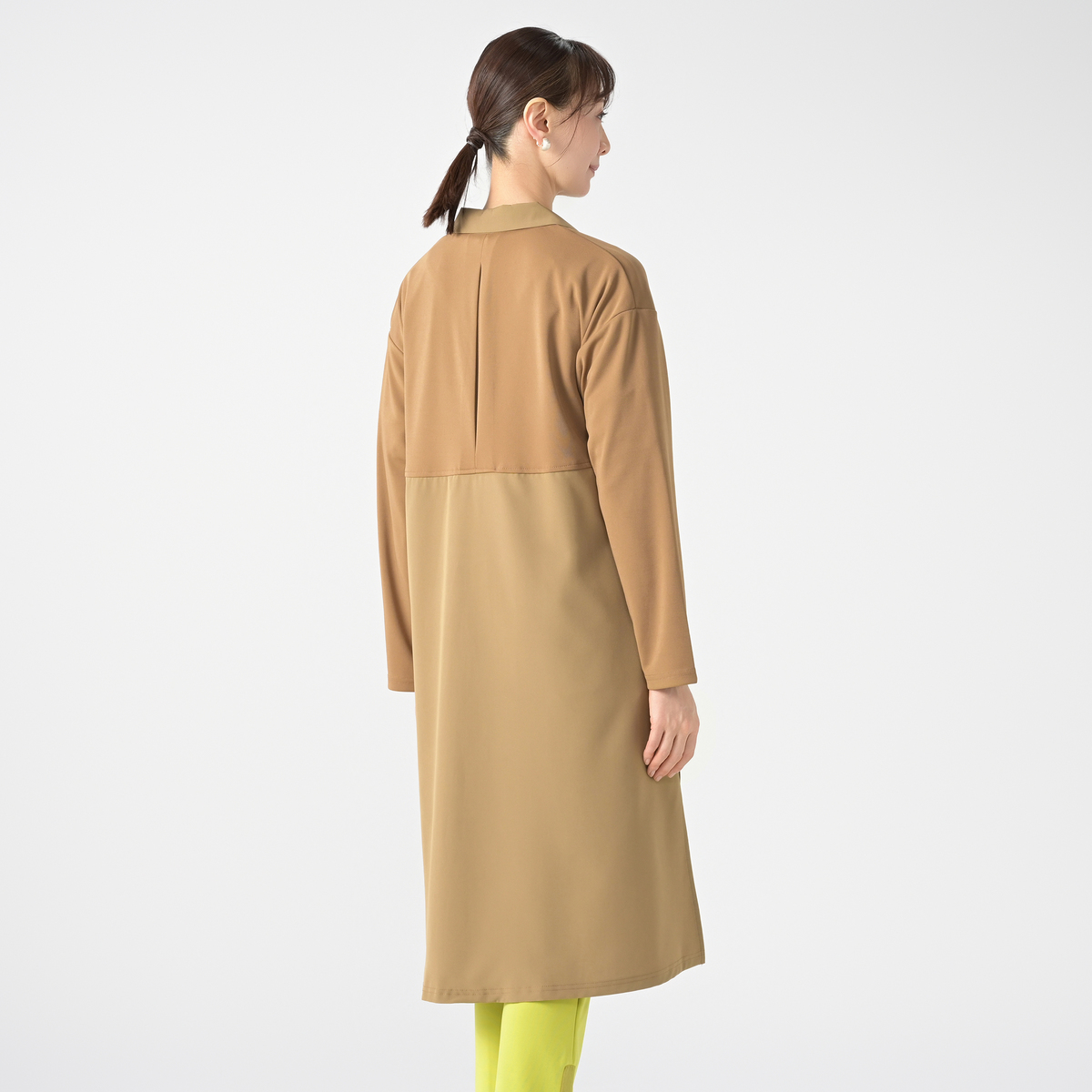 砂ジャージーと布帛を組合せたロングカーディガン。直線的なシルエットながらも衿元をショールカラーに仕上げる事でフェミニンな雰囲気をプラスしました