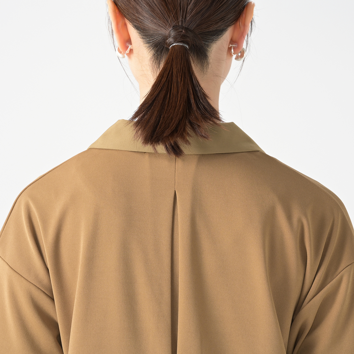 本体に使用した砂ジャージー素材は布帛見えするクリーンな表面感が特徴。程よい張り感・ドレープ感があり仕立て映えする素材です
