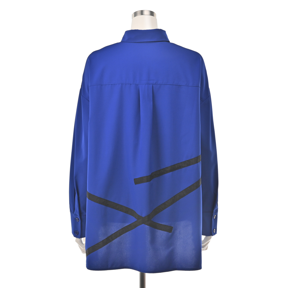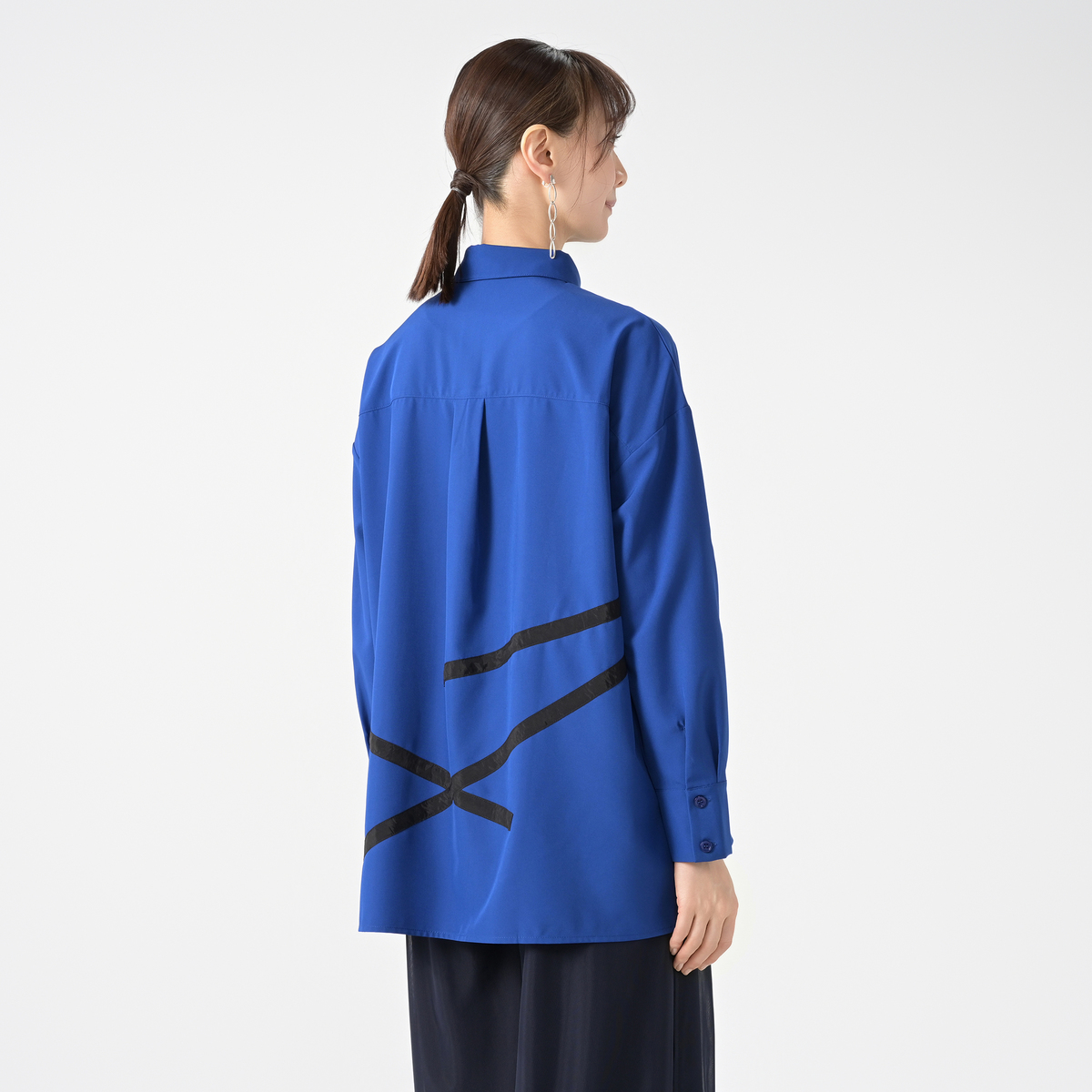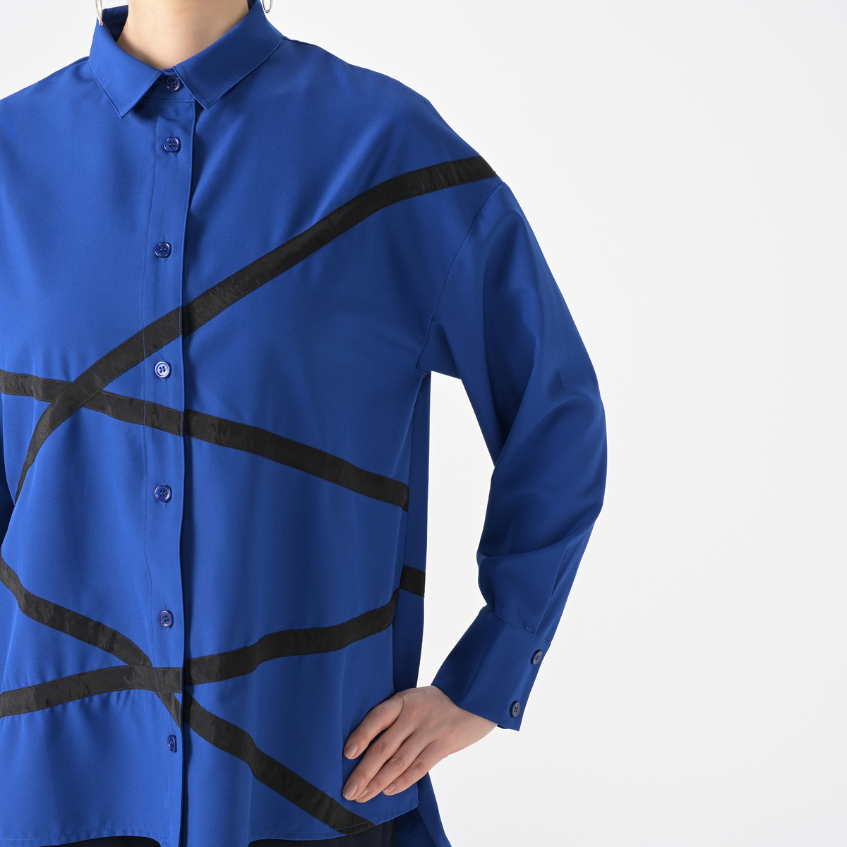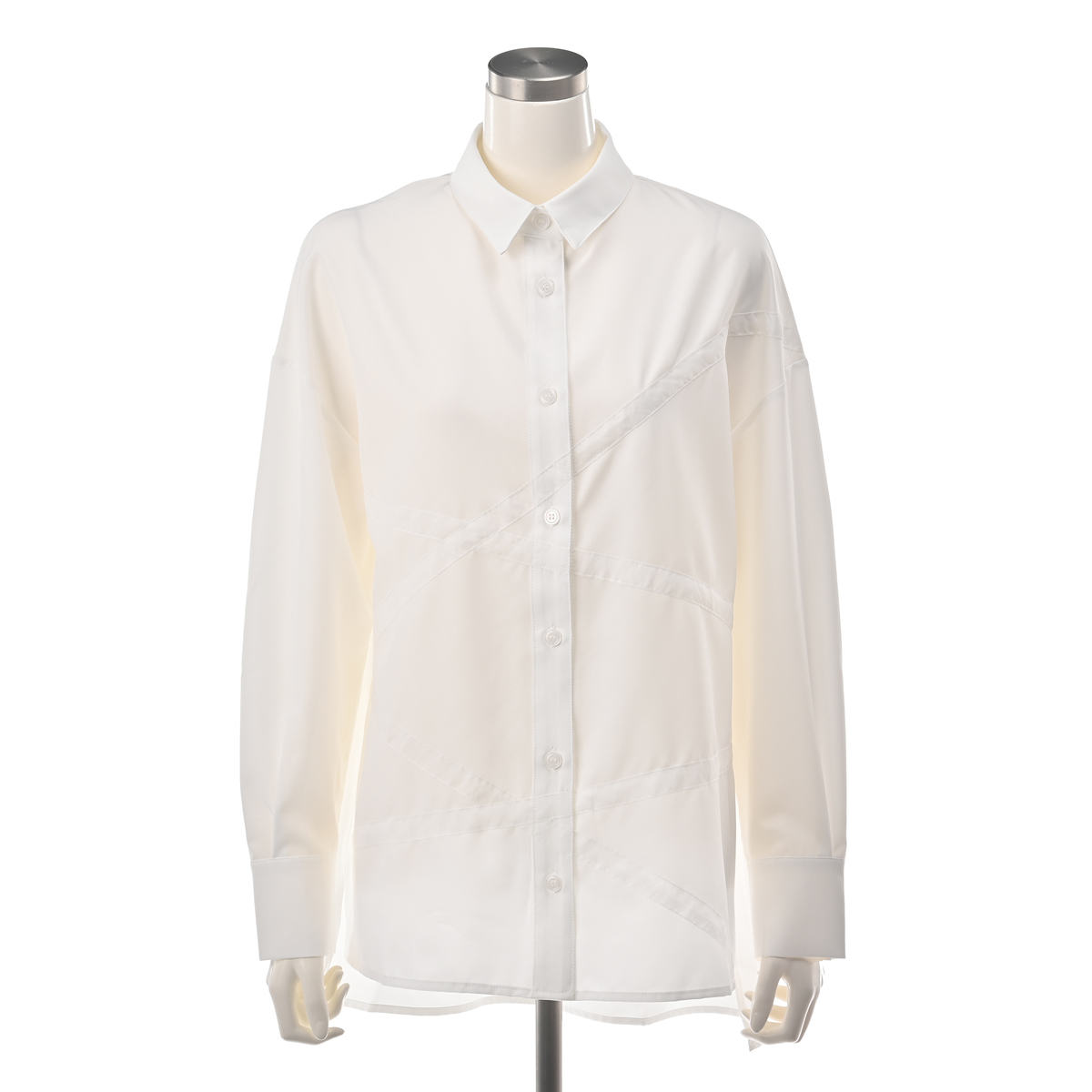JUNKO KOSHINOコレクションアーカイブより、アイコン的なデザインをシャツにアレンジ。オーガンジーテープをランダムにクロスさせた、シンプルで存在感のある一枚です。マットなシャツ素材と光沢のあるオーガンジーテープのコントラストもデザインポイントで、洗練された印象を演出します