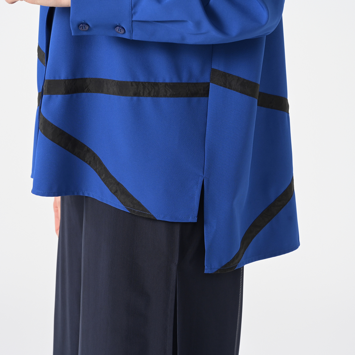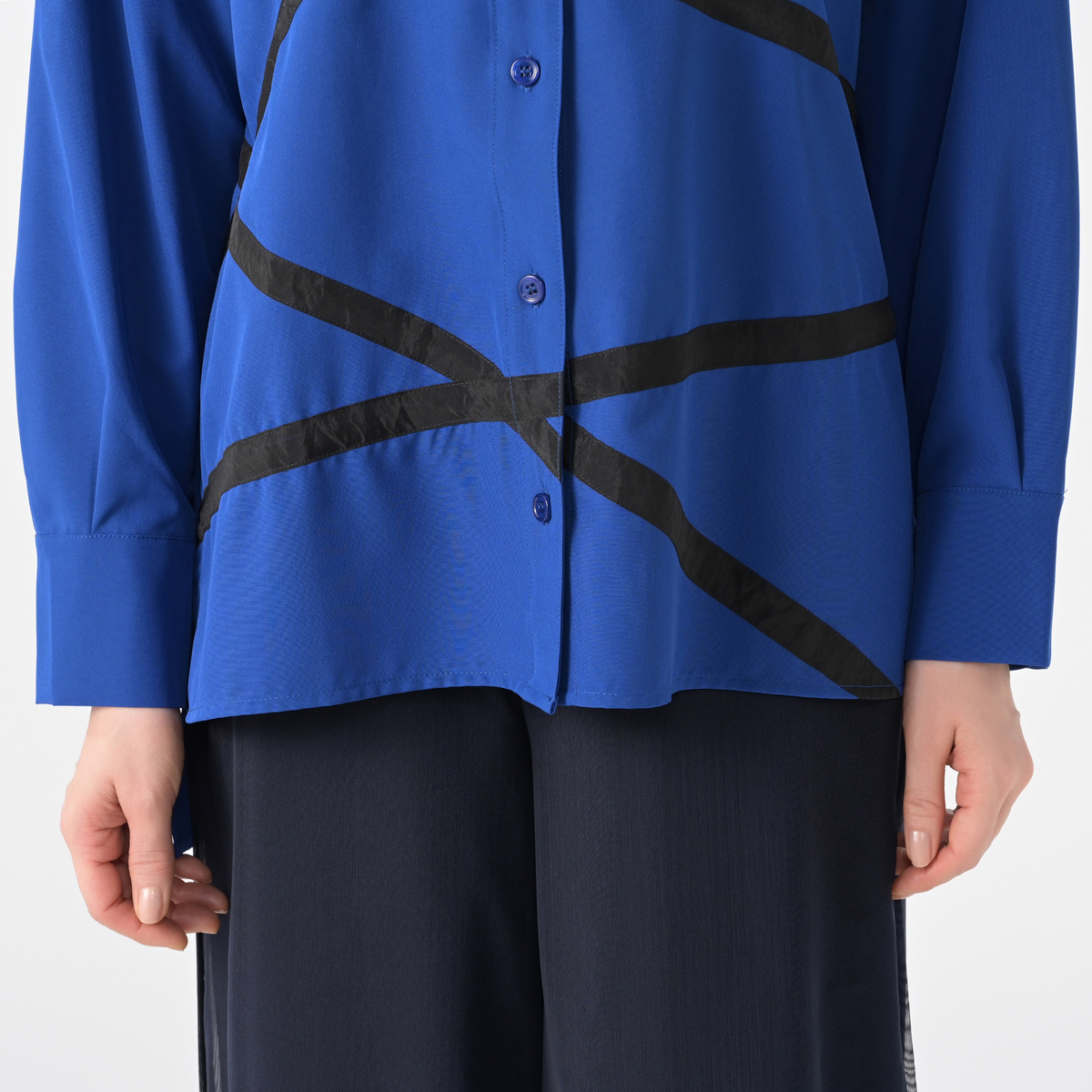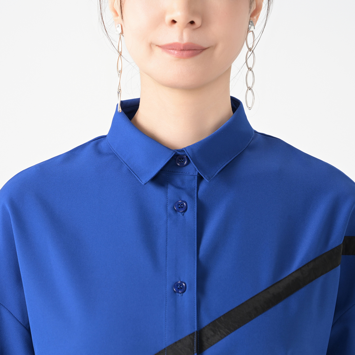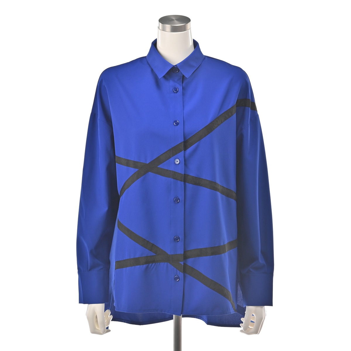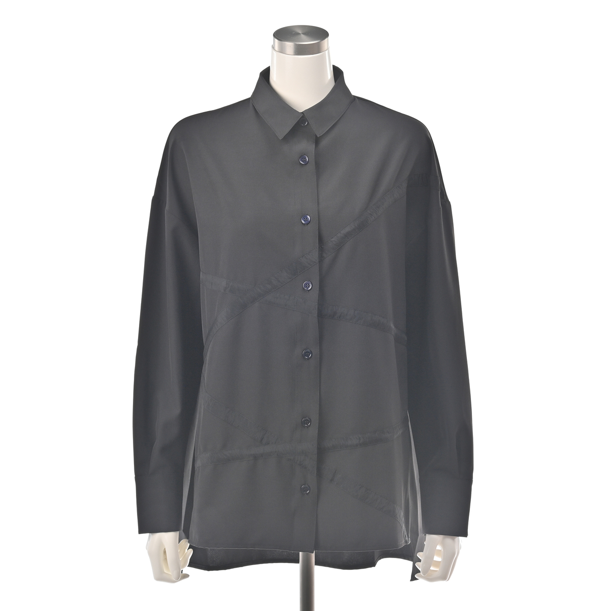 JUNKO KOSHINOコレクションアーカイブより、アイコン的なデザインをシャツにアレンジ。オーガンジーテープをランダムにクロスさせた、シンプルで存在感のある一枚です。マットなシャツ素材と光沢のあるオーガンジーテープのコントラストもデザインポイントで、洗練された印象を演出します