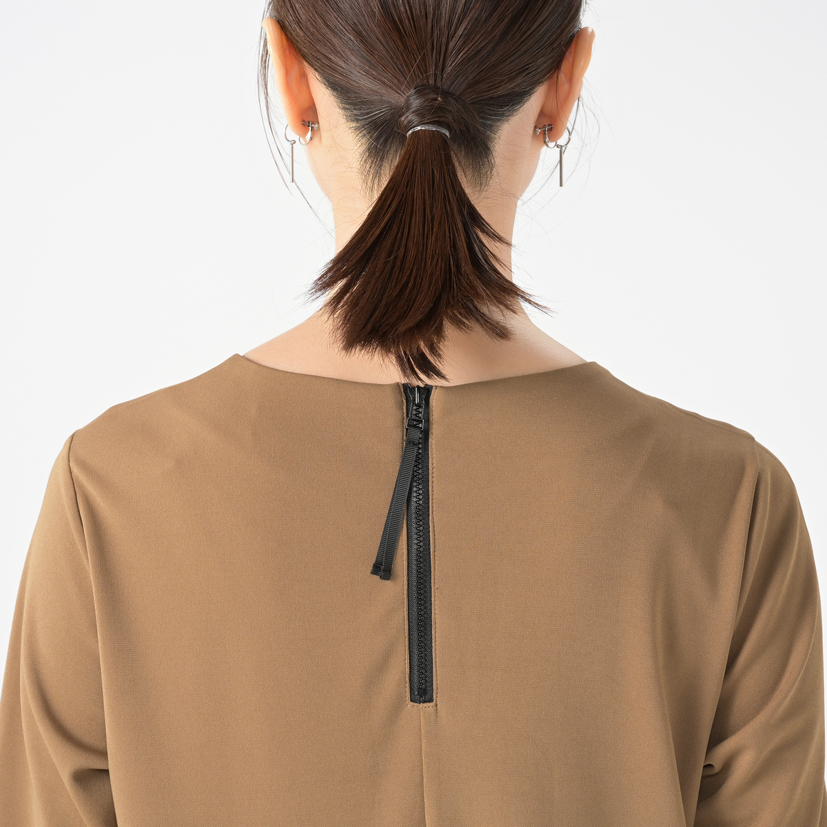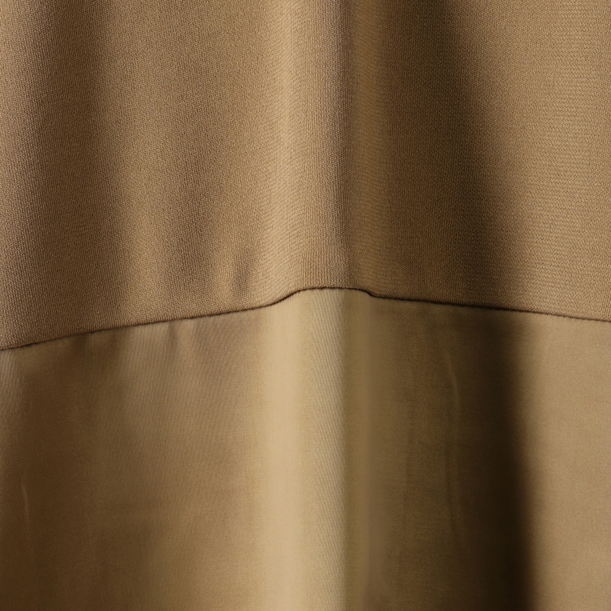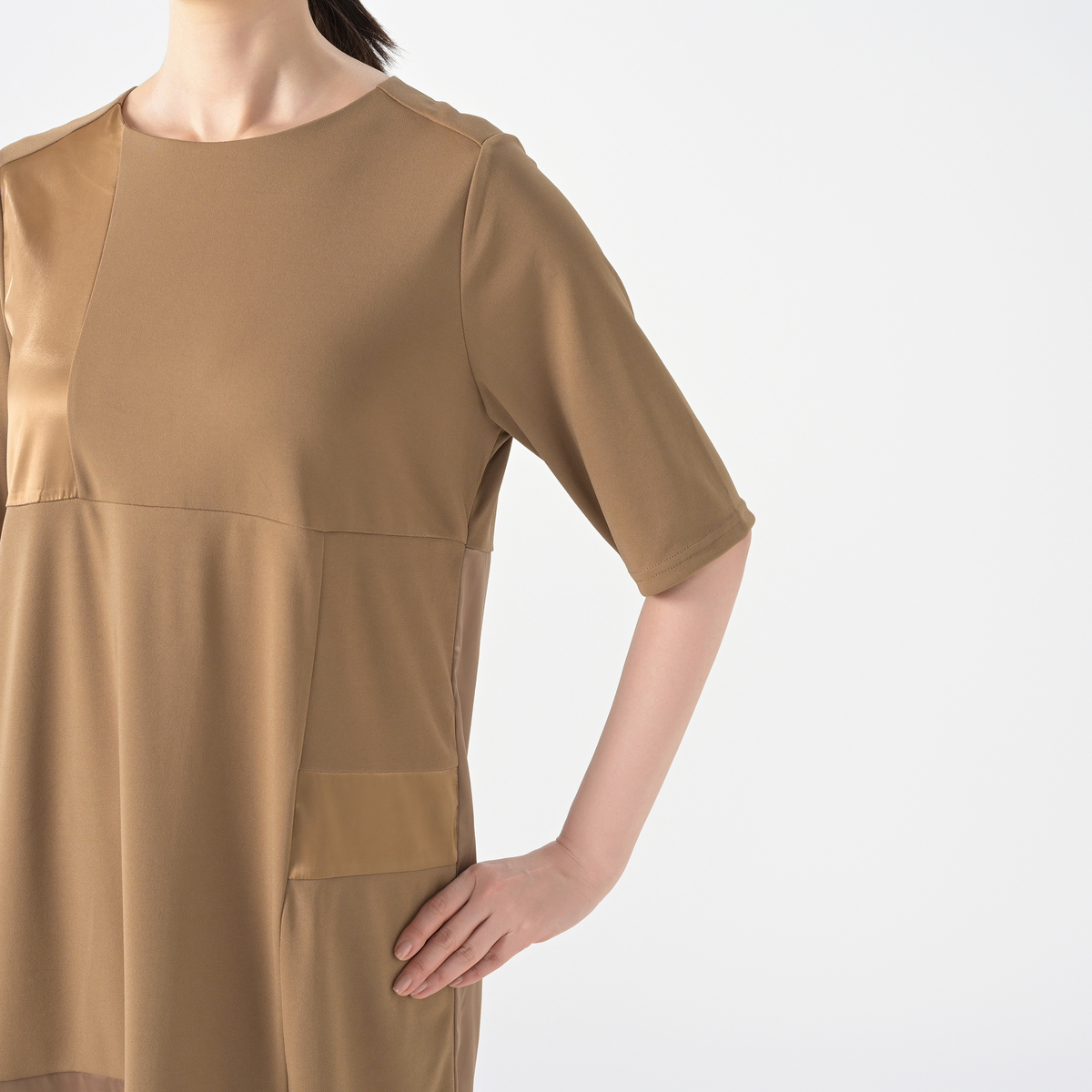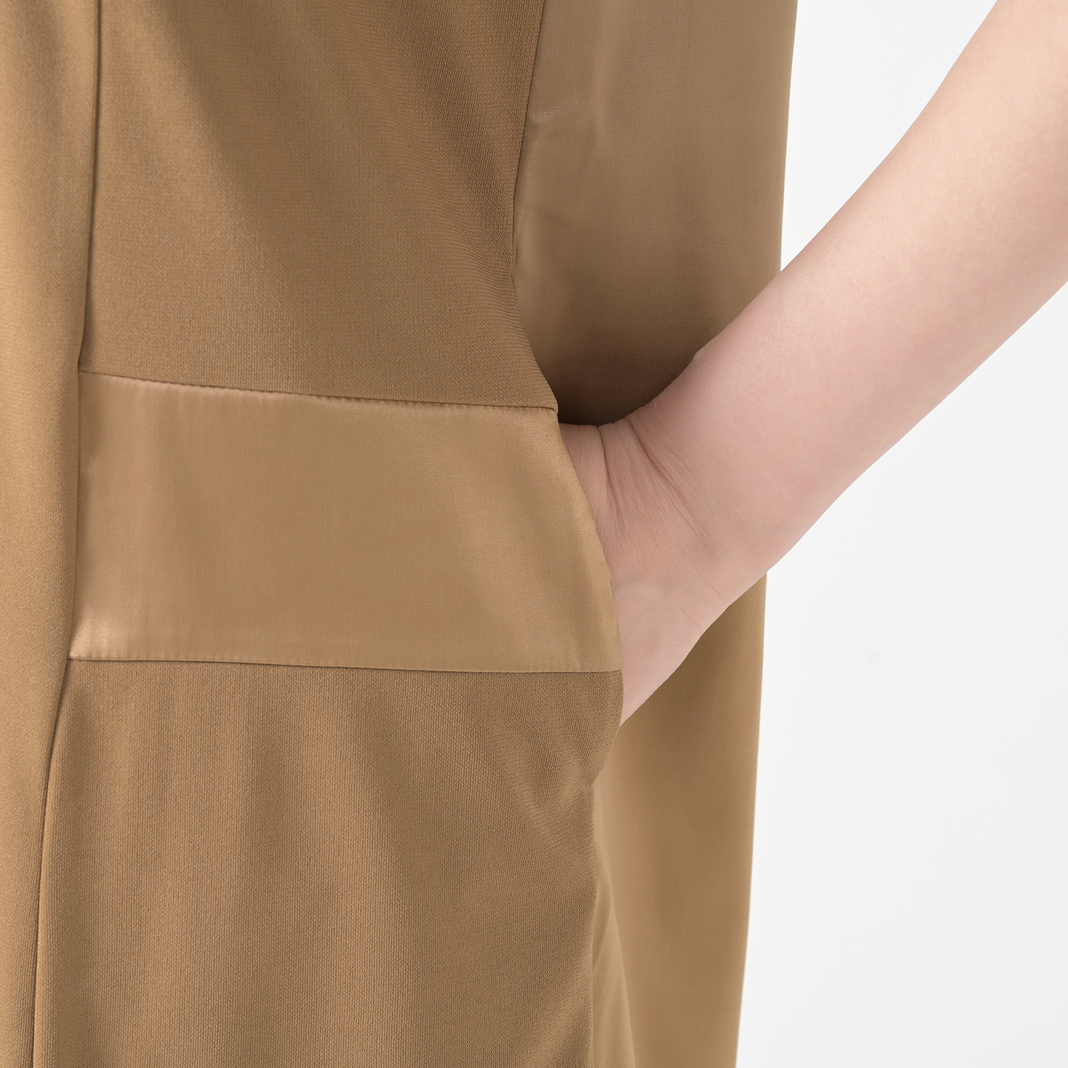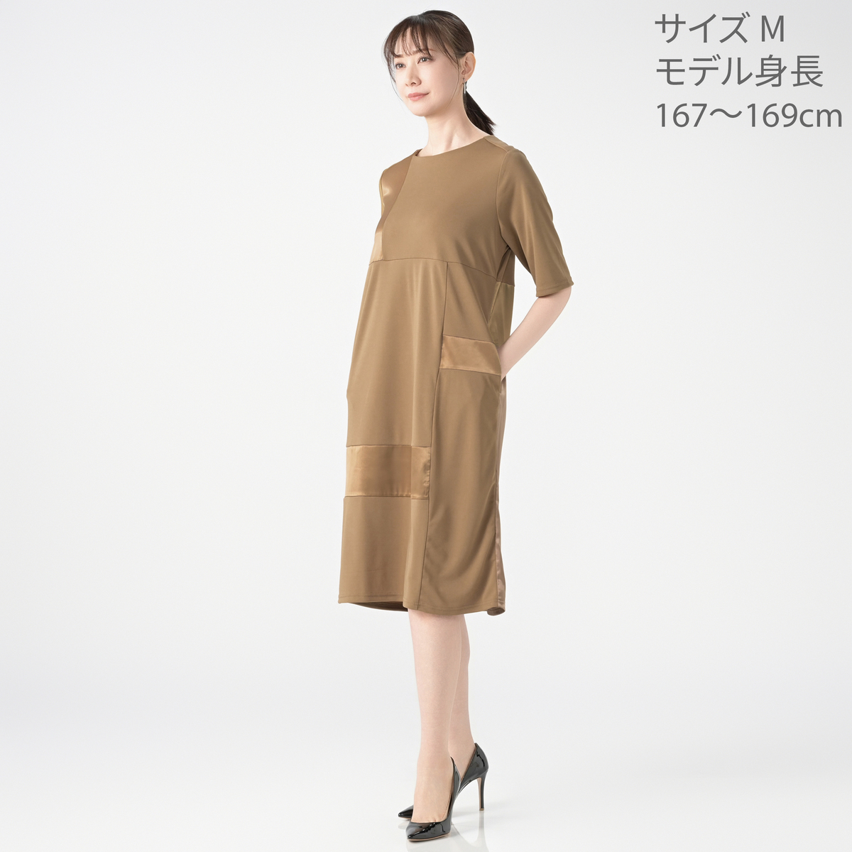 砂ジャージーと光沢感のあるサテンを組合せたワンピース。左右非対称の大胆なデザインながらも、同色の異素材を使うことで上品な印象で着こなせます