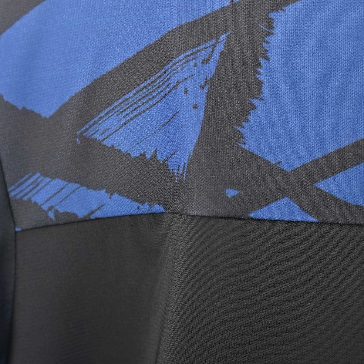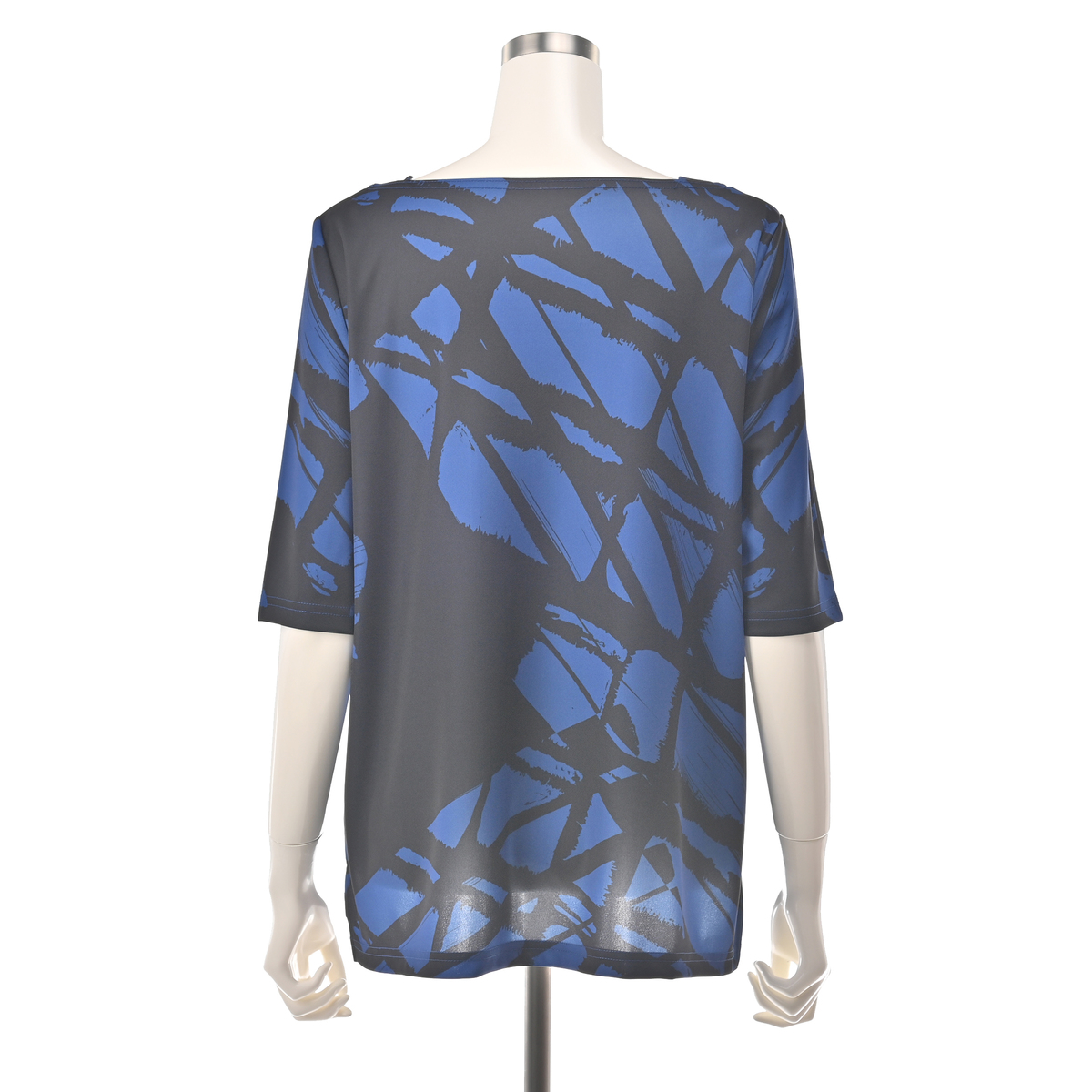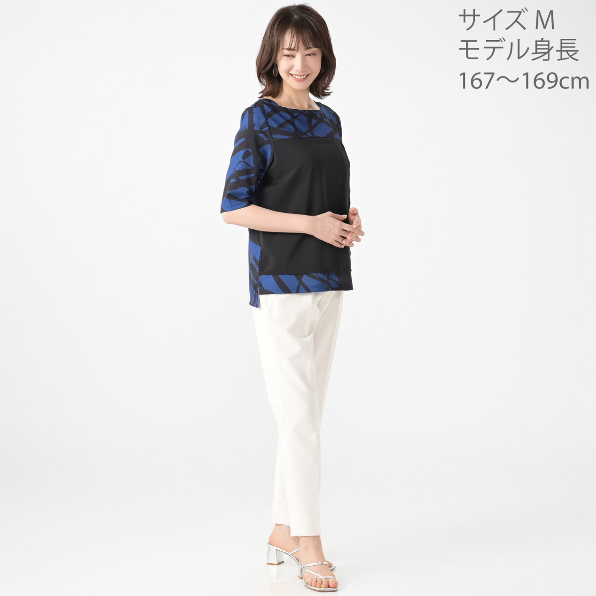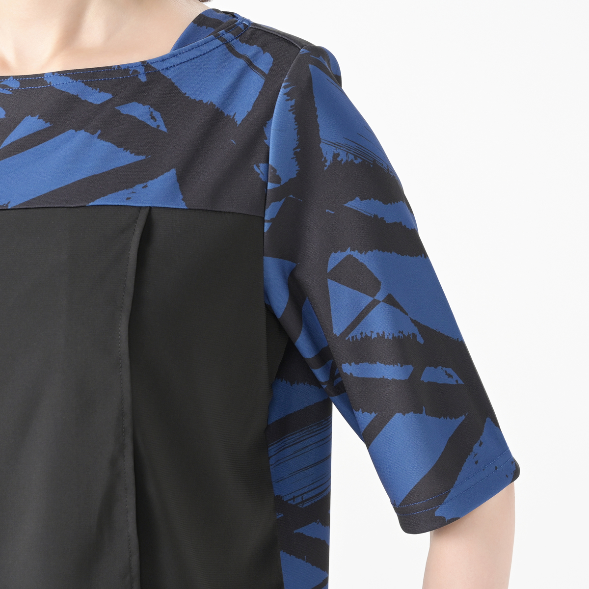 もっと派手かと思いましたが、落ち着いたブルーとブラックが効いていて、とても大人の雰囲気のお洋服です。前面のアシンメトリーなブラックの部分が縫い付けられてないので、軽やかなレイヤードデザインです。お揃いのパンツに出して、インして、ベルトをして、と色々愉しめます。とても素敵なツーピースです。お袖は、二の腕からギリギリ肘までカバーしてくれます。JUNKO先生のお洋服をこのお値段で着られて、とてもラッキーです。手持ちの水晶のネックレス他がとても合います。暑い夏が楽しみにらなりました。