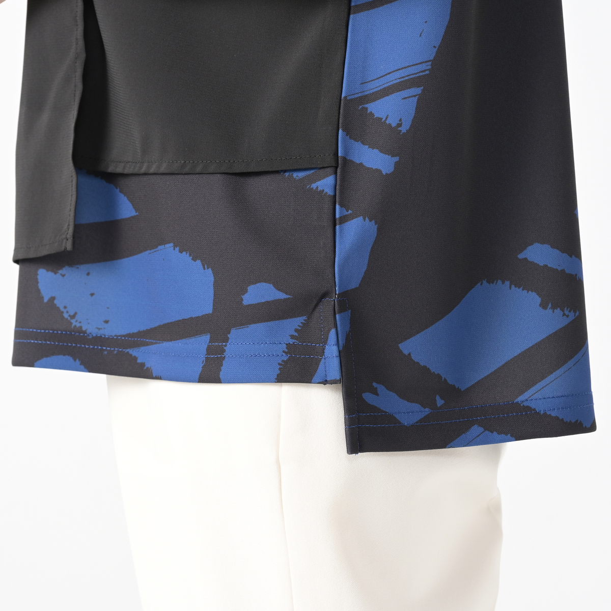 コシノジュンコさんのアート作品をプリントしたプルオーバー。身頃に重ねた無地のシフォンで清涼感と動きをプラスしました