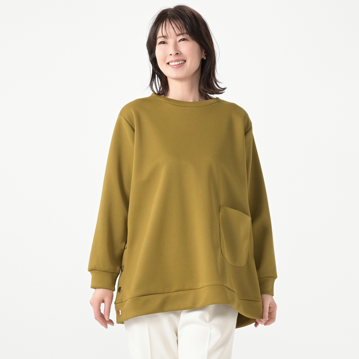 少しドロップした肩から裾に向かって広がる、やさしいAラインシルエット。適度にゆったりとした分量感で気になるお腹まわりやヒップを隠しながら、縦長のラインで細見え効果も期待できます