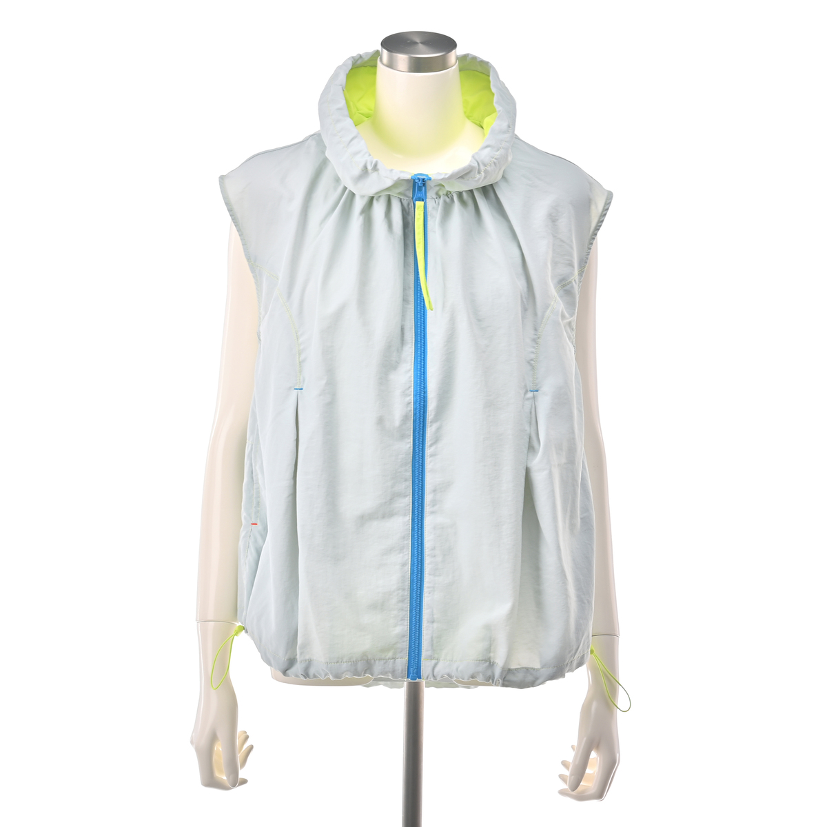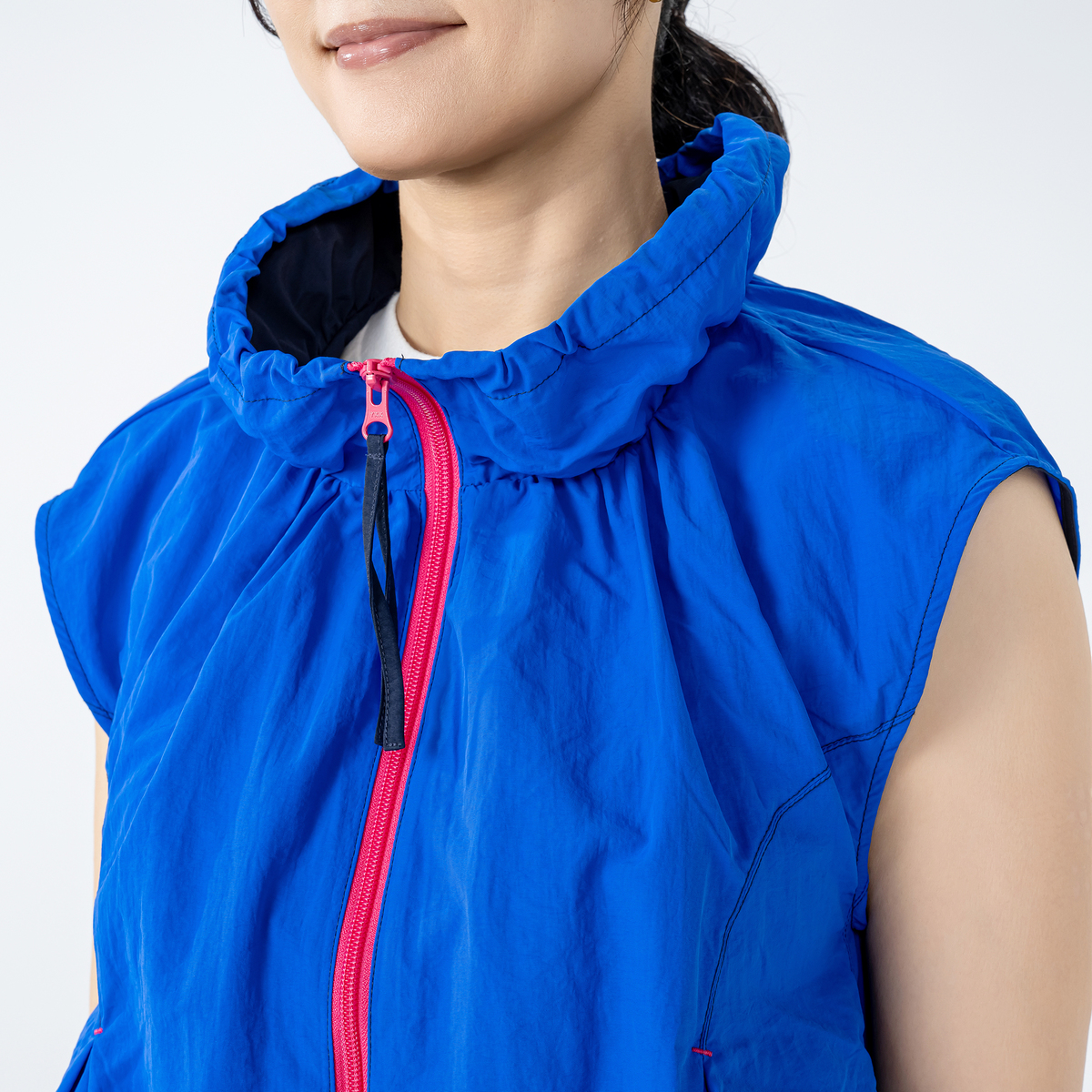 スピンドルとギャザーのテクニックを駆使した、立体的でデザイン性に富んだジレ。特にこだわった衿元には、やや高めのハイネックの後ろ側にスピンドルを付けることで、ボリューム感を持たせ、ふんわり丸みのある形に仕上げました