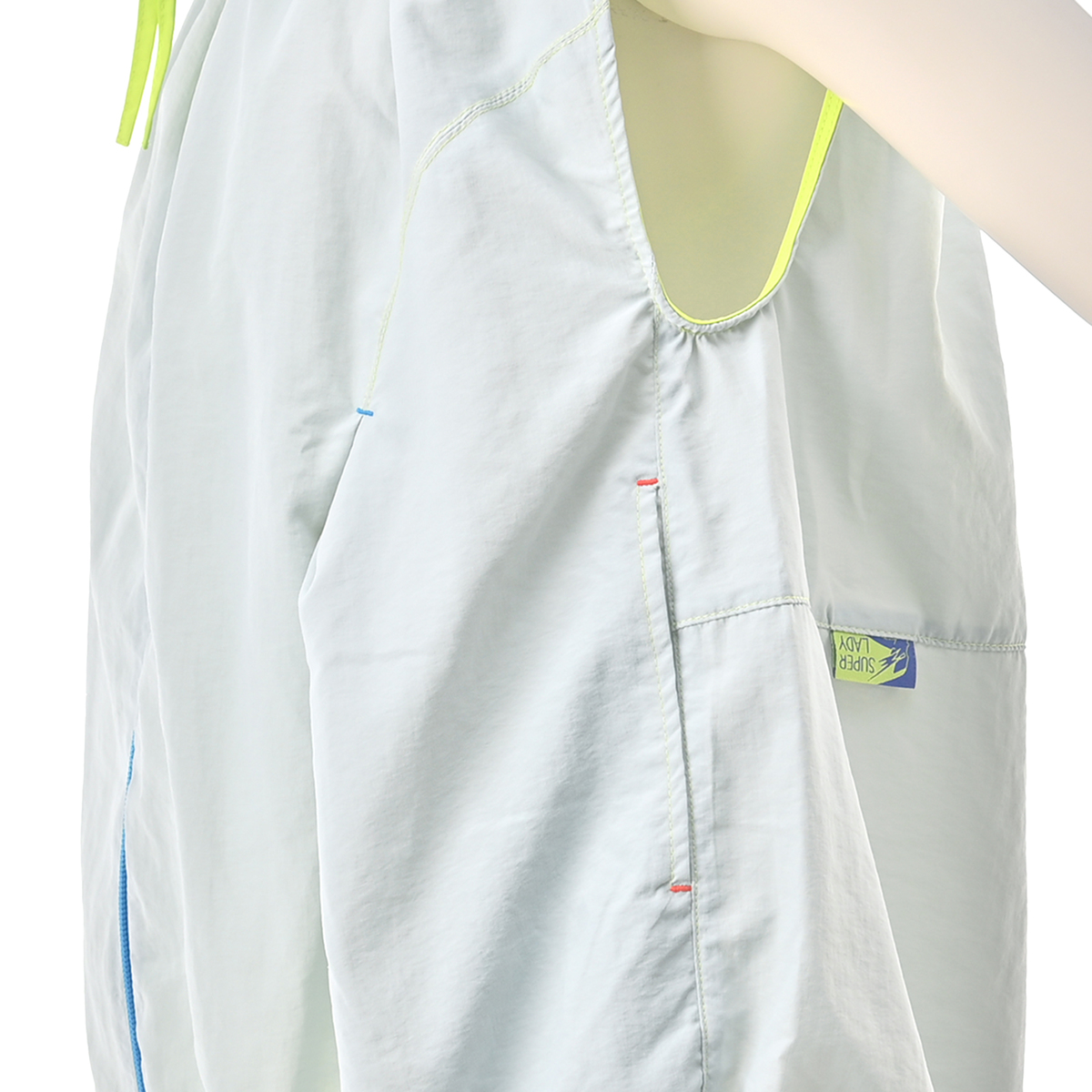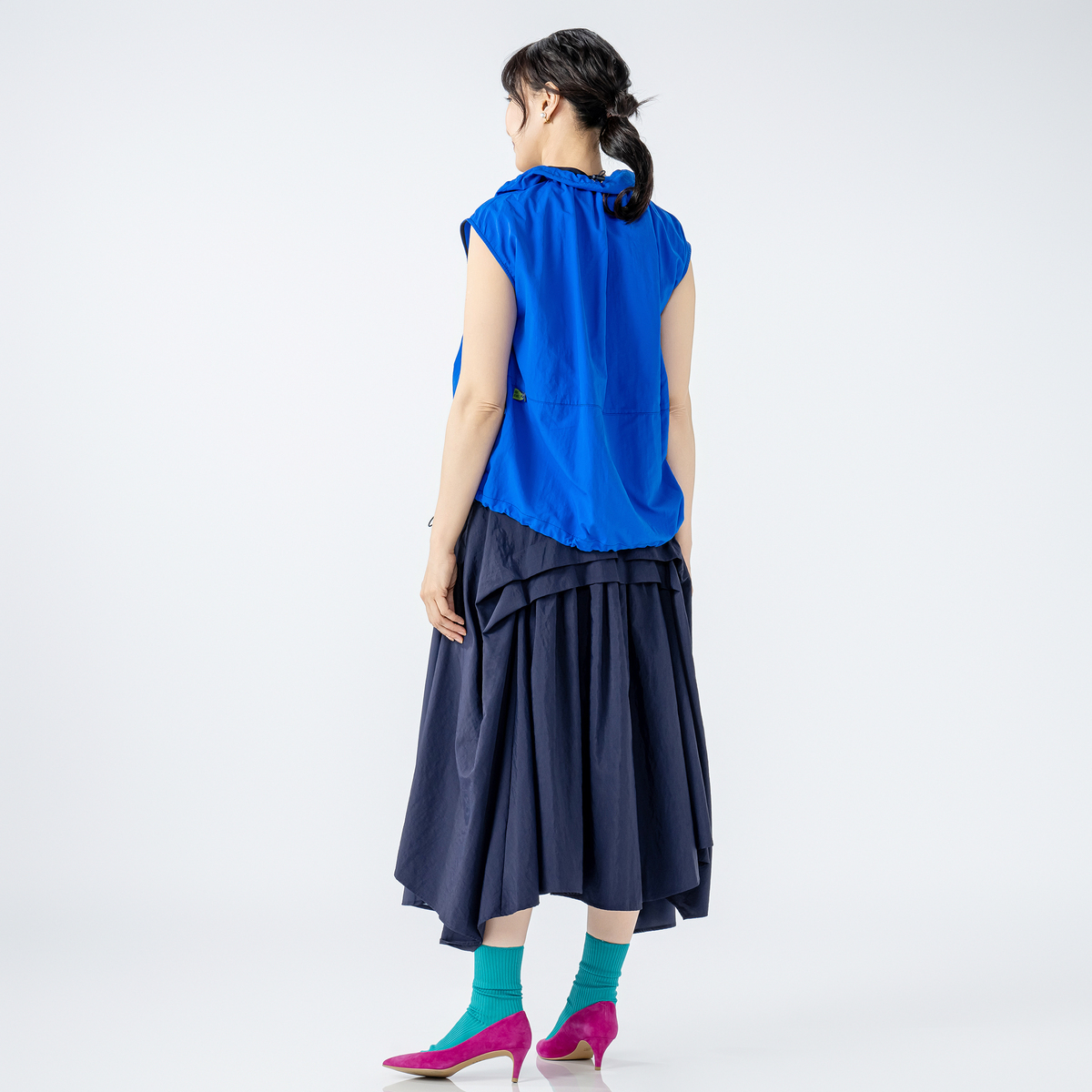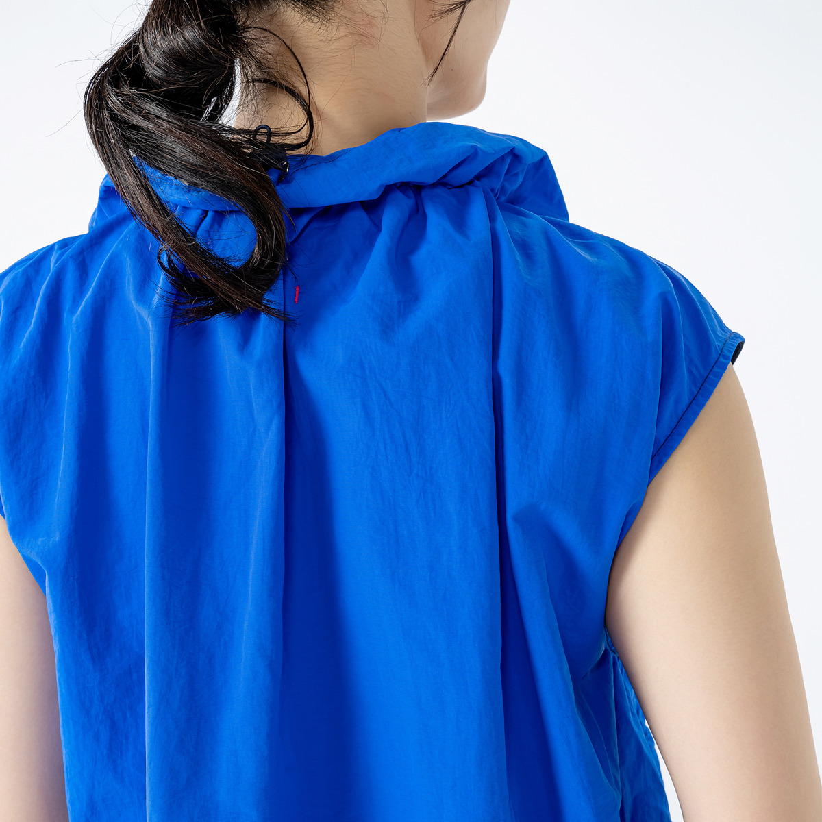 前身頃にはタックを取ってふわりとギャザーを出し、裾はスピンドルを絞めればコクーンシルエットに。随所に効かせた配色アクセントがSUPERLADYらしい1枚となっています。春、夏、秋と幅広いシーズンに着回していただける便利なアイテムです