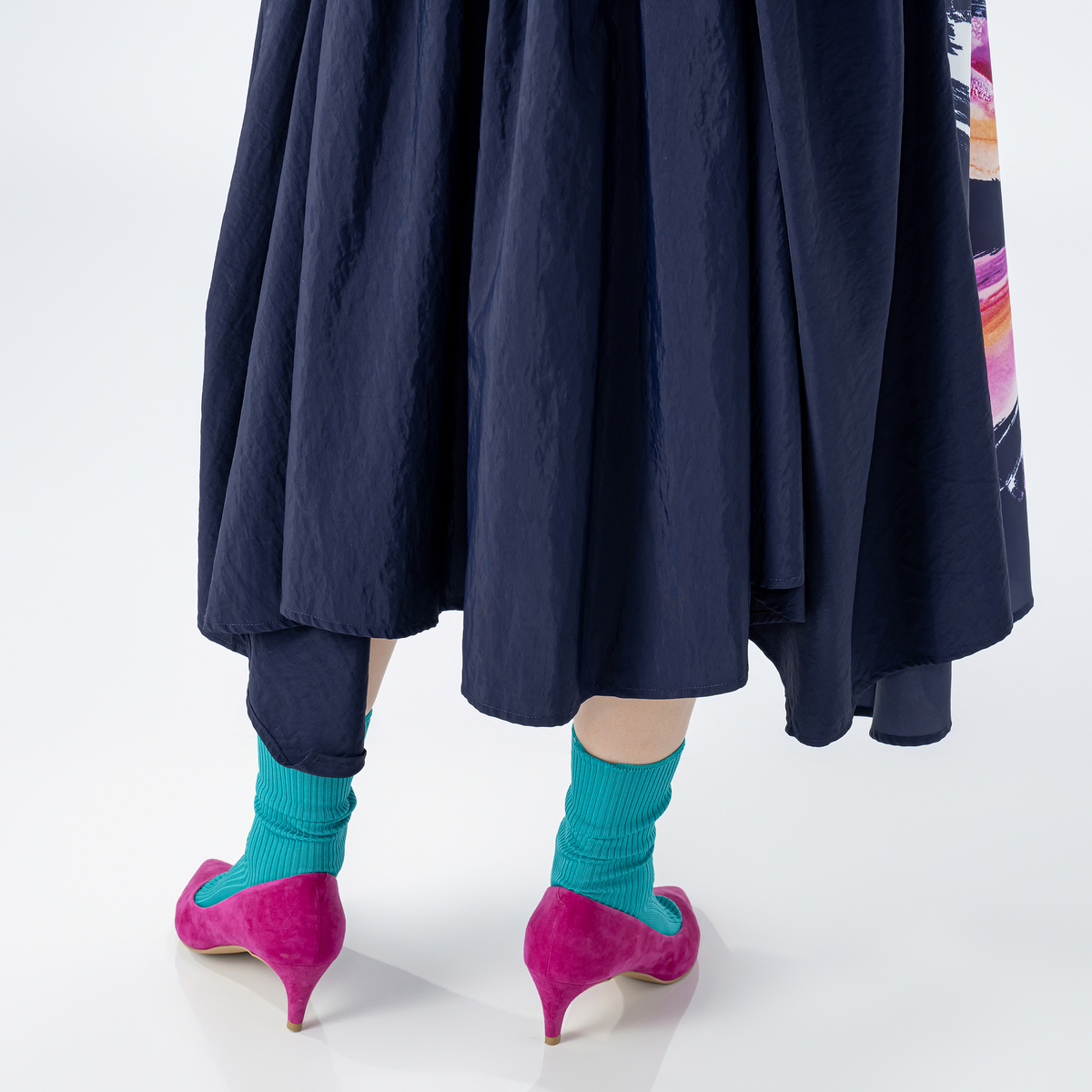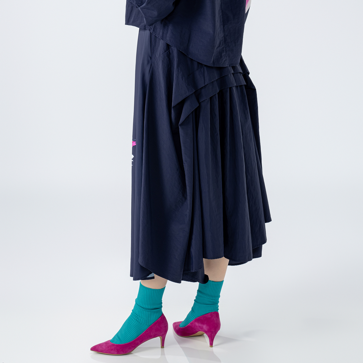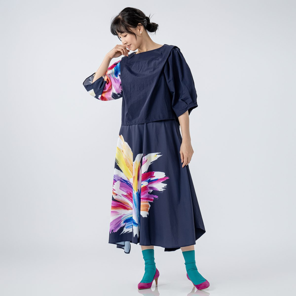 大胆なフラワープリントが目を惹くスカート。右サイドから後ろにかけてタックアクセントとギャザーを施し、立体感のあるゴージャスなデザインに仕上げました