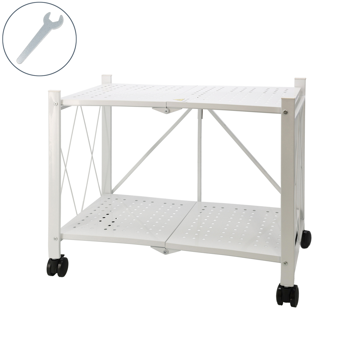 [商品内容] ・本体 ・工具(スパナ) [サイズ(約)] 幅62×奥行36×高さ52cm 折り畳み時:幅9.5×奥行36×高さ77.5cm [重量] 約 3300 g [材質] スチール、合成樹脂、他 [耐荷重量] 約 53 kg(棚1段あたり 約 26.5 kg) [可動棚数] 2 [注意事項] ※本品展開は十分なスペースを確保してから行ってください ※安全のため、展開作業は2名以上で行うことをお勧めします ※本品の棚やフレームが交差する個所に指を挟まないよう十分に注意してください ※傾いたところや不安定な場所では使用しないでください。本品が転倒する恐れがあります ※火気の近くで使用しないでください。本品や収納物の加熱、火災の原因になります ※本品に乗ったり踏み台にしないでください。また、子供に本品で遊ばせないでください。怪我をする恐れがあります ※本品は屋内で物品の収納を目的とした製品です。屋外での使用は想定していません ※耐荷重量よりも重いものを収納しないでください ※耐荷重量の範囲内であっても、本品の形状に歪みや変形等が見られた場合は、直ちに収納物を下ろし、本品の使用を中止しください ※転がったり安定しない形状のものは、本品に収納しないでください。本品から落下し破損する恐れがあります ※本品を移動させる際は、落下・転倒を避けるため一旦収納物を下ろしてください。また、キャスターのストッパーを解除して、ゆっくり慎重に移動してください ※本品の下段が空の状態で、上段に重量物を乗せないでください。本品の重心に偏りが生じ、上段の重量物が落下したり、本品が転倒する恐れがあり、怪我や破損の原因になります ※浴室や洗面所等、常に水のかかる場所では使用しないでください。また、濡れた衣類等を置かないでください。サビ発生の原因になります ※汚れた場合は乾いた布でやさしく拭き取ってください ※汚れが酷い場合は、濡らして固く絞った布で拭いてください ※ベンジンやシンナーなどの溶剤や研磨剤を含む洗剤は使用しないでください ※廃棄する場合は、各自治体のルールに従って廃棄してください 【中国製】