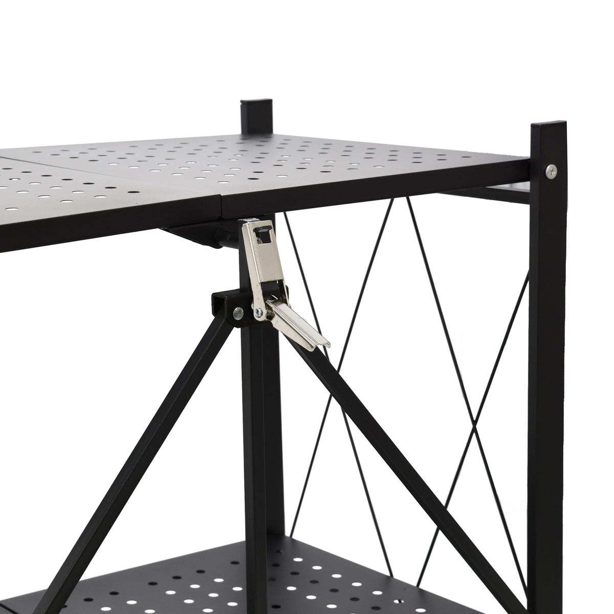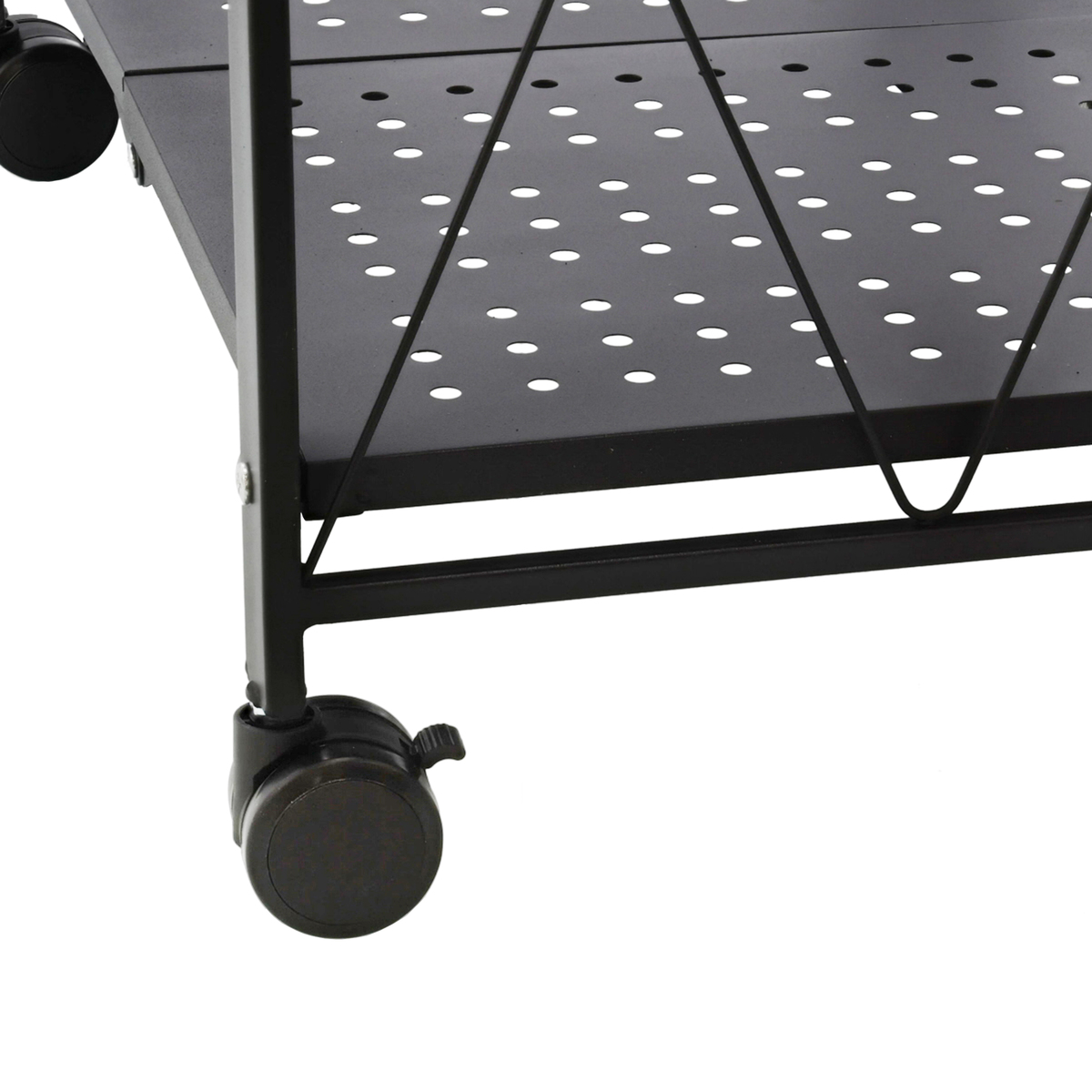 キャスターも付いた完成品でお届けする、折り畳める収納ラック。開梱後、本体をゆっくり開き、棚を固定すればお使いいただけます