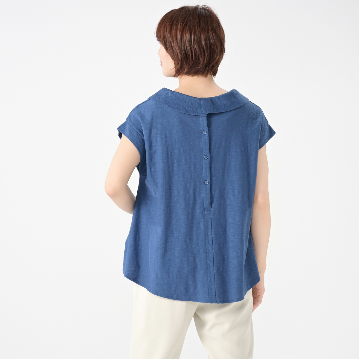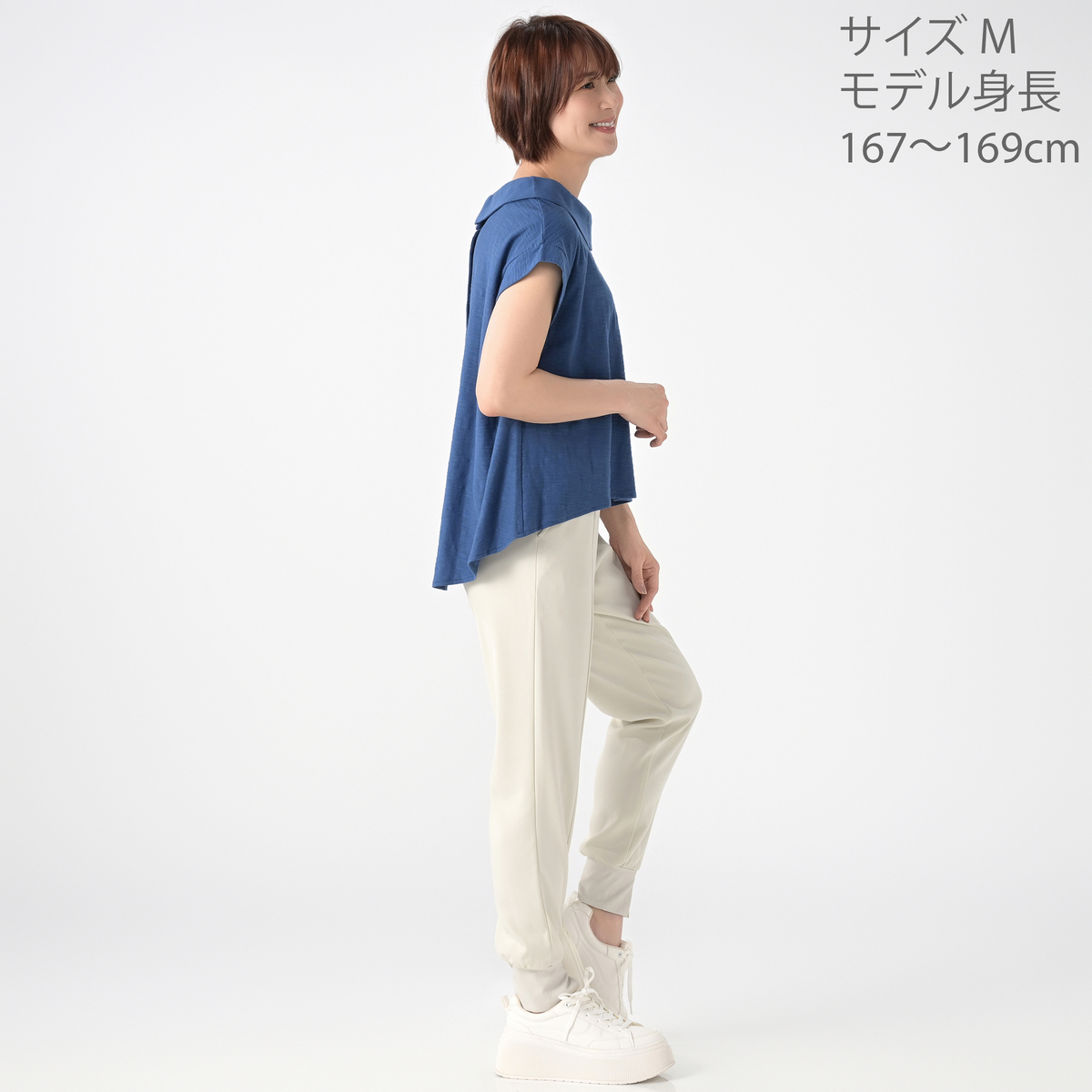 同じ生地のトップスを購入してとても着やすくて涼しかったのでこちらも購入しました。襟元のロールカラーがなんとも素敵です。袖丈が短めに感じたので最初はLにしようと思っていましたがクミさんの着用の説明でMサイズを選び直して正解でした。ゆったりとした身幅なのでMでも風をはらんで涼やかに着れます。細かいディティールもとても凝っていてお気に入りです
