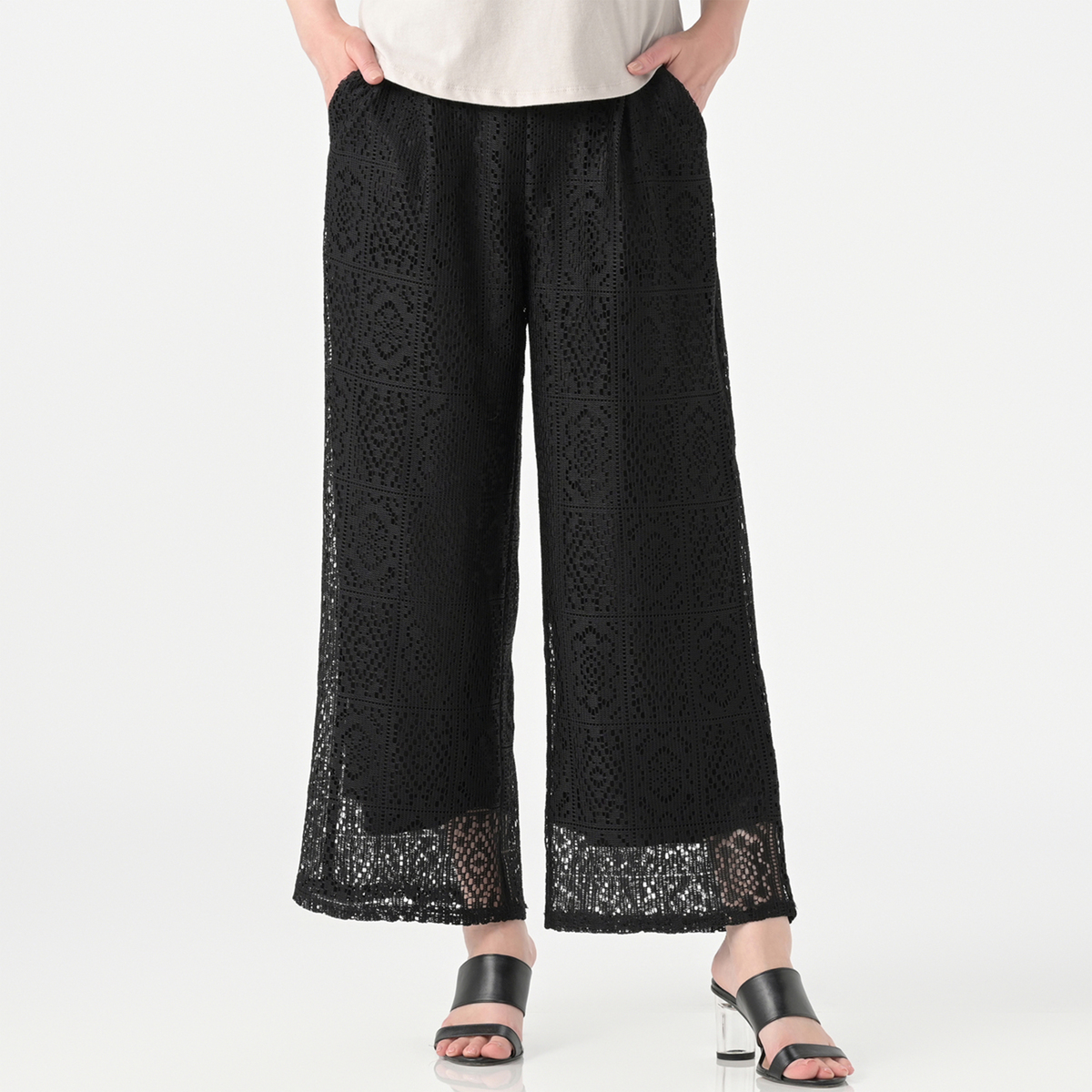 スッキリ見えるセミワイドシルエットで、さまざまなアイテムに合わせやすいデザイン。花柄のレースがスタイリングを華やかに演出します