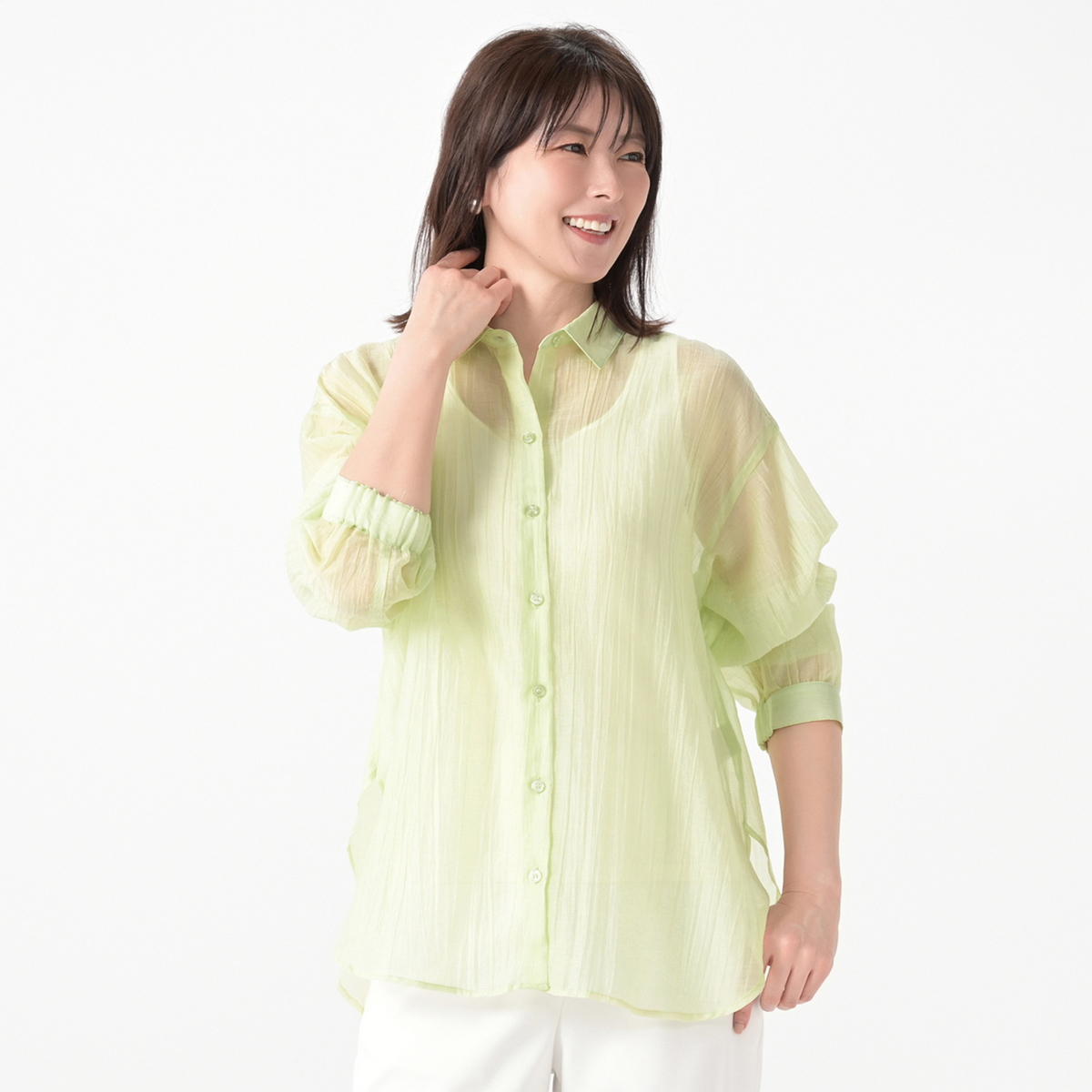 トレンド感のあるレイヤードスタイルに活躍してくれる、ゆったりシルエットのシアーシャツ。袖口は半分ゴム仕様で腕まくりしやすくなっています