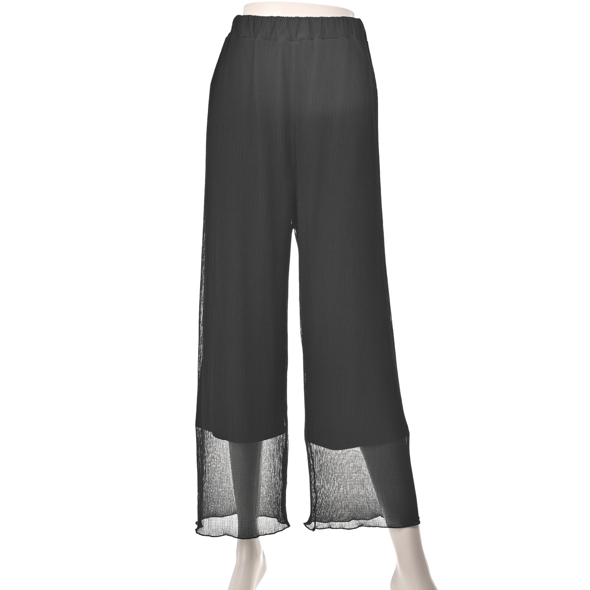 とろみのある柔らかなシアー生地のパンツ。凹凸のあるランダムなプリーツが表情豊かで、ストンと落ちて揺れる軽やかな動きがニュアンスのあるモード感をプラスします