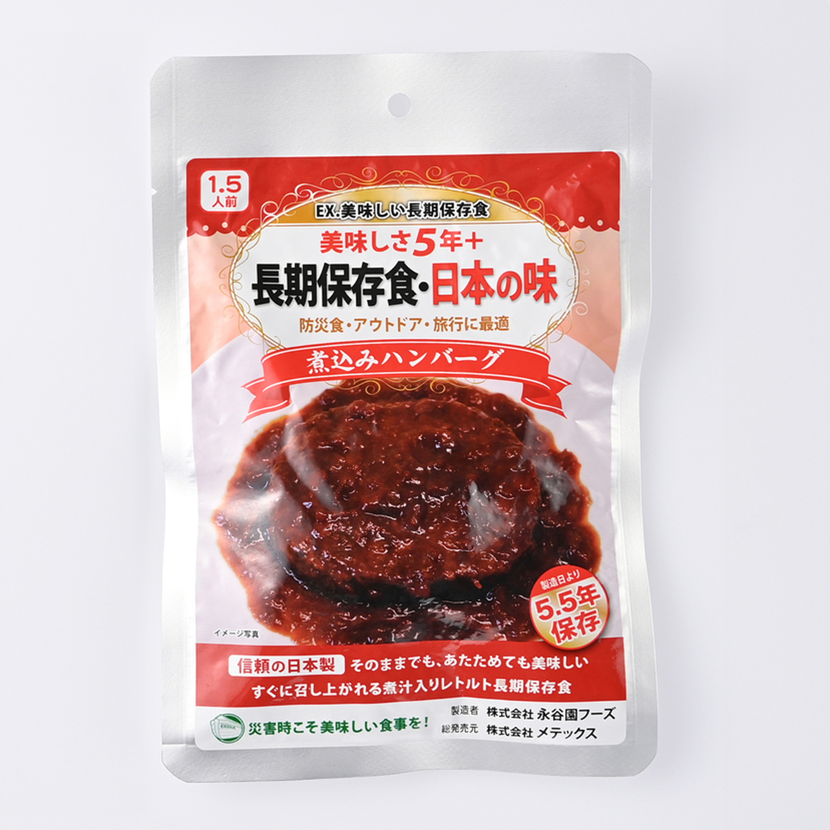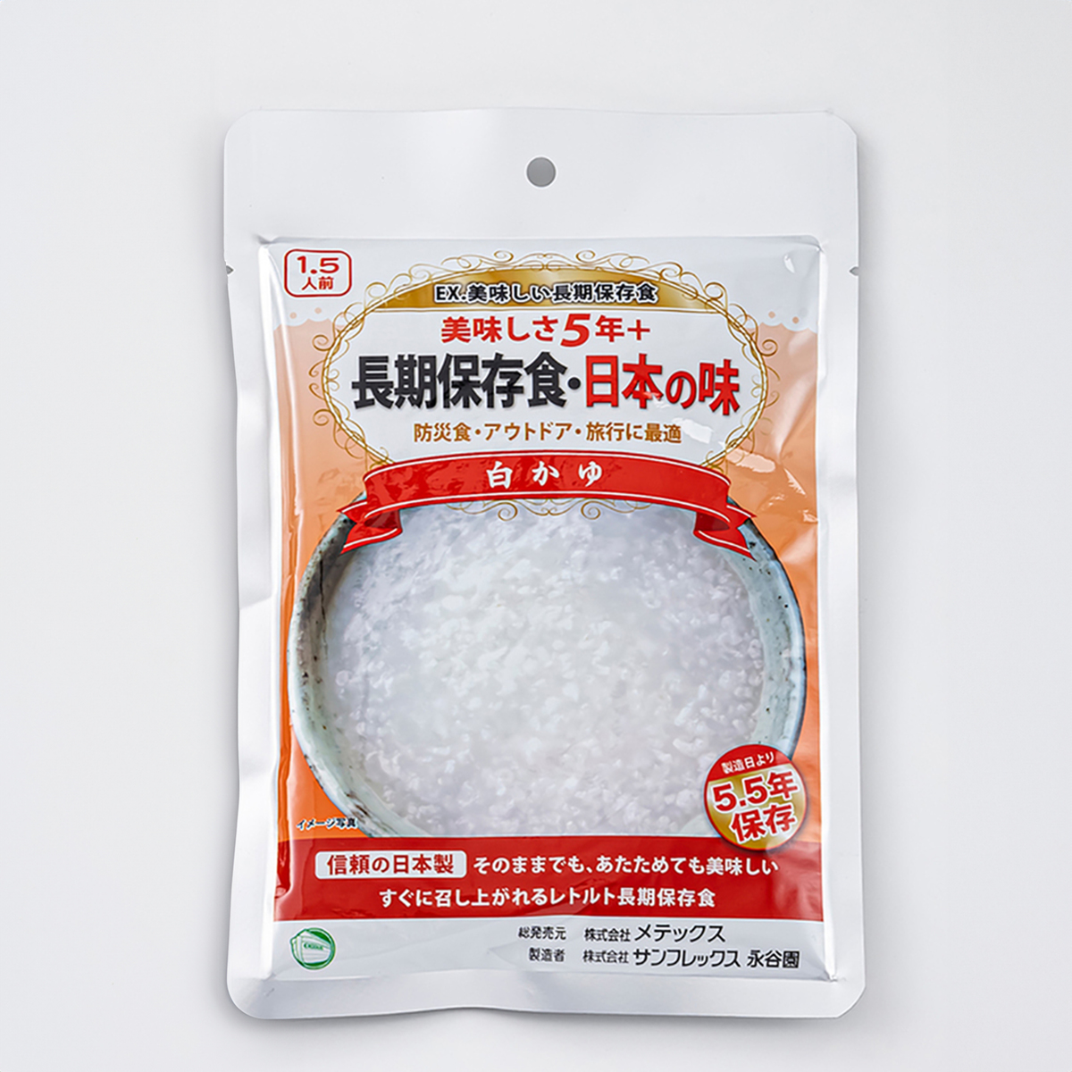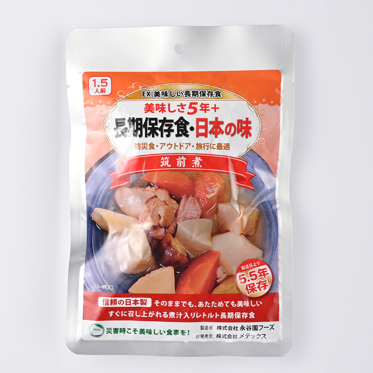 長期保存(*3)できる保存飲料水をはじめ、封を開ければそのままでも食べられるおかゆやハンバーグ、筑前煮をセット。食品を温められる発熱剤や加熱袋も同梱しています。甘味には氷砂糖を用意しました