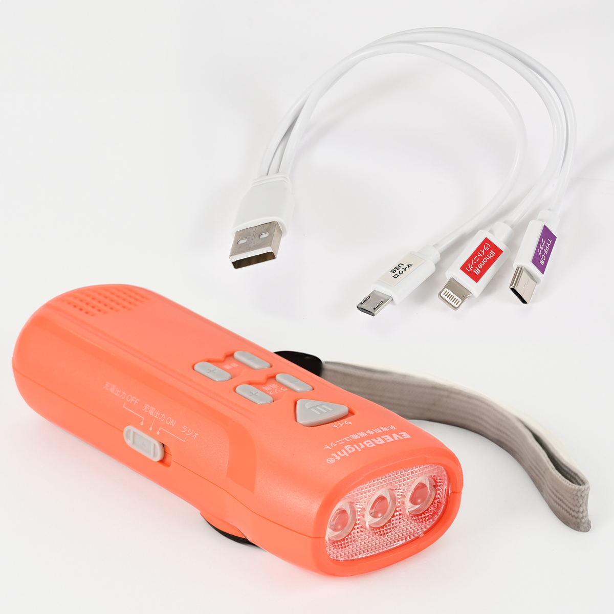 多機能自家発電ラジオ・ライトは、LEDライトやFMラジオ付きで、携帯電話の充電もできる多機能モデルです(*2)