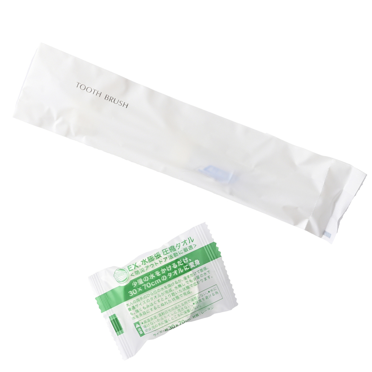目隠しや風除けにも活用できるゴミ袋や、水に浸すと自然に膨張し、ほぐすとタオルになる圧縮タオルも入っています