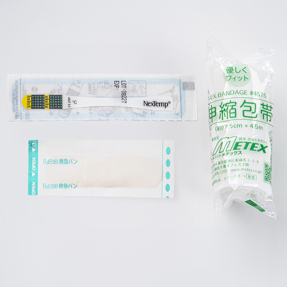 ちょっとした擦り傷や切り傷に便利なガーゼ付き救急絆創膏や包帯、トイレットペーパーも。簡易トイレセットは凝固剤でゼリー状に固め、臭いを包みます