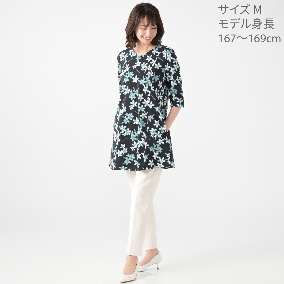 長めの丈感で、気になる体型も上手にカバー。首元はVネックで、お顔まわりをすっきりと見せてくれます