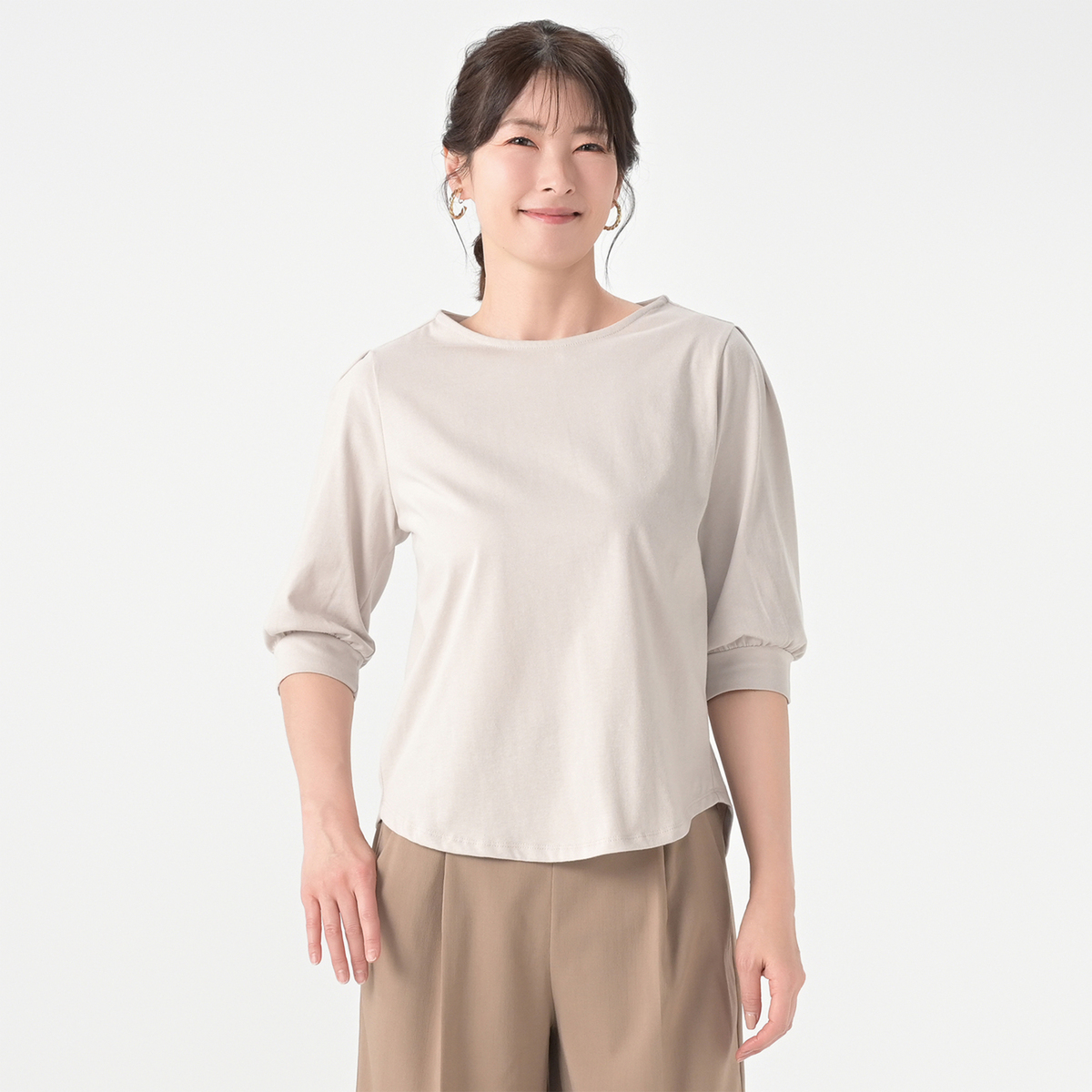 ふんわりとした袖がシルエットを整え、二の腕を華奢に見せるプルオーバー。脇から裾にかけて前振りのデザインで細見え効果にも期待でき、インでもアウトでも使えるカーブ裾でデイリーに活躍します。軽やかなセミシルケット加工なので、きれいな目面がキレイめシンプルなデザインを際立たせます