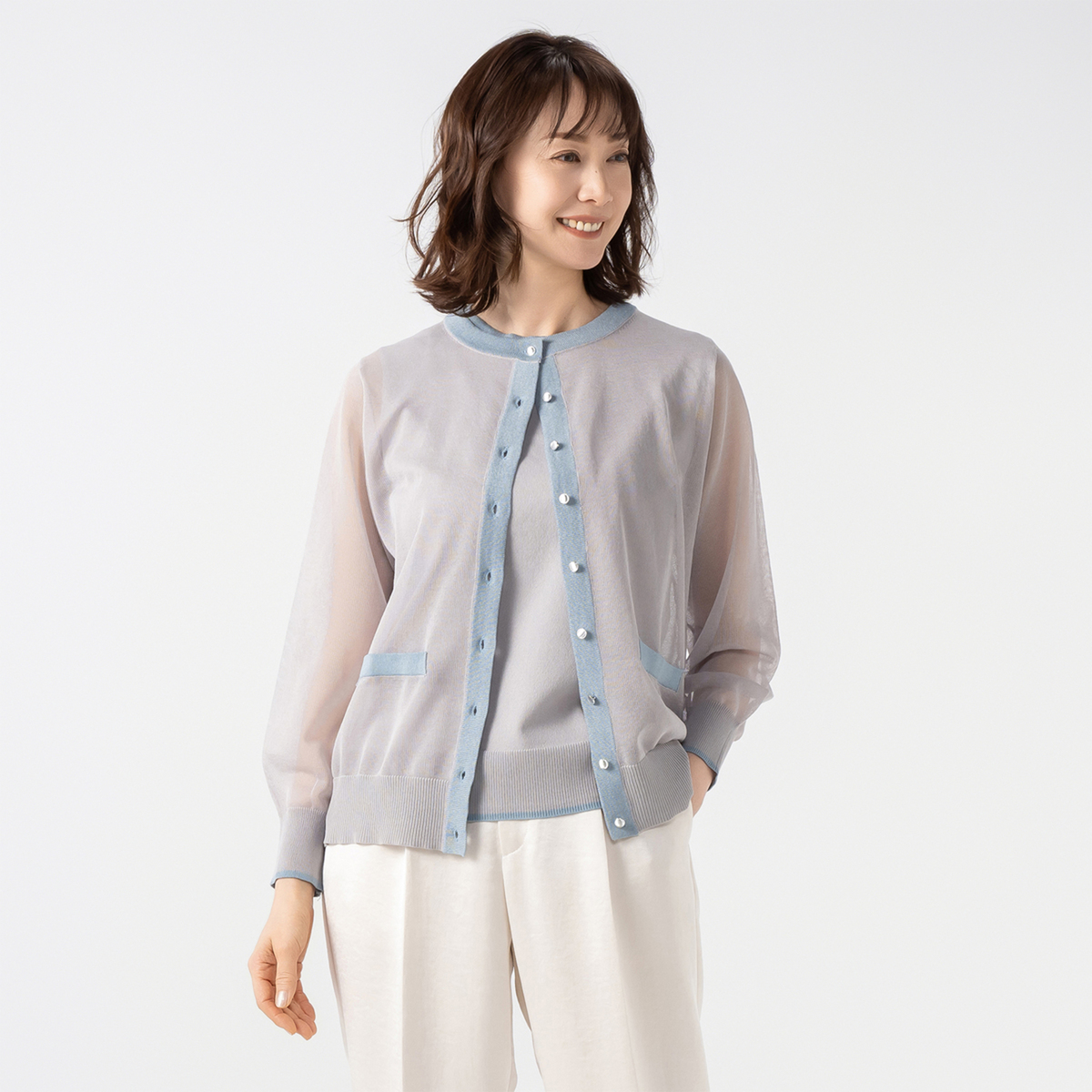 シアーなカーディガンを組合せたニットアンサンブル。大人に似合う、落ち着いたトーンの配色デザインに仕上げました
