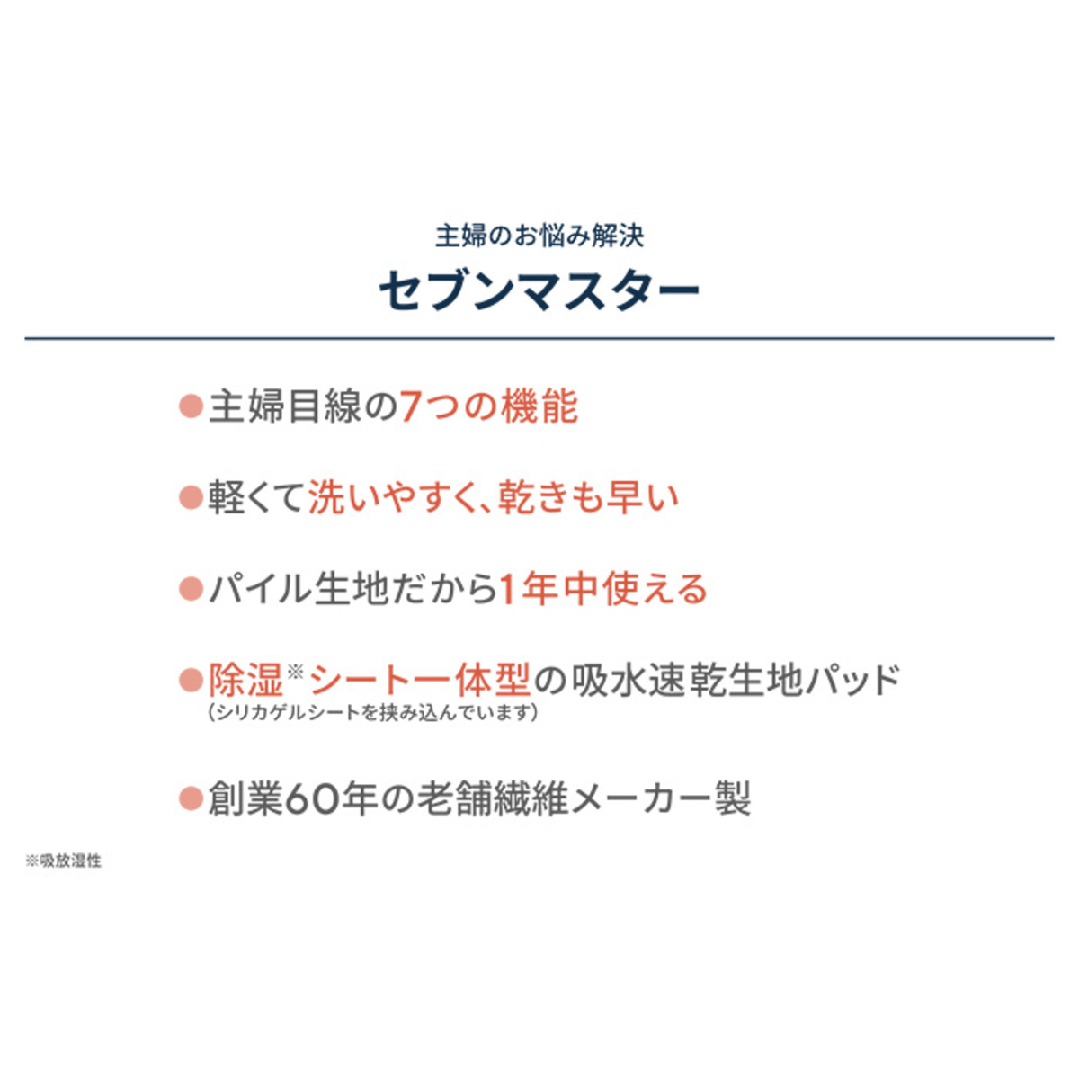[商品内容] ・セブンマスター ・吸湿センサー [サイズ(約)] シングル :100×205cm セミダブル:120×205cm ダブル :140×205cm [重量(約)] シングル :1280g セミダブル:1540g ダブル :1790g [素材] 表側:ポリエステル90%、綿10% 裏側:ポリエステル100% 詰め物:ポリエステル100%、シリカゲル [お手入れ] 洗濯機洗い可 ※お洗濯は吸湿センサーを抜いてからおこなってください [注意事項] センサーについて:配送時の環境によりセンサーがピンクになる場合がありますが、センサー自体の機能に影響はありませんので、御使用前に一度乾燥させ、ブルーに戻してから御使用ください。同封の乾燥剤は不燃物として処理してください。(センサーの乾燥剤として使用していますので、開封後は不要となります) ※本来の用途以外に使用しないでください ※商品の特性上、若干のサイズ誤差があります ※お洗濯は吸湿センサーを抜いてからおこなってください ※お洗濯の際は本体に縫い付けの洗濯方法をよくご確認ください ※お洗濯は吸湿センサーを抜いてから行ってください ※お洗濯の際は本体に縫い付けの洗濯方法をよくご確認ください ※洗濯後、形を整えて直ちに干し、よく乾燥させてください ※乾燥機などのご使用はお避けください ※本商品は梱包してお届けするため、原料などの臭いがこもる場合があります。洗濯や陰干しなどを一度おこなってからのご使用をおすすめします ※センサーはビニール袋から出してご使用ください。 ※吸湿センサーの中間部分がピンク色になりましたら天日干しをしてください ※天日干しをして頂くことでまたブルーに戻ります(センサーの色が変化しなくても2週間に1度の目安で天日干しをしてください) ※天日干しで湿気を放出するため、繰り返しご使用が可能です 【中国製】