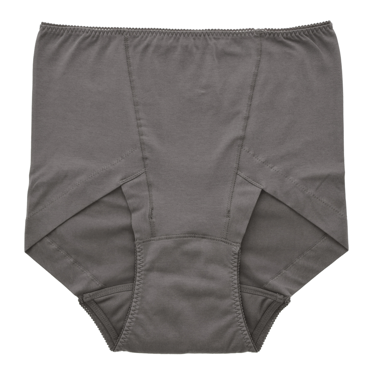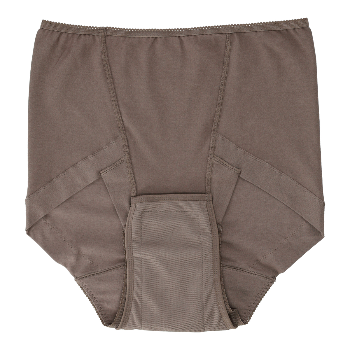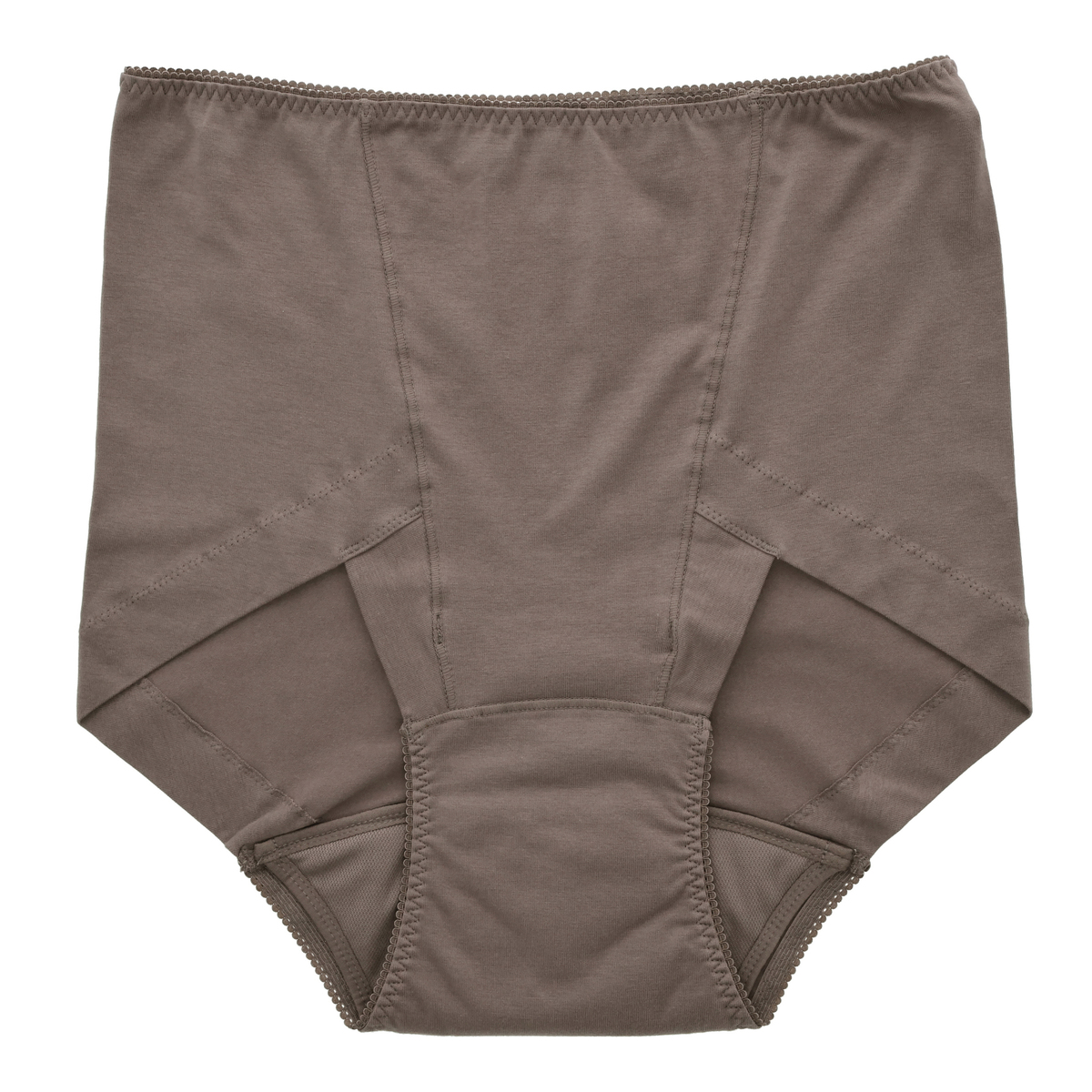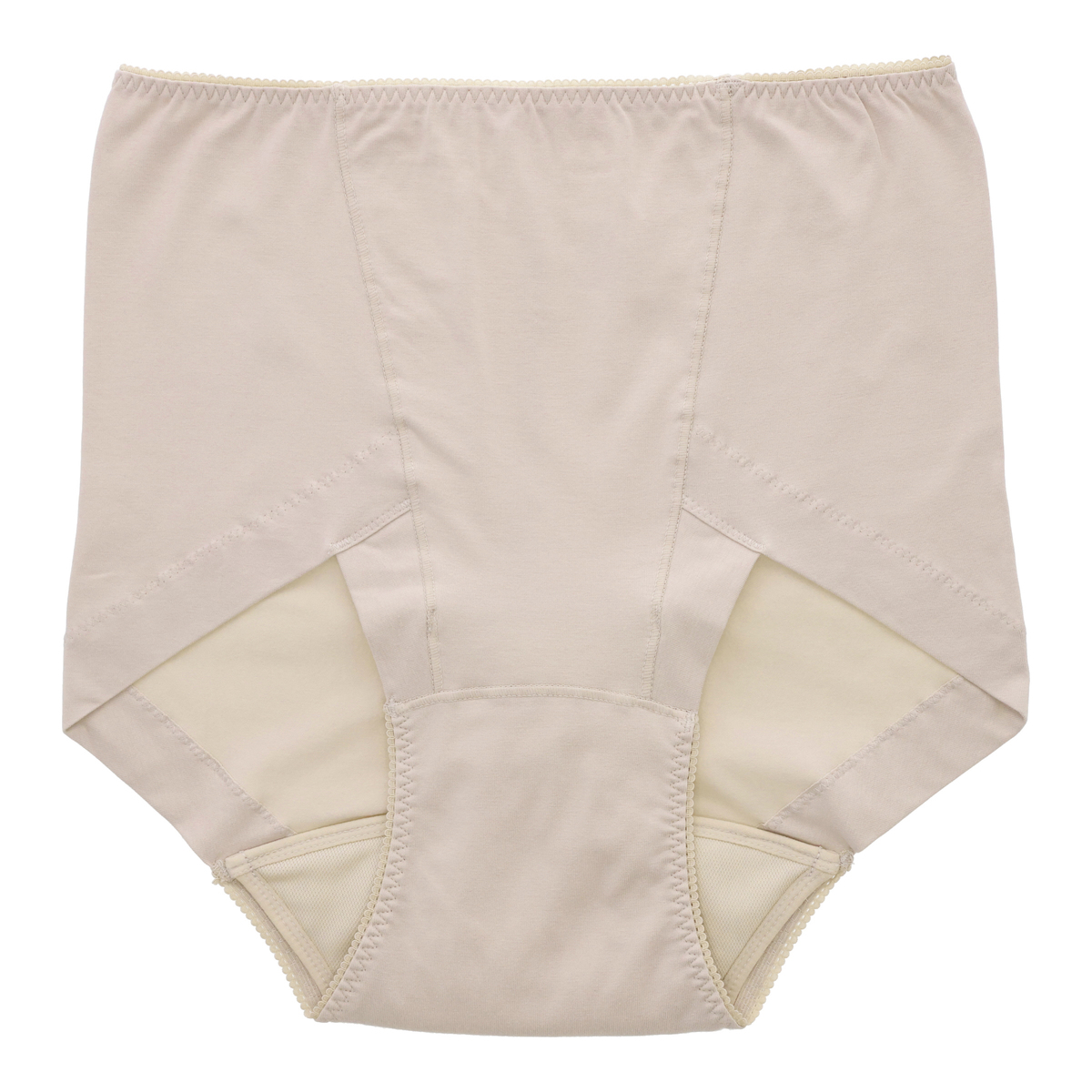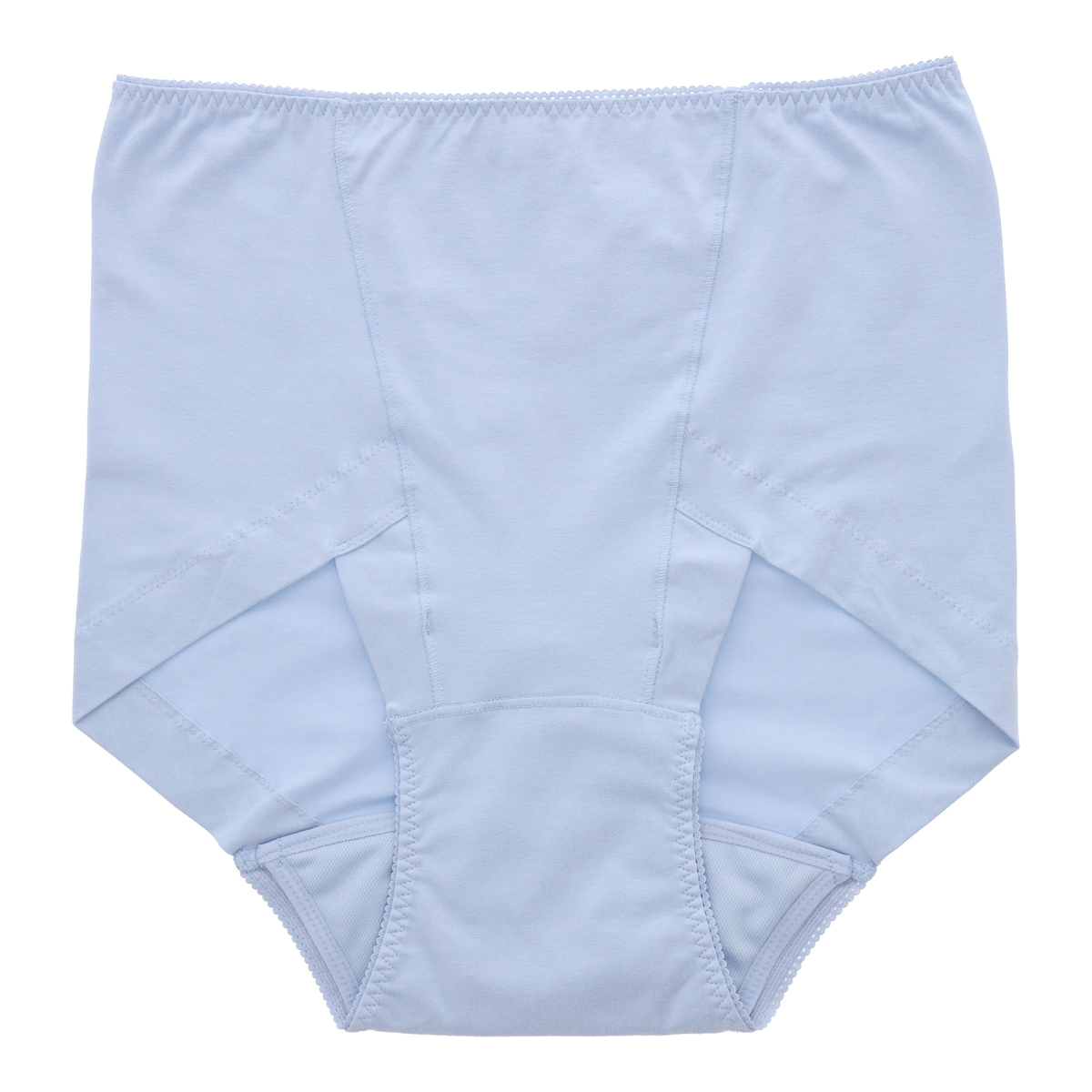 お腹、お尻まわりをスッポリ包み込む深ばきタイプの吸水ショーツ。身生地は穿き心地の良い綿混素材で、吸水パッドは吸水層や保水層、防水層などを重ねた5層構造。吸水量は滴下で35ml、加圧で30mlです。吸水部と身生地が同系色で目立ちにくく、薄型でごわつきにくくなっています