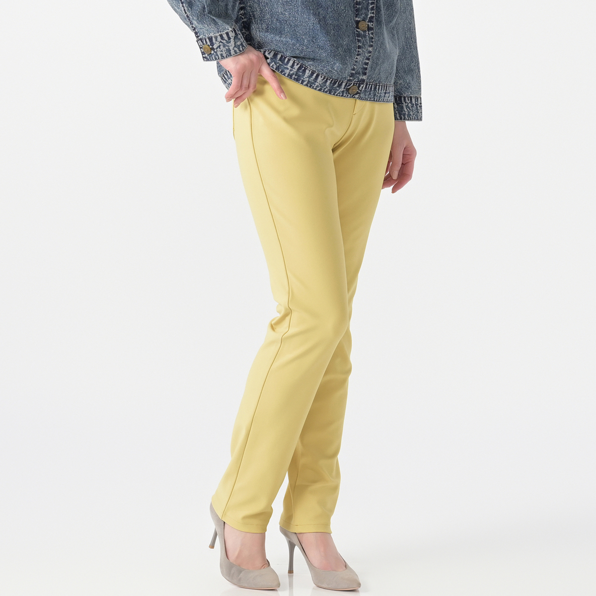 スリムながらもタテ・ヨコ・斜めのストレッチ性で締め付けを感じにくいパンツ。ウエストは総ゴム仕様の立体的な作りで、お腹まわりをすっぽり包んでくれます。ベルトはラインに合わせてゴムを入れているのでラクラク。お尻まわりにはダーツを入れて、よりキレイな丸みのあるヒップラインを演出します