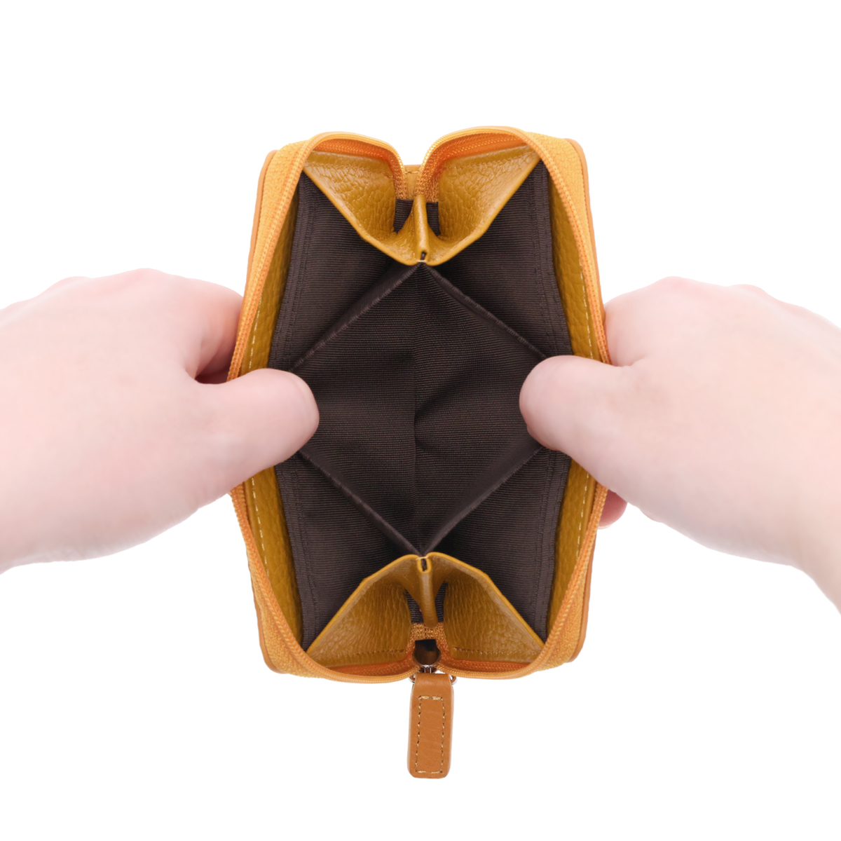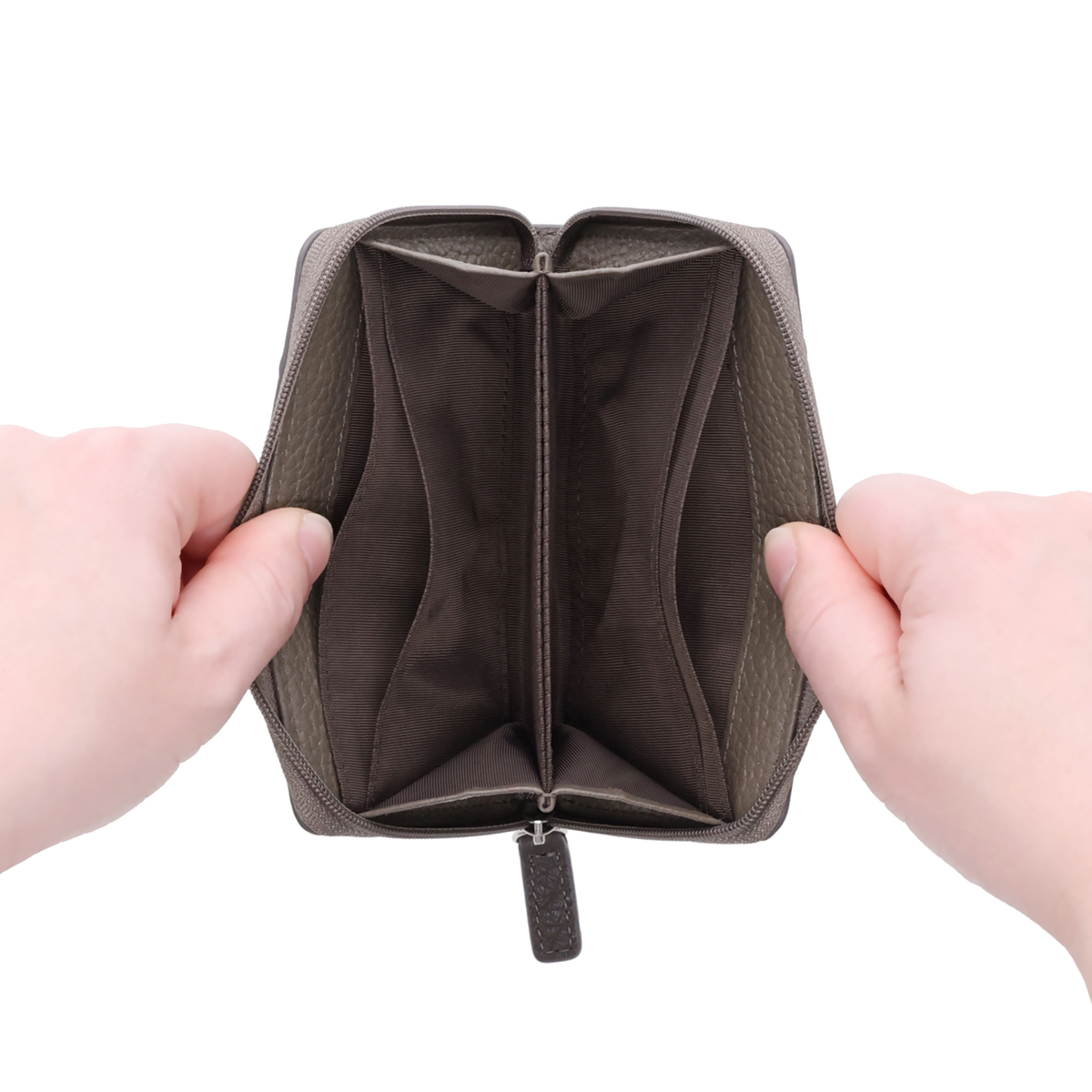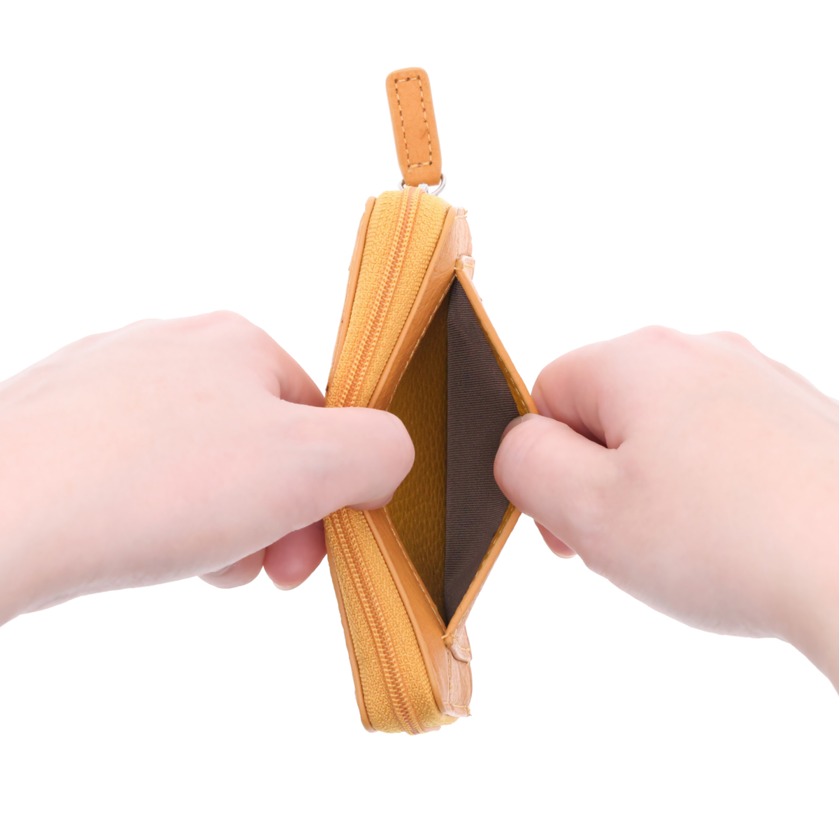 手のひらサイズで薄くてコンパクトですが、大きく開いて中が見やすい仕様。ファスナーを開閉すると小銭入れ、内側両サイドにカードポケット付きで、外側にもオープンポケットがあります
