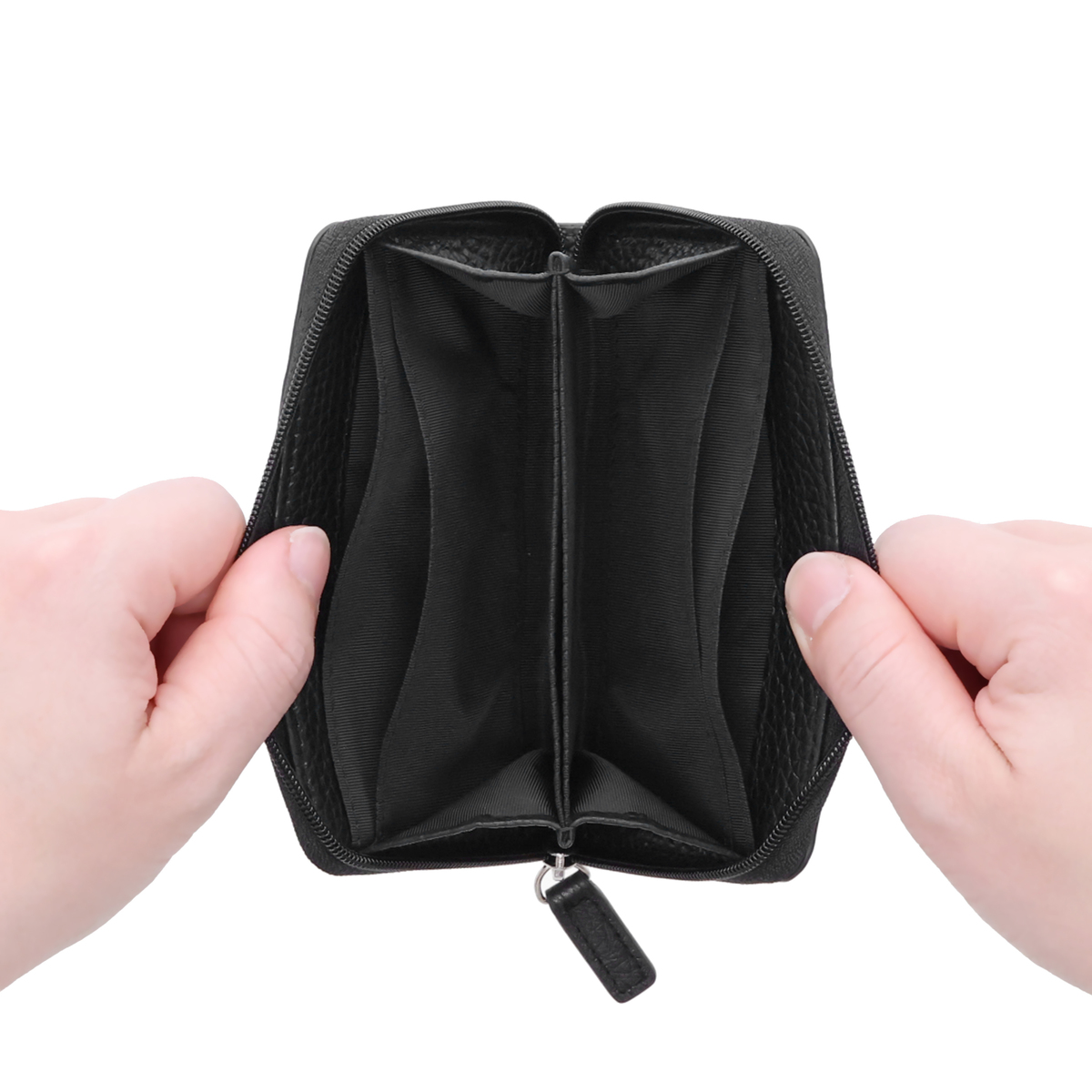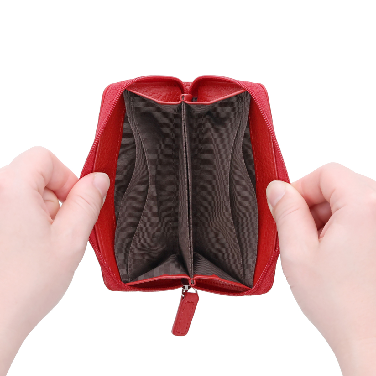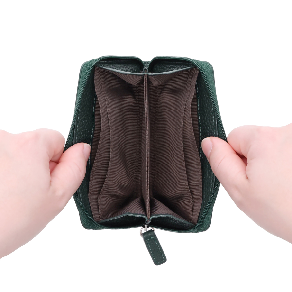 手のひらサイズで薄くてコンパクトですが、大きく開いて中が見やすい仕様。ファスナーを開閉すると小銭入れ、内側両サイドにカードポケット付きで、外側にもオープンポケットがあります