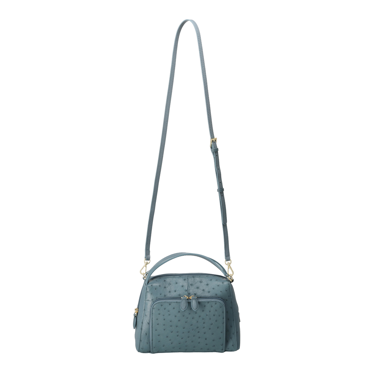 フルレザー仕立ての2WAYバッグ。本体前面、背面、マチ部分、ハンドルにオーストリッチ革を使用、底面と付属のショルダーストラップには牛革を使用しました。フルレザー仕立てでありながら、重量は約330gと軽量です