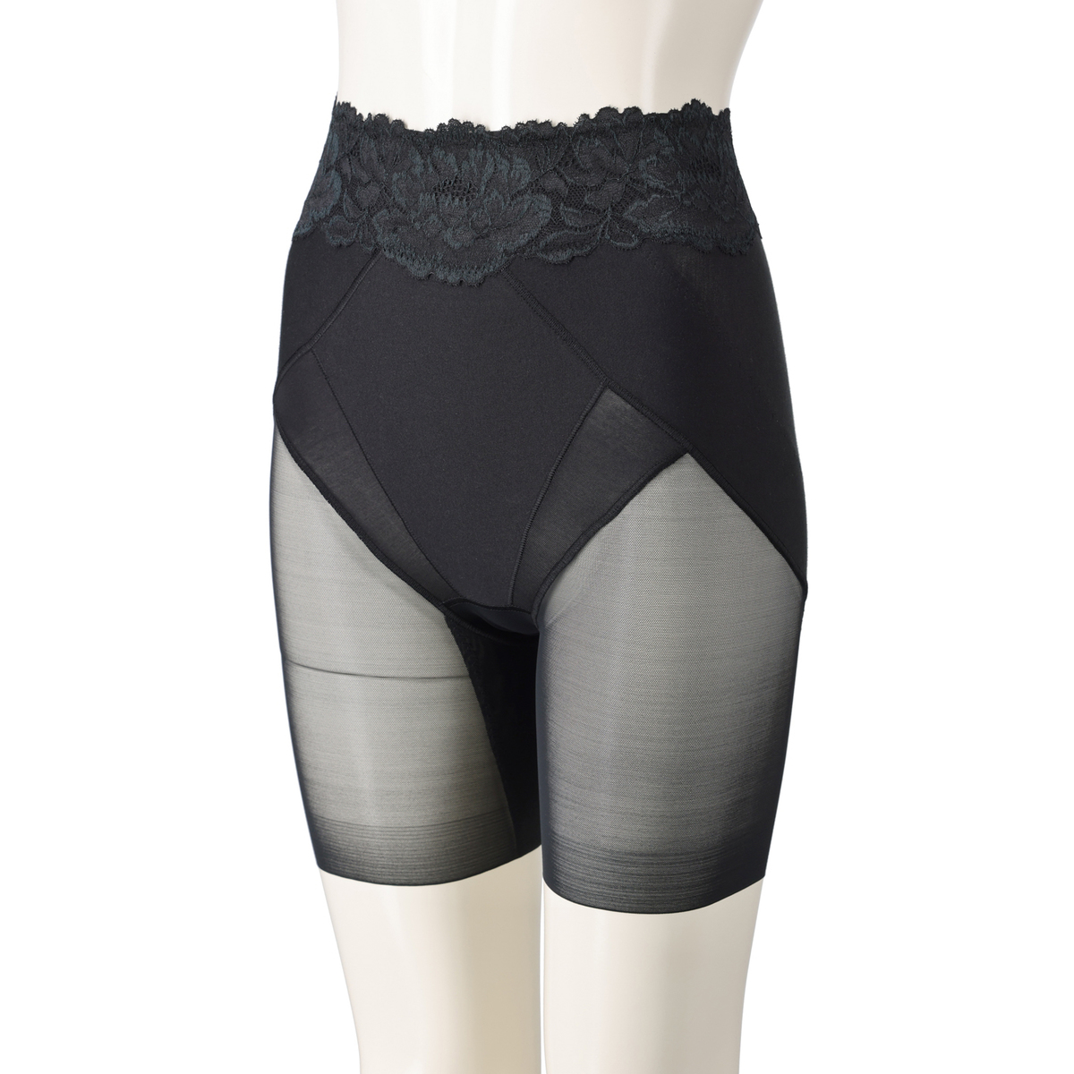 内ももからヒップ下のサイドに沿って施した、パワーネットの裏打ち"引き上げパネル"が、ウエスト方向へ引き上げて効果的にヒップアップ。太もも表部分には、一枚でサポート力の高いヘムパワーネットを使用。お腹押さえは身生地とパワーネットの三重構造です