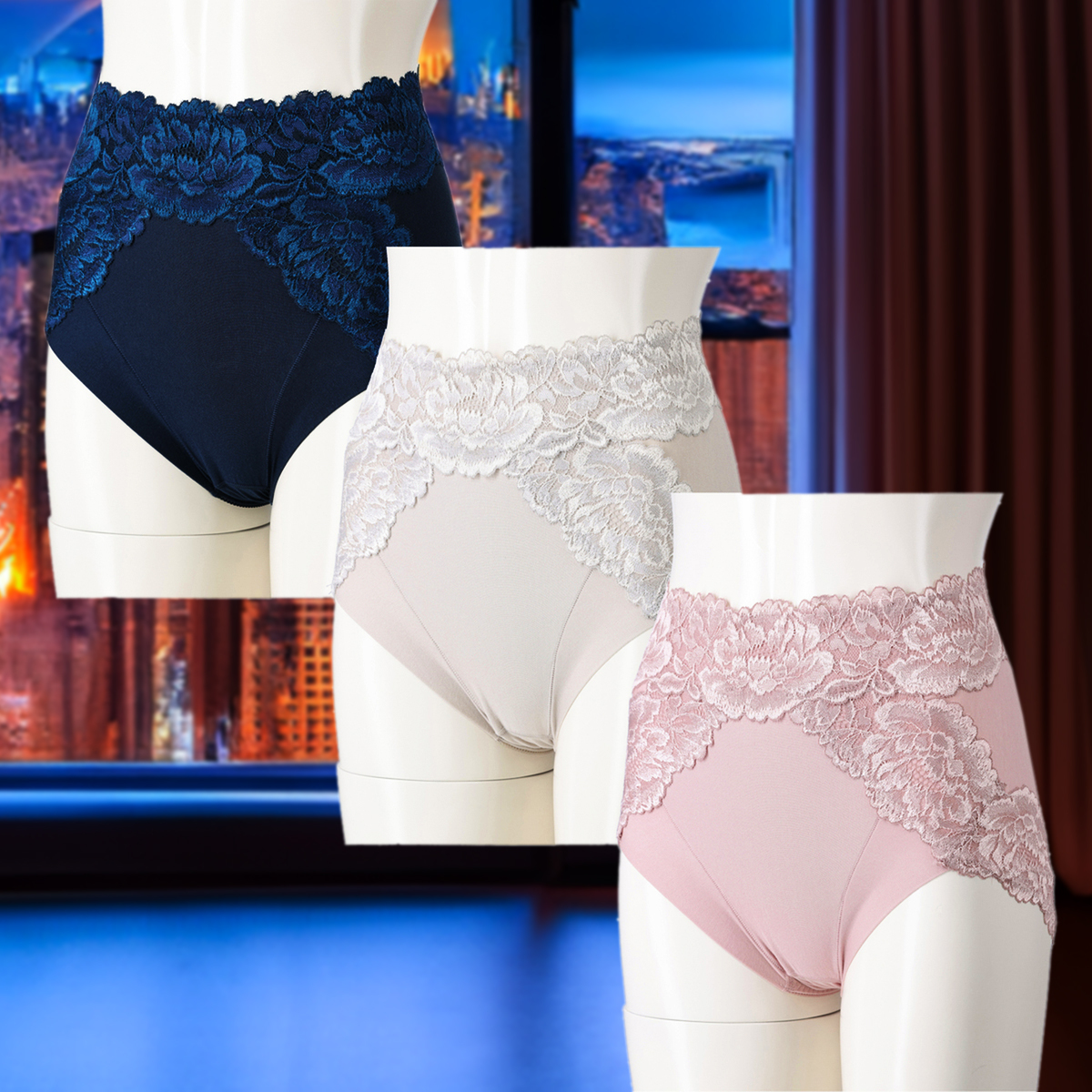 3パーツのパネルに切替えた立体設計。ストレッチレースの"引き上げトリプルパネル"*を、ヒップ下からサイドに沿って施しました。お腹押さえは身生地とパワーネットの三重構造です