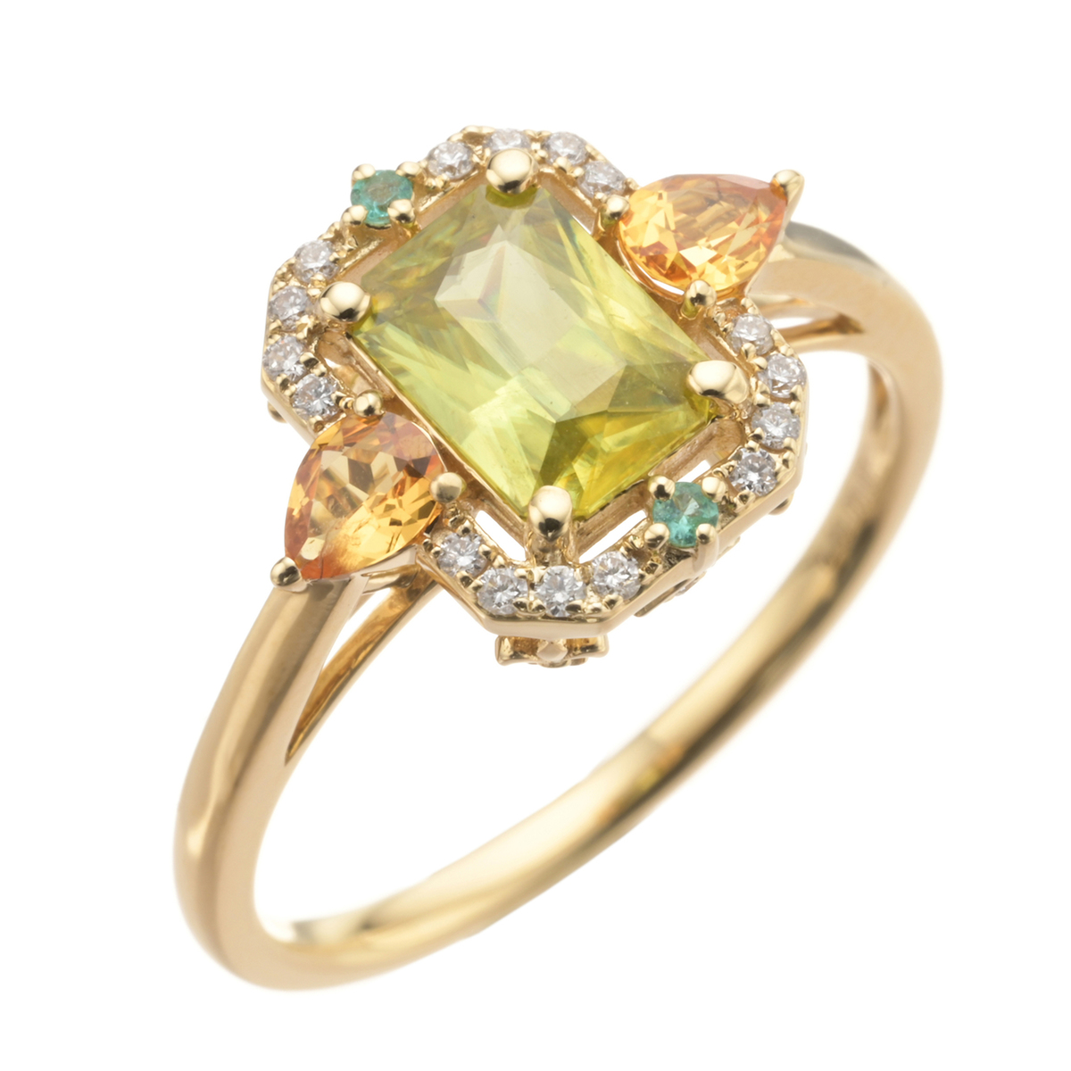 高い分散度が特徴のスフェーンを中心に、ダイヤモンドで取り巻いたリング。パライバトルマリンとペアシェイプのオレンジカラーサファイヤが虹色の煌めきを際立たせます