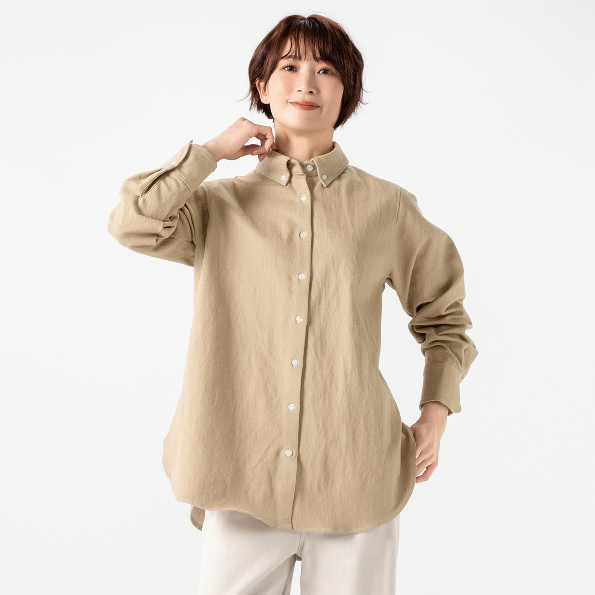 長めの丈で着やすいシャツジャケット。衿はボタンダウン、袖口はカフス付き、裾は大きくラウンドさせ,