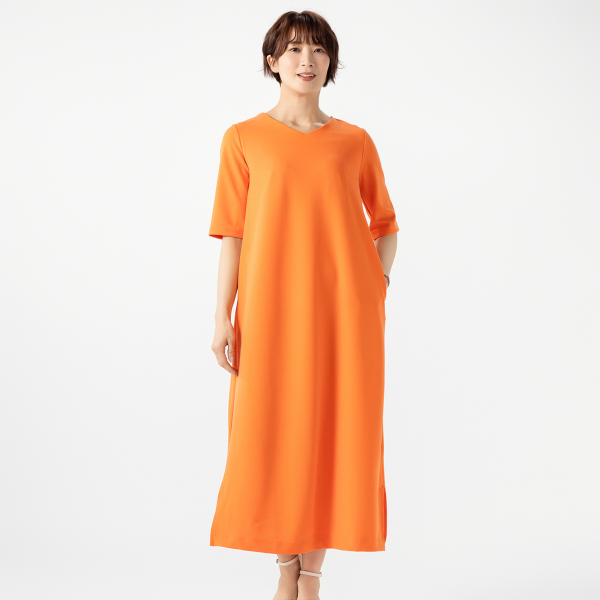 Vネック、セットインスリーブ、Iライン。程よいしっかりした生地感。日本人に1番多いのに似合う服が超絶売ってない骨ストのためのワンピースじゃん!やった!と2着購入しました。程よくストレッチ性があり、ほんとに骨ストさんによる、骨ストさんのためのワンピ。でもでも重くて厚い。私は肩幅がありすぎるのか、いかり肩すぎるのか、少し肩がきつい。胸からそのまま下に落ちるため、バストが大きい人はお腹周りが横にも前にも膨らんで見えます。これ、夏は暑くて絶対着れない。見つけた時の喜びが強すぎたのかな。残念です。