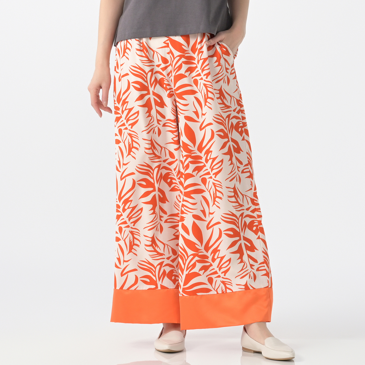 シックなデシン素材に大きな植物のプリントを施したワイドパンツ。裾には微光沢のサテンを組合せ、アクセントをプラスしました