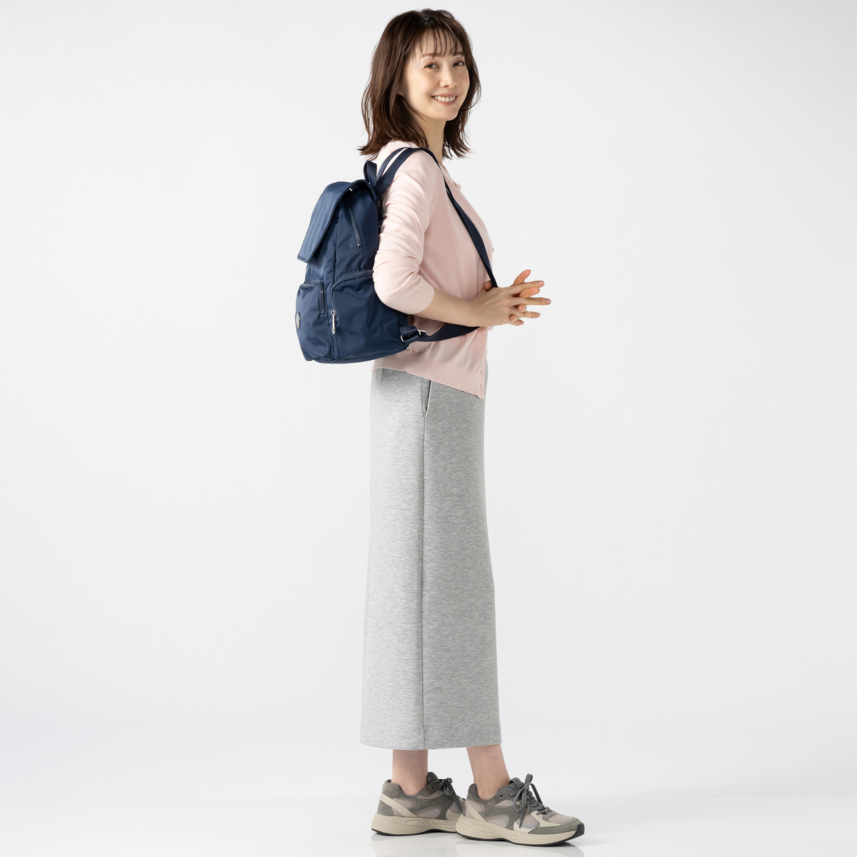 メインの開閉口が見えないかぶせ蓋。蓋部分から底に向けて奥行がだんだん広くなるかまぼこ型のマチ付で、見た目以上の収納力に。全方向にそれぞれ異なるポケット付きで、小物を整理して収納できます