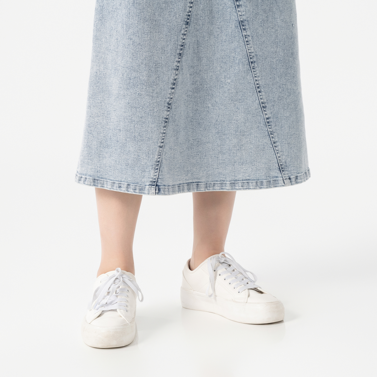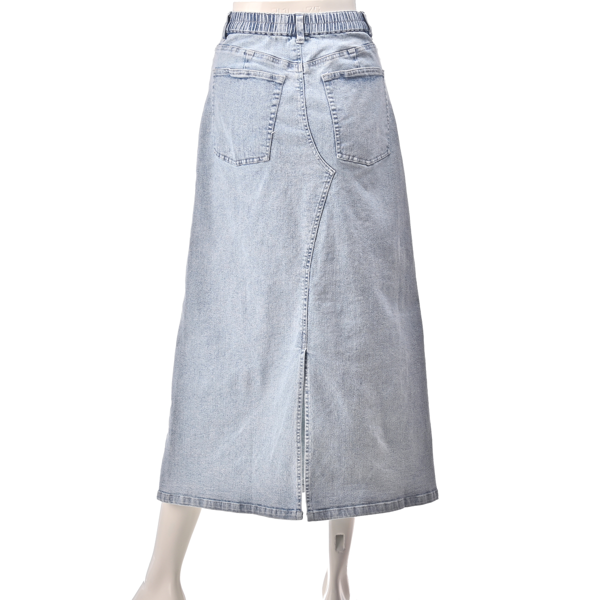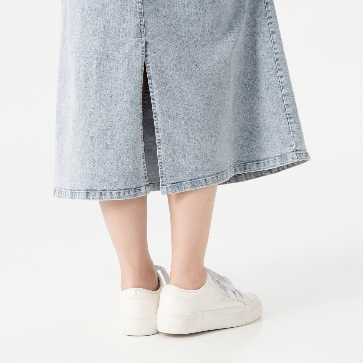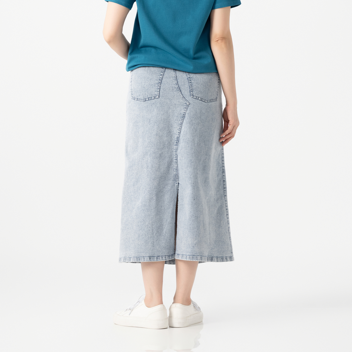 9ozのストレッチデニムを使用したAラインスカート。ヨコ伸びがあり、タテのスラブ感が特徴で、真冬以外一年中着用可能なしっかりとした生地感です