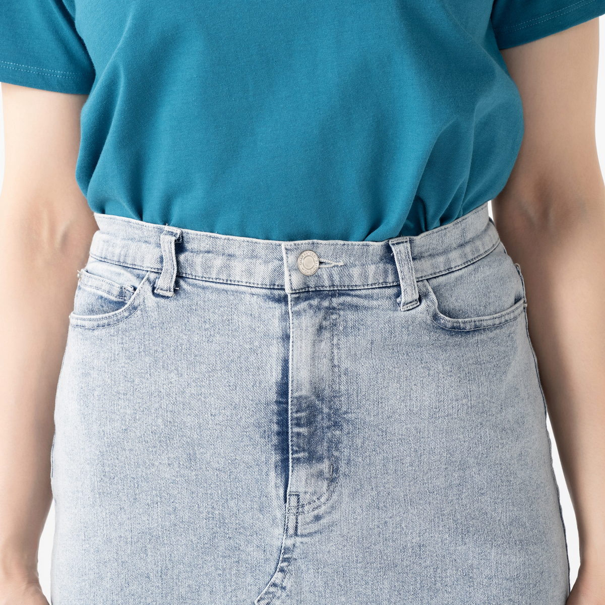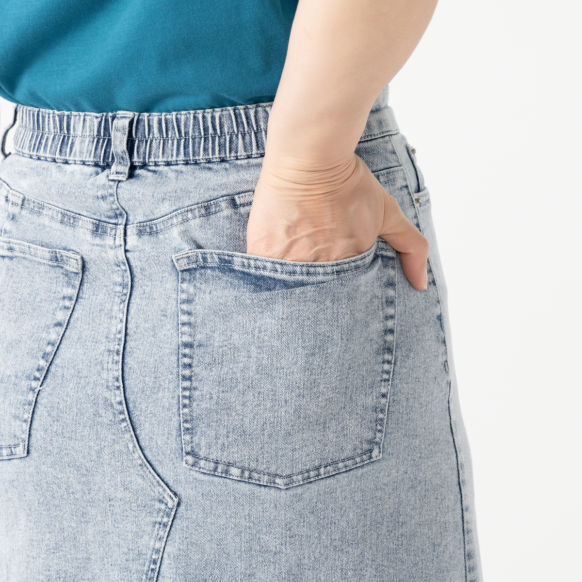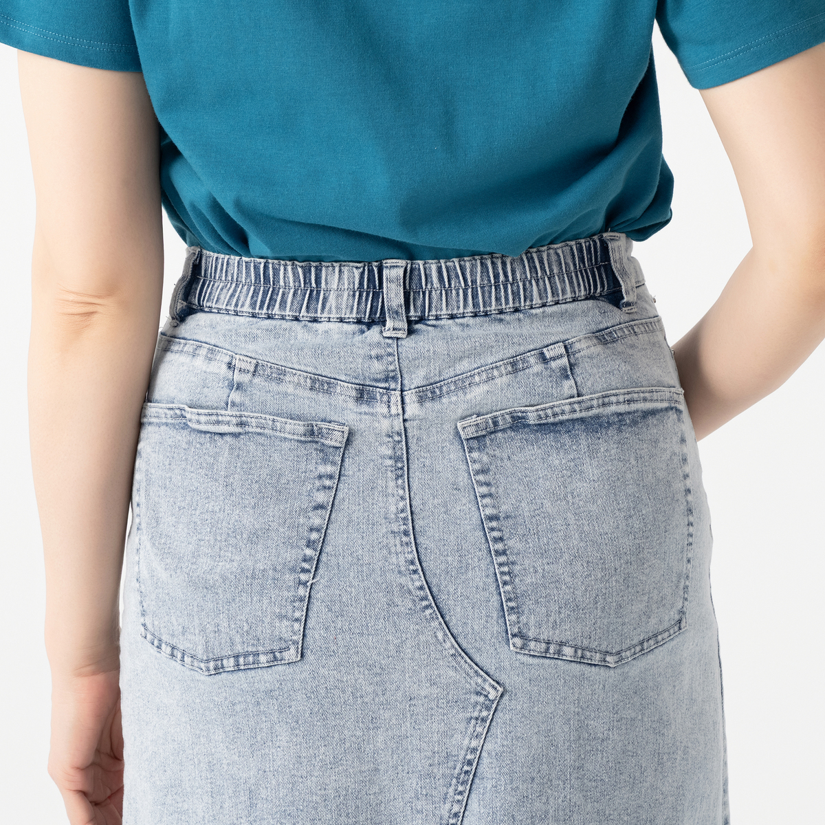 ウエストは後ろの一部にゴムを使用し、窮屈感の少ない着用感。前ファスナー開きでデニムパンツをリメイクしたようなデザインです