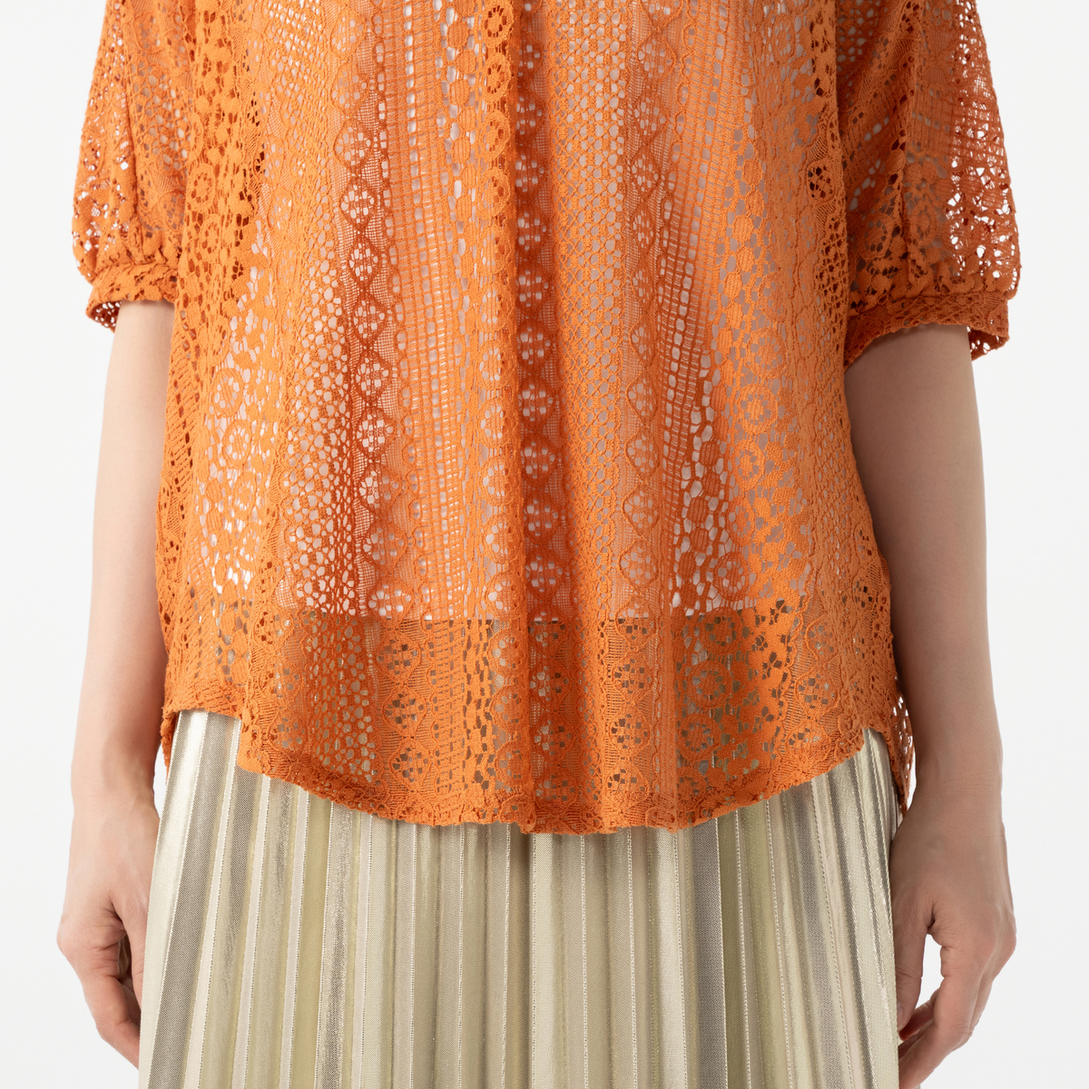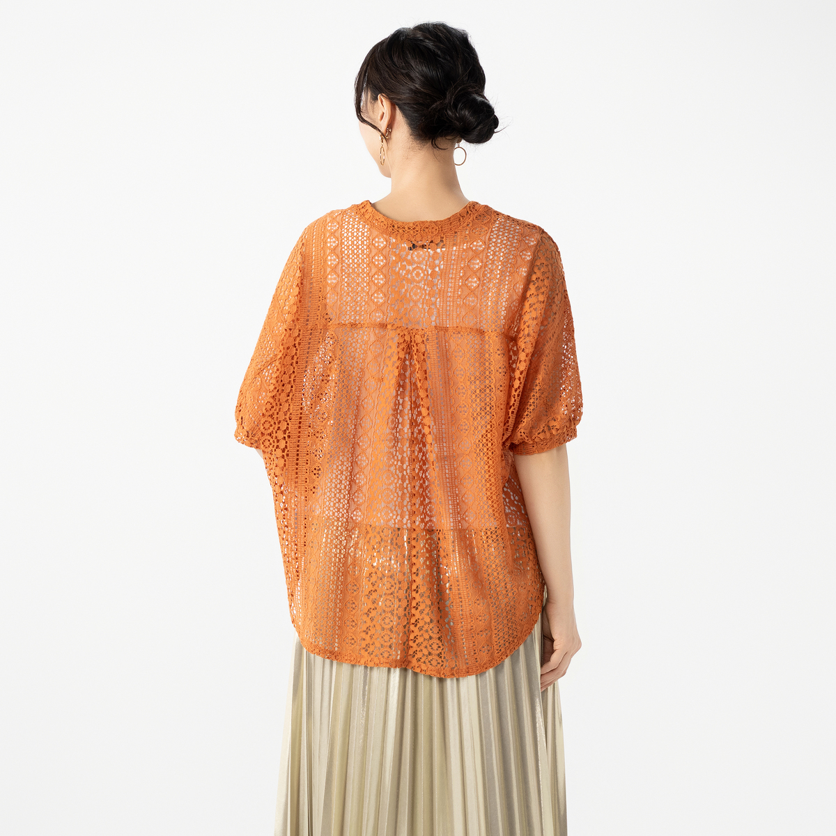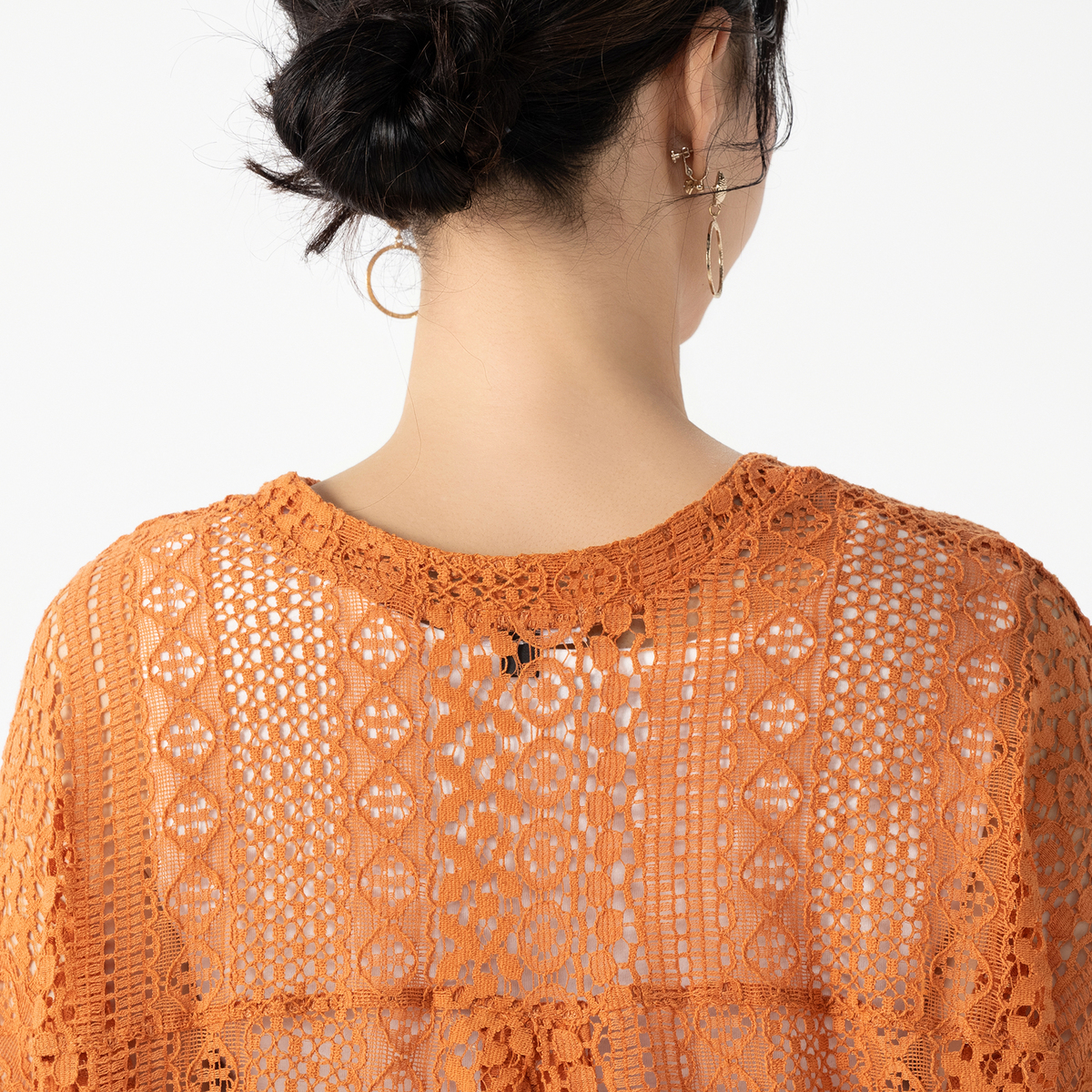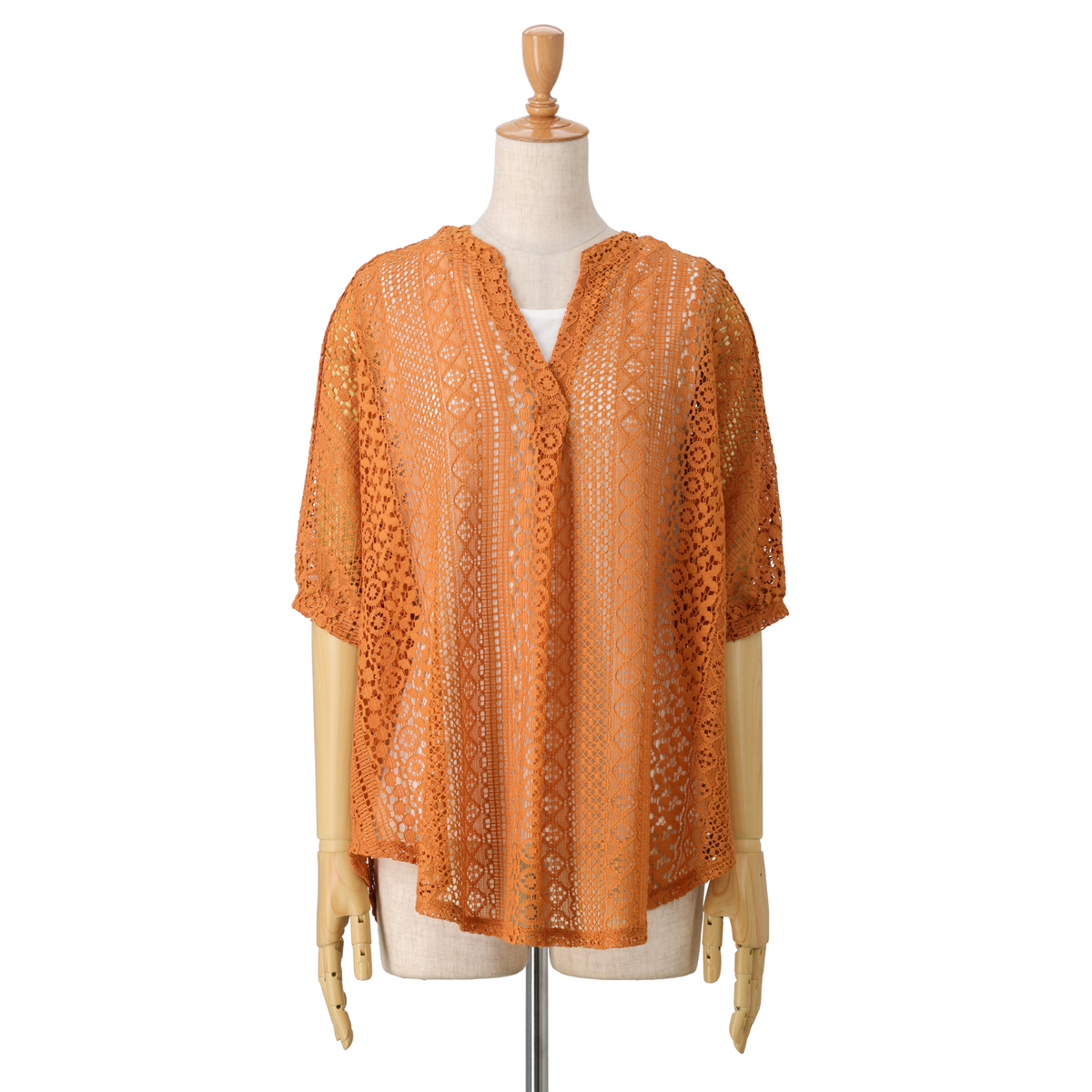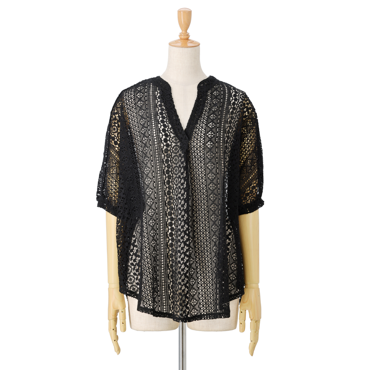 インナーのタンクトップはオフ色で、配色アウターのレース柄を引き立てるシンプルなデザイン。プルオーバーはドルマン袖のゆったりしたシルエット。深めのスキッパーで、お顔周りをシャープに見せます